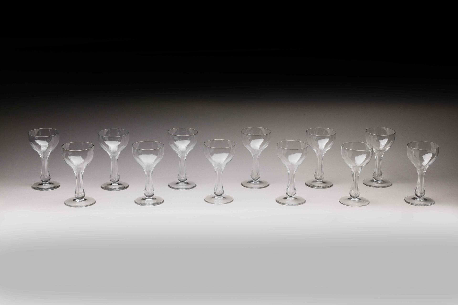 Rare suite de DOUZE COUPES à vin de Champagne type champenoises en verre soufflé. Pied creux taillé à pans.