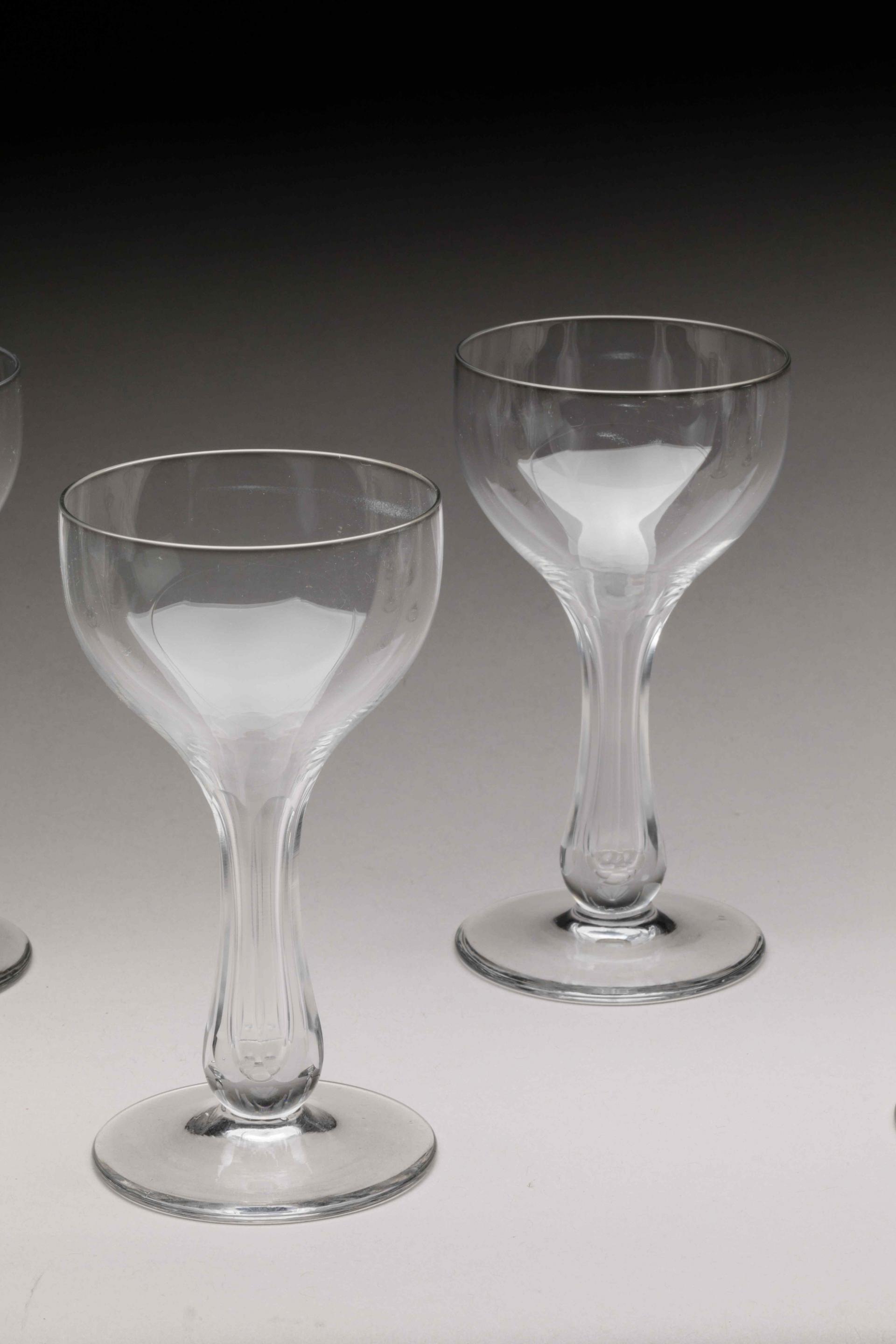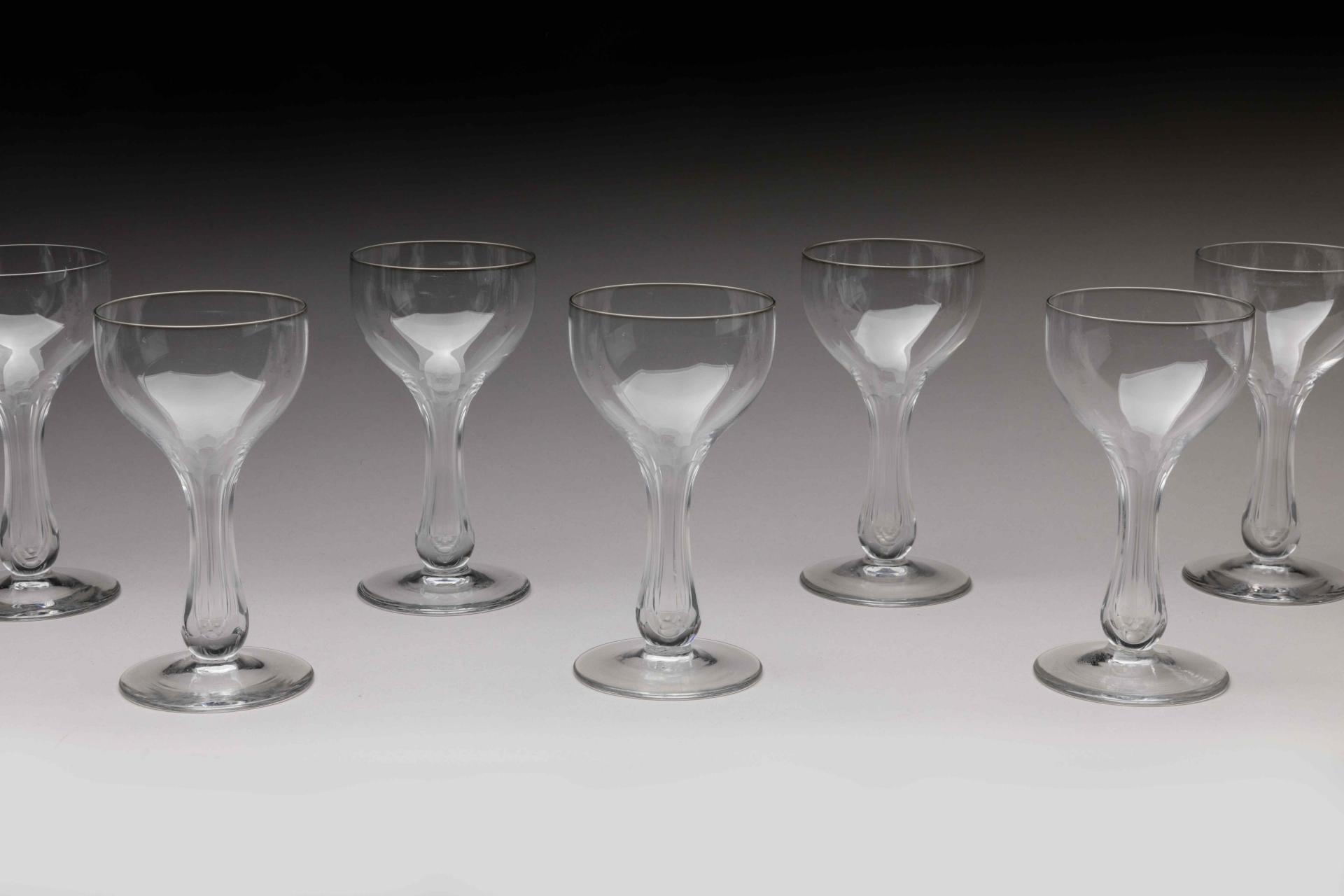 Rare suite de DOUZE COUPES à vin de Champagne type champenoises en verre soufflé. Pied creux taillé à pans. Vers 1900. Hauteur : 13,5 cm.