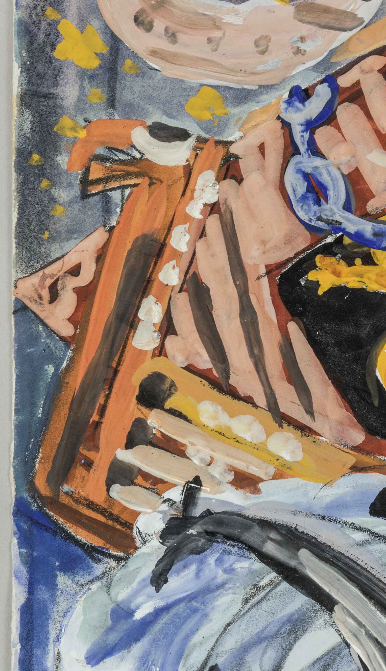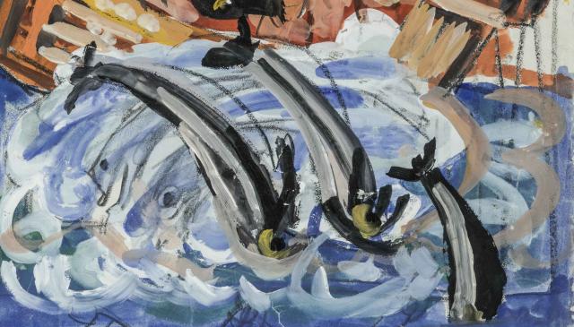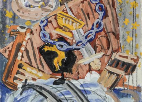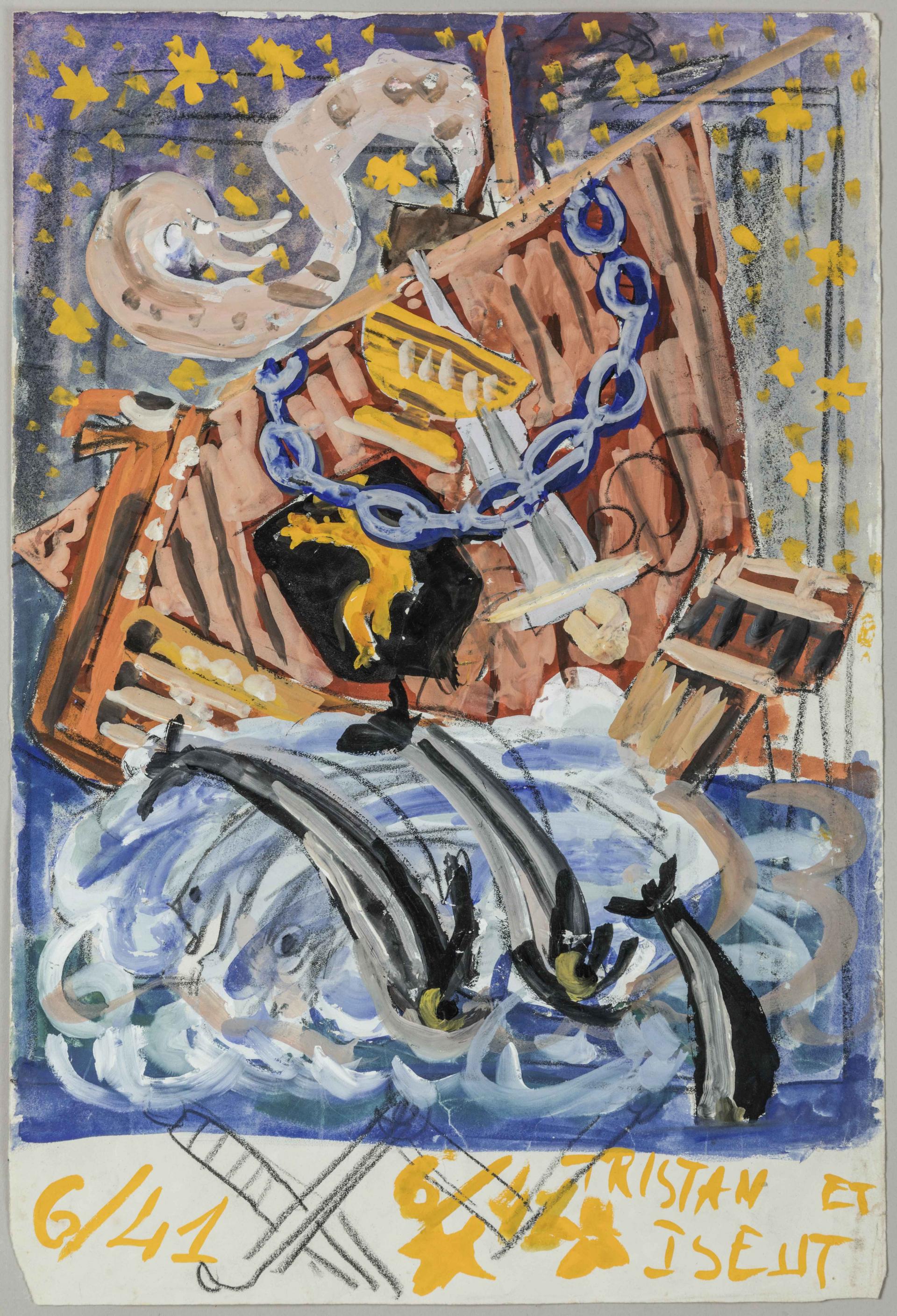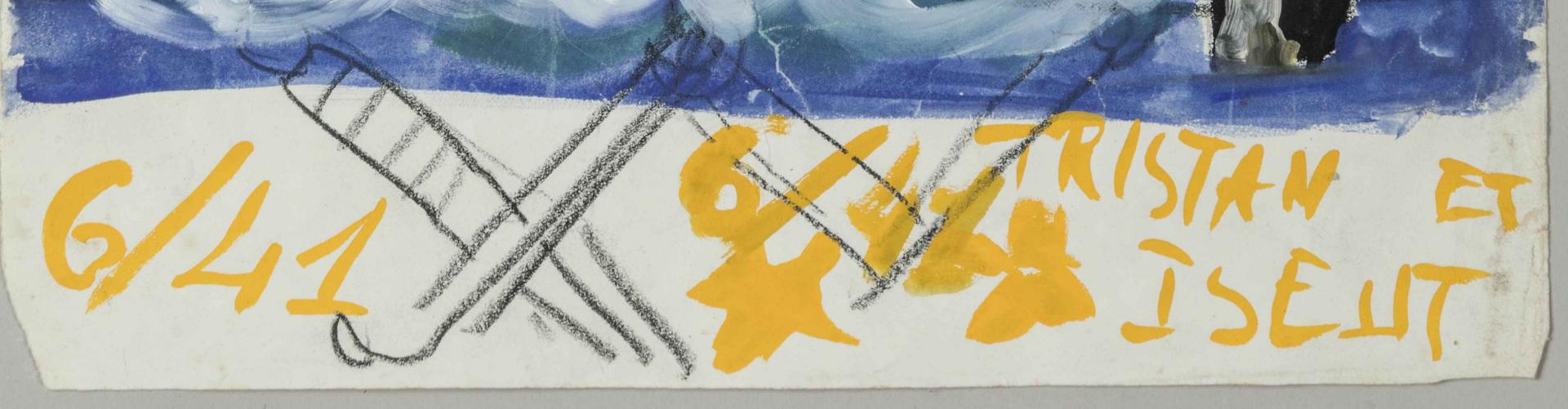 Ce travail préparatoire a probablement été réalisé pour le paquebot "Président Doumer", des Messageries Maritimes, dont le décor avait pour thème l'histoire de Tristan et Yseult. Notre gouache rassemble différents éléments emblématiques de ce mythe fondateur de l'amour courtois : le navire d'Iseult, le dragon combattu par Tristan, son épée, la coupe de l'élixir d'amour.