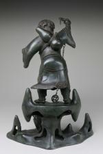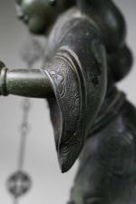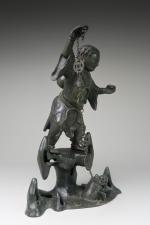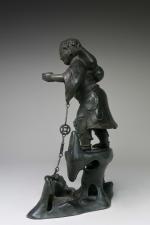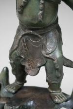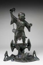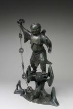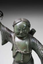 Grande statue de Liu Hai en bronze à patine brune, debout...