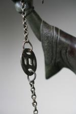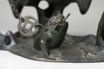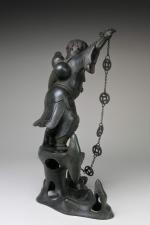 Grande statue de Liu Hai en bronze à patine brune, debout sur un socle en forme de rocher tenant une ligature de sapèques, son crapaud sortant de l'eau.