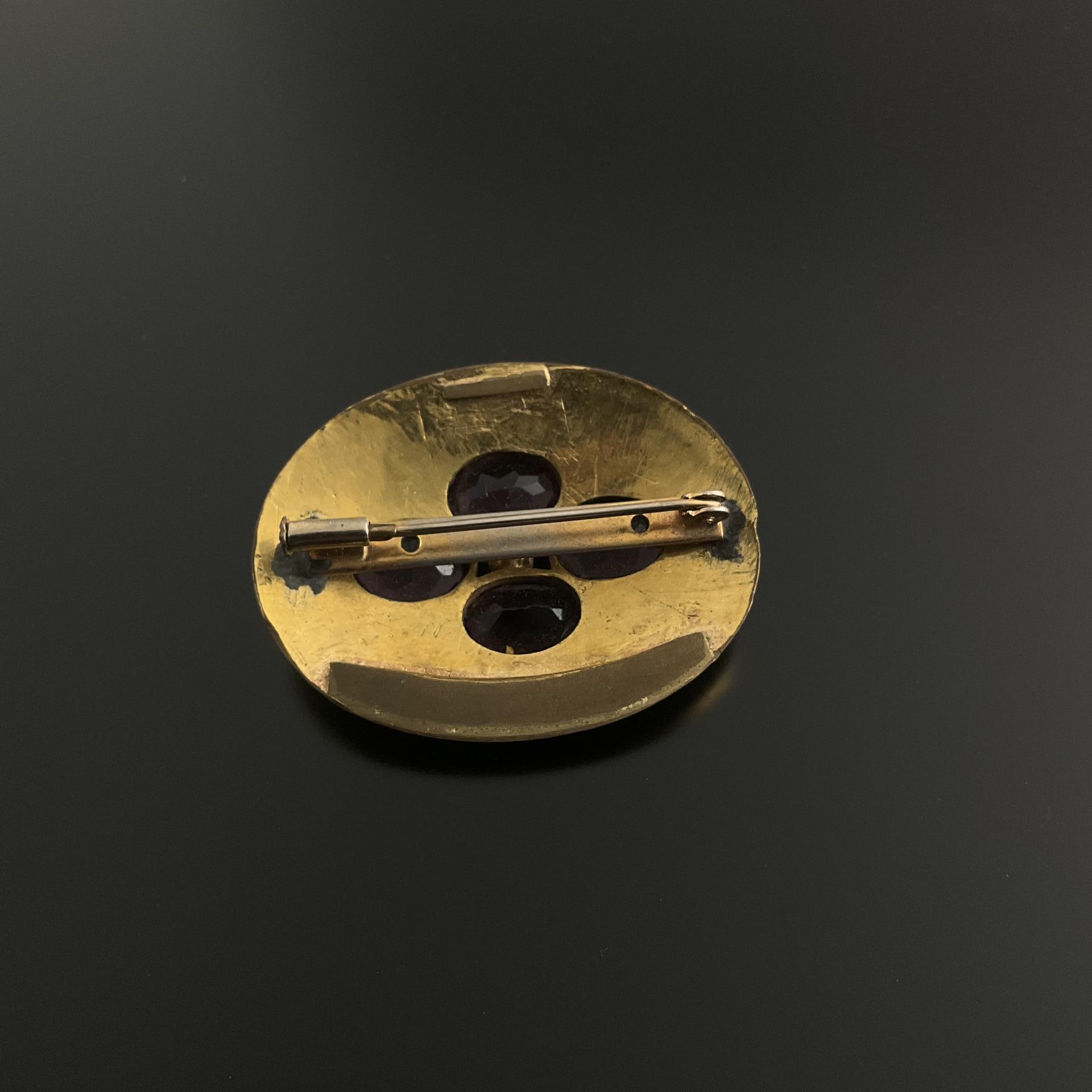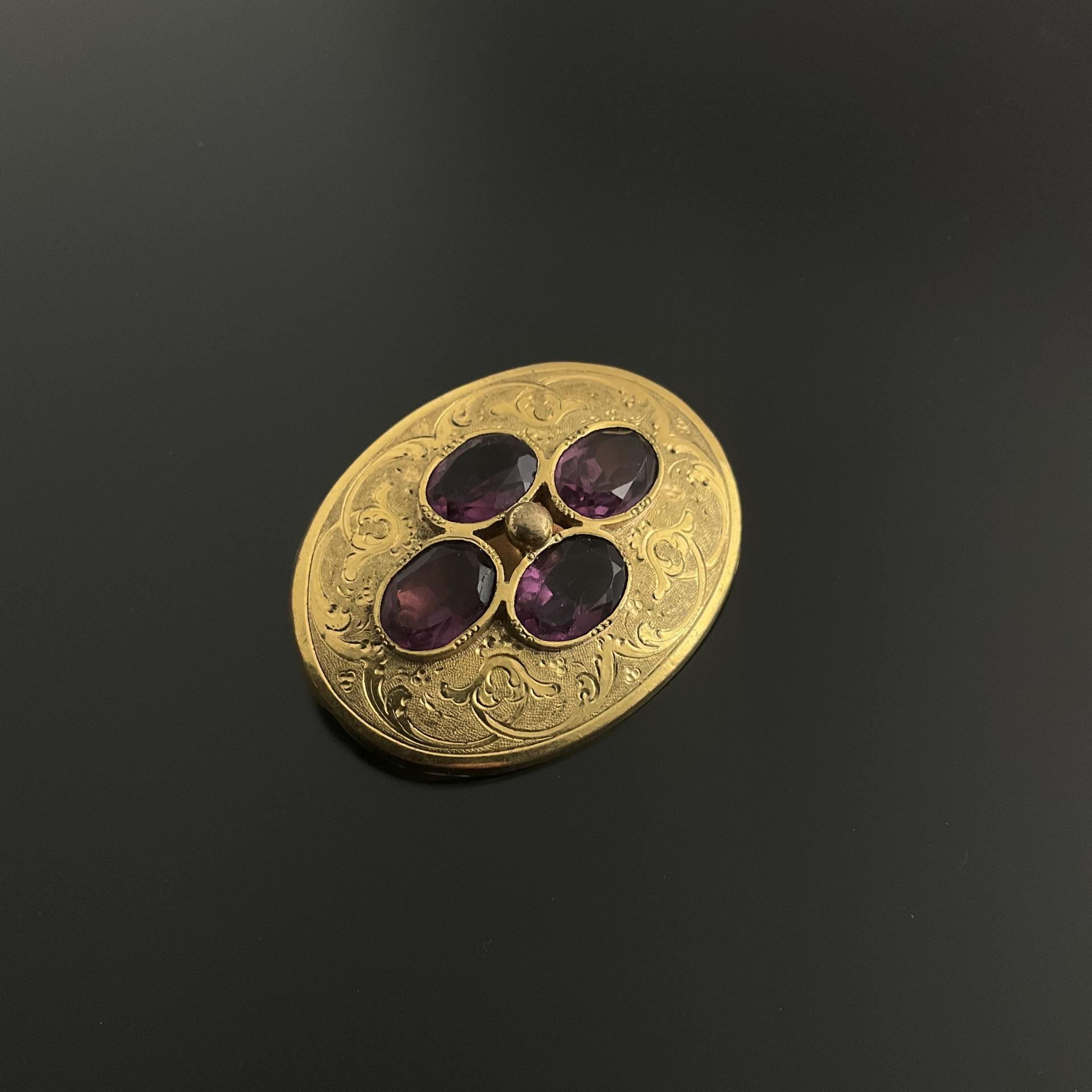 BROCHE de forme ovale en métal doré ornée de quatre améthystes taille ovale. Les fonds gravés de rinceaux.
