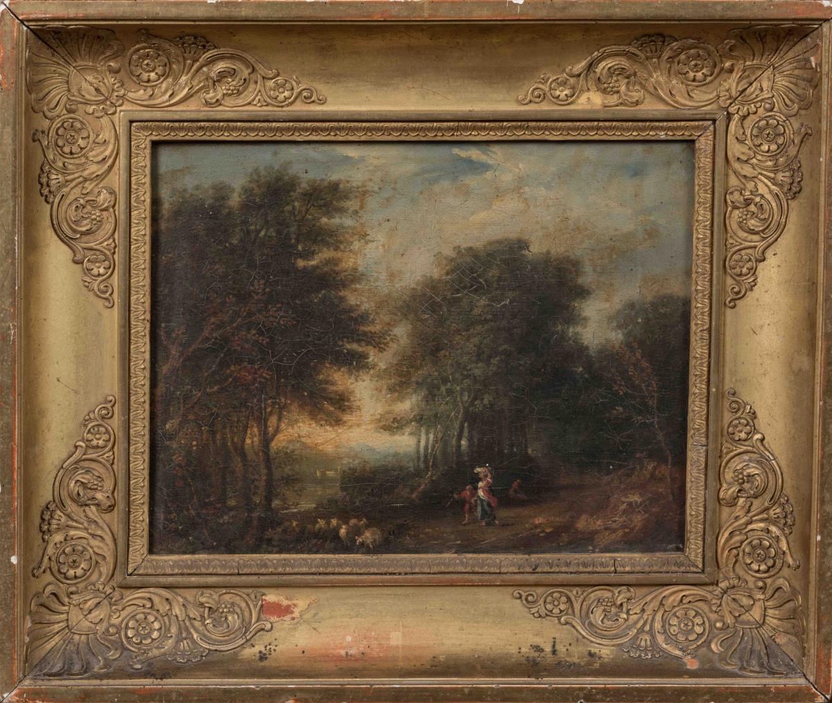 Présenté dans un cadre à palmettes en bois doré du début du XIXe siècle.