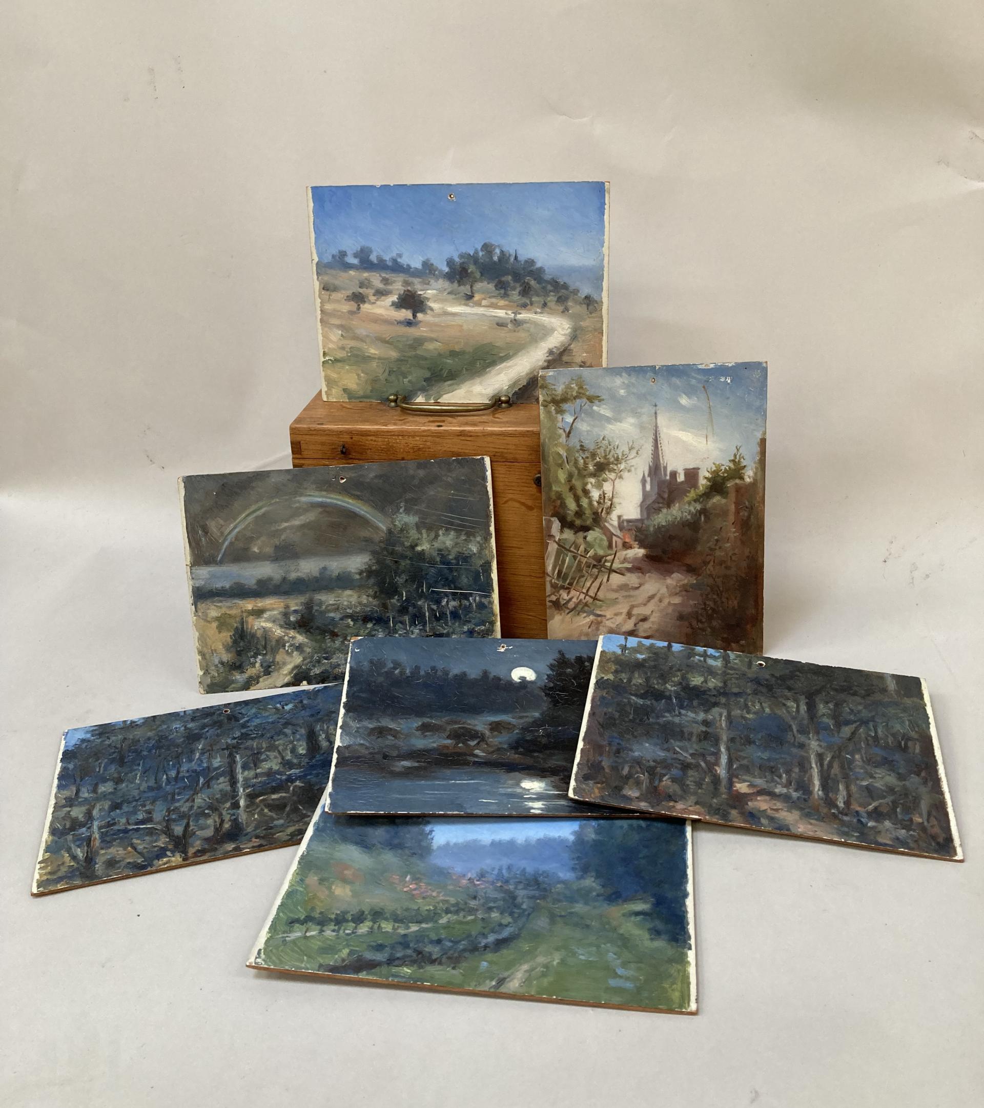 Suite de sept huiles sur panneau, certaines monogrammées en bas à droite.