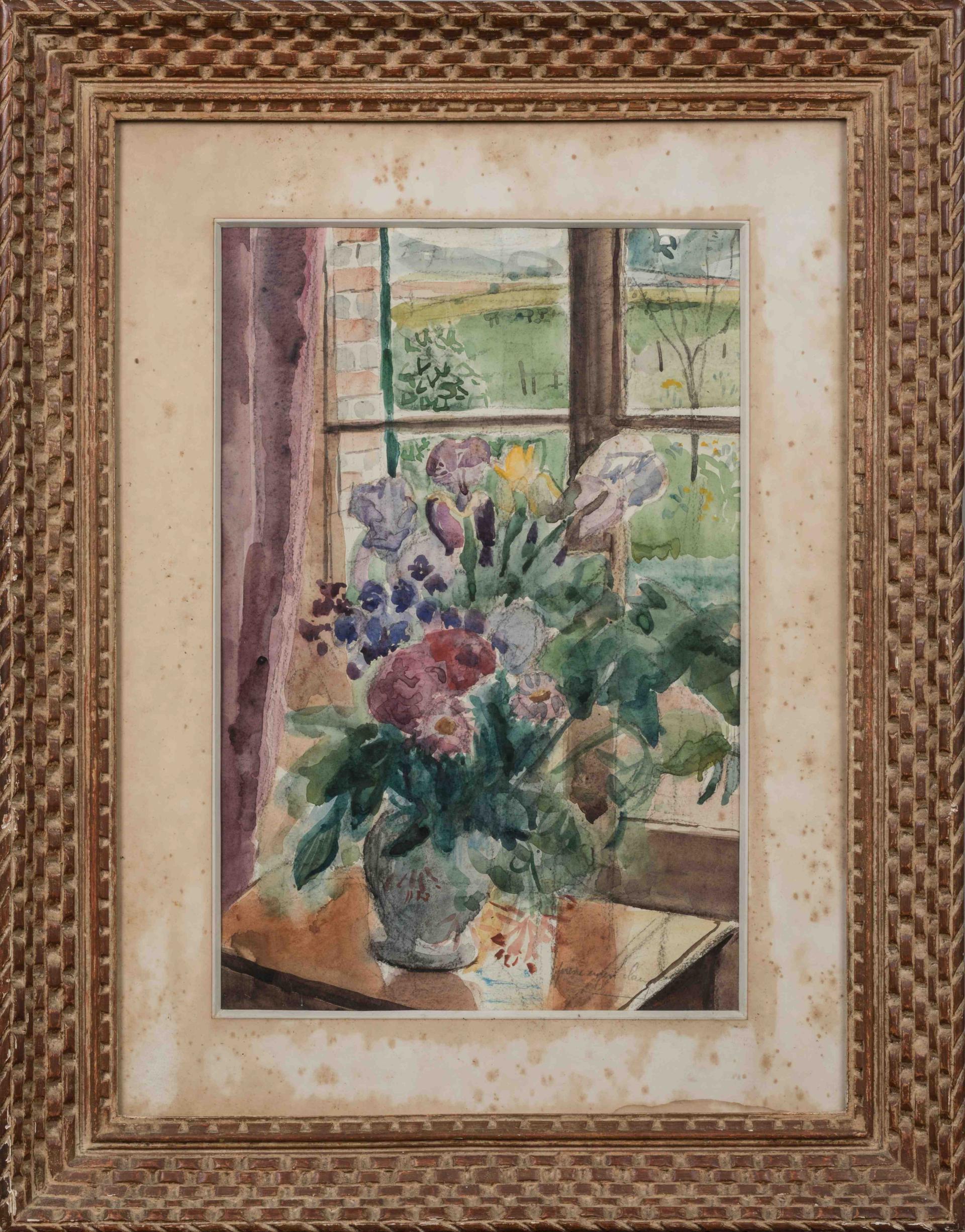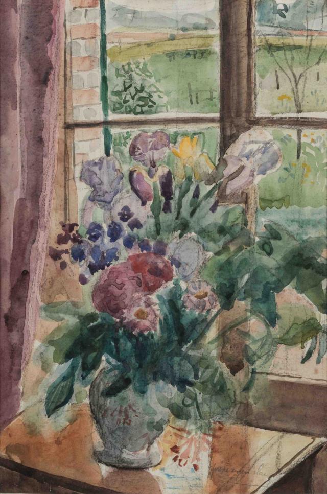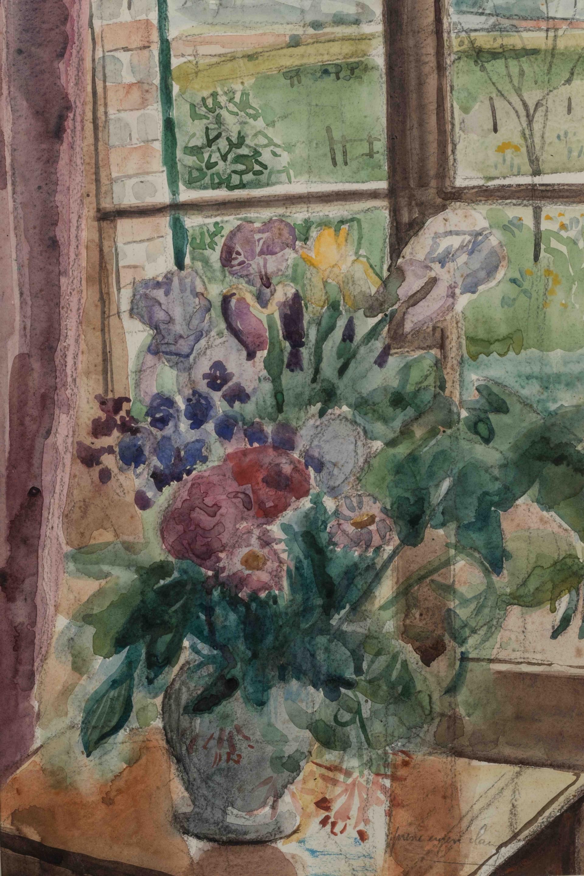 Vase de fleurs devant la fenêtre.