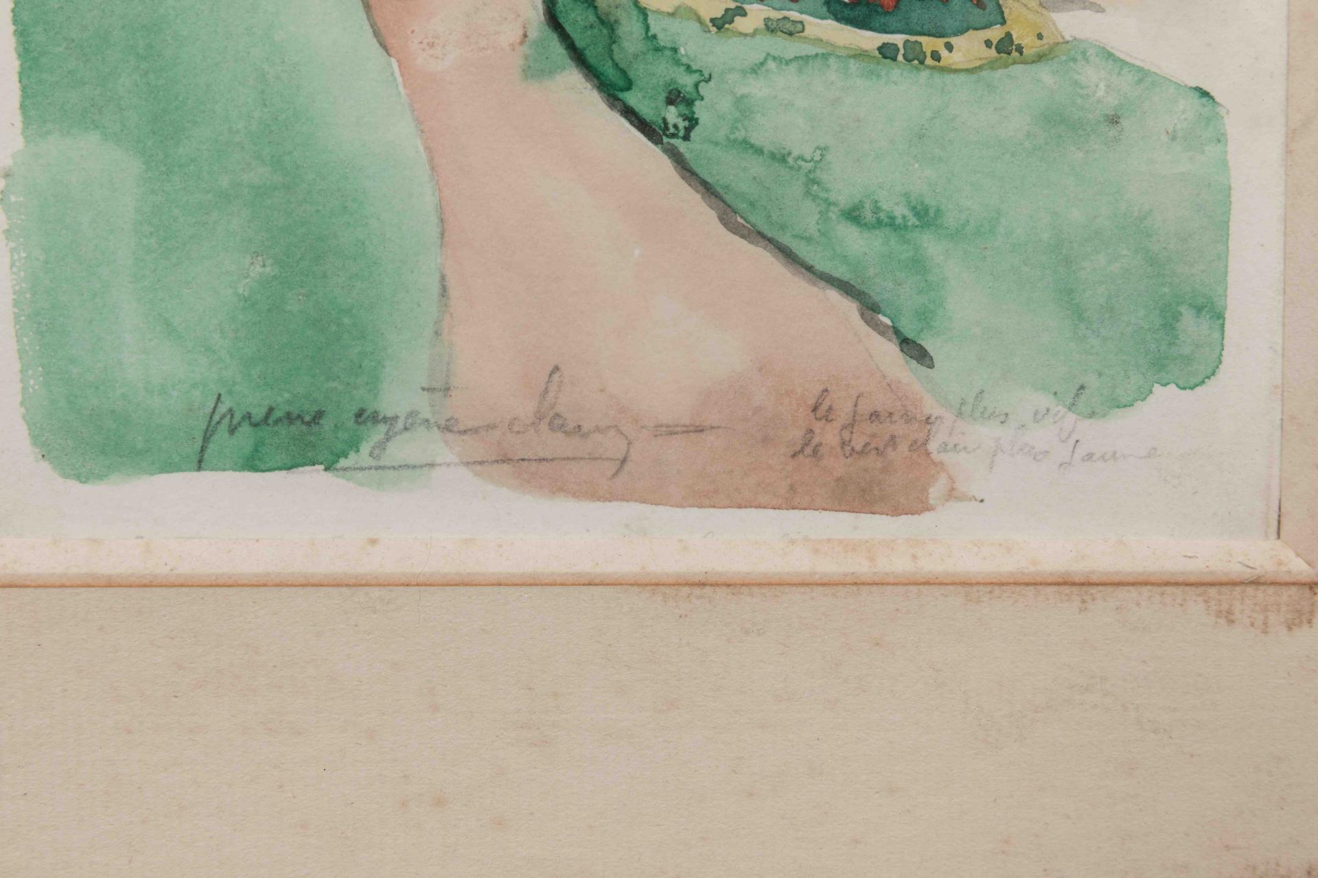 Aquarelle et fusain signée en bas à gauche et annotée "le jaune plus vif / le vert clair plus jaune" en bas à droite.
