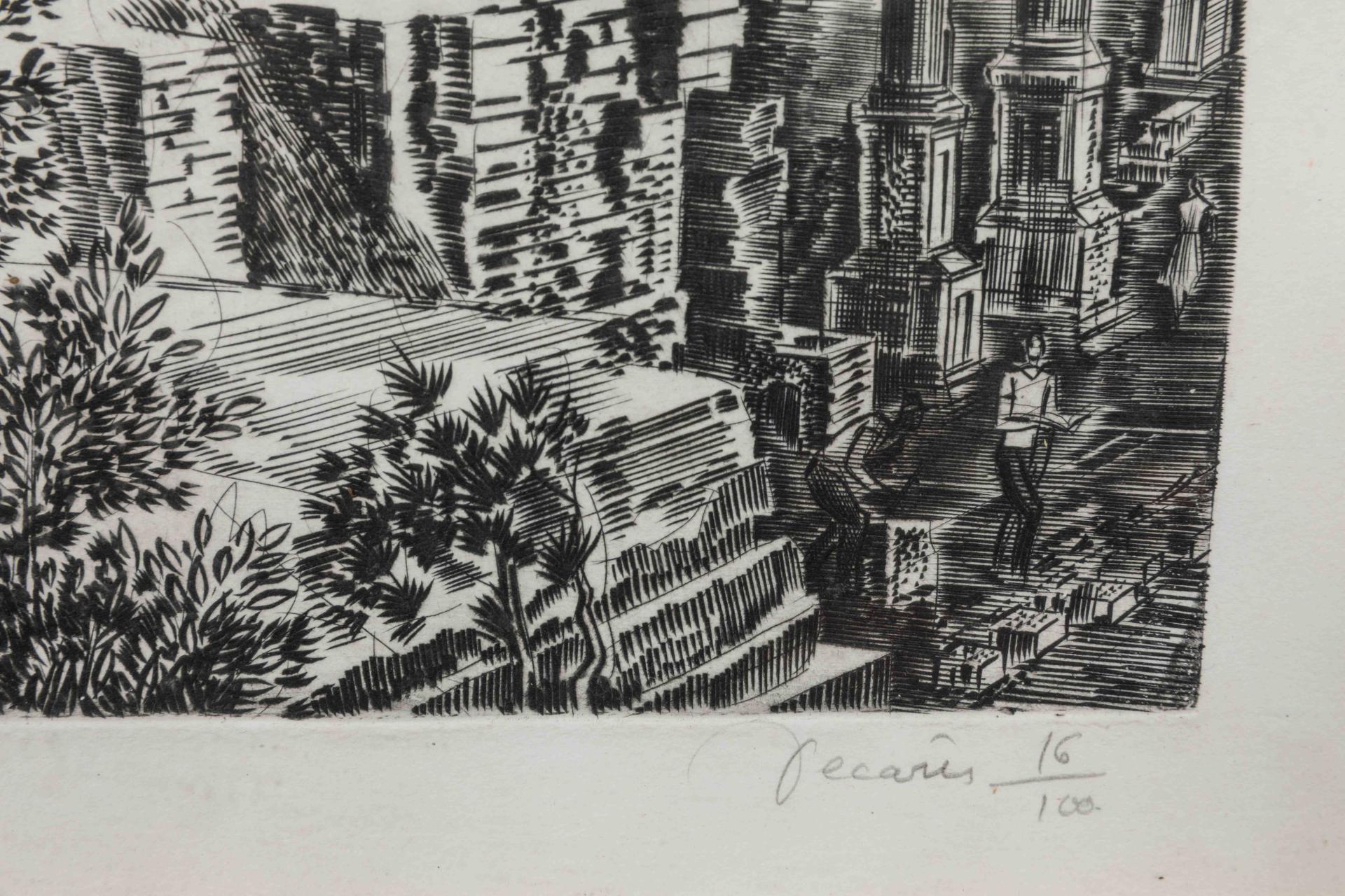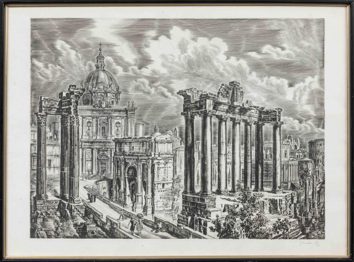 Albert DECARIS (Sotteville-lès-Rouen, 1901 - Paris, 1988) Rome, vue animée du Forum. Xylogravure...