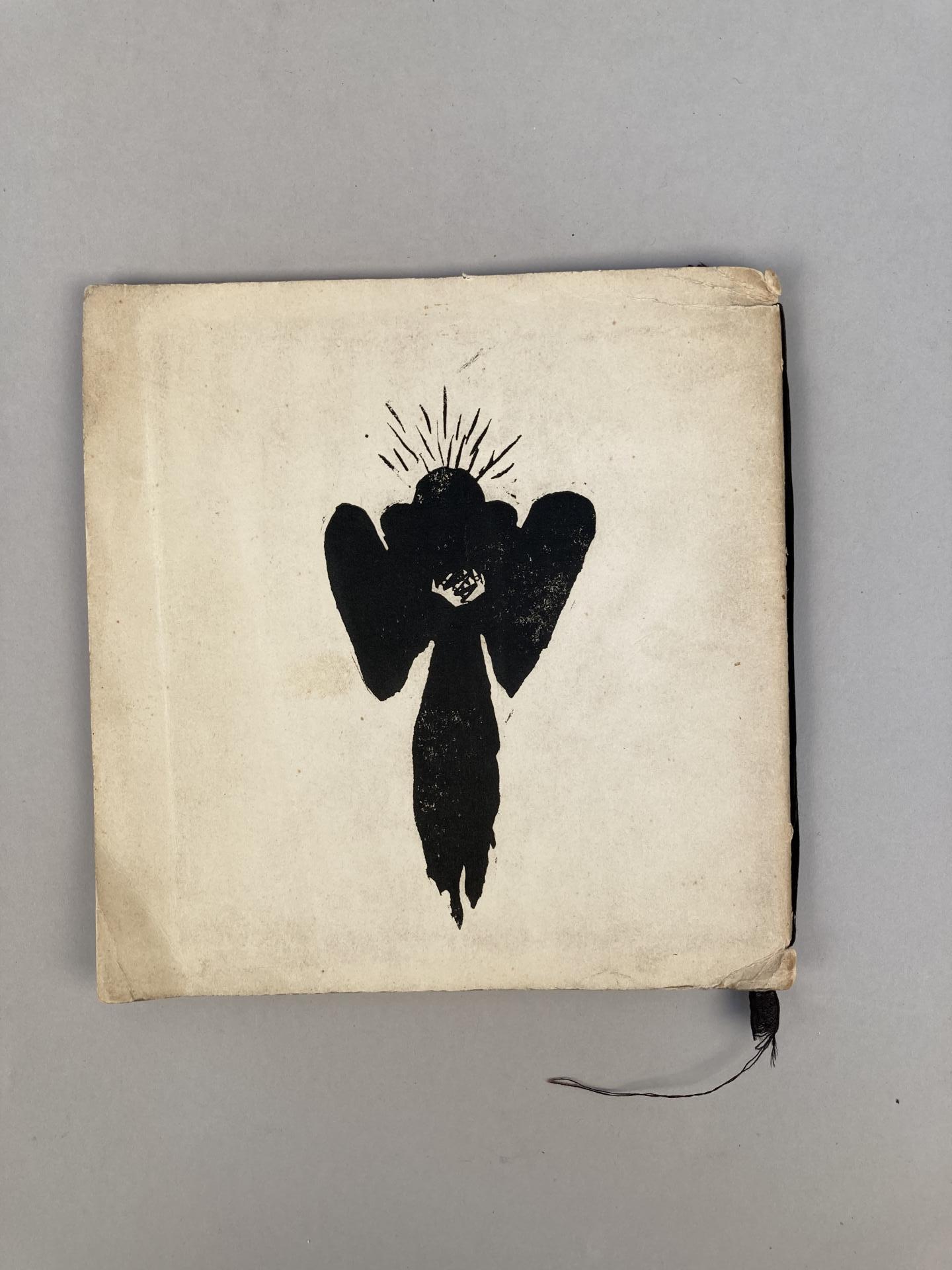 In-8 carré (corps d'ouvrage : 163 X 163 mm. Couvertures illustrées : 190 X 180 mm), broché. 24 pages non chiffrées, soit 12 feuillets agrafés, et liés par un cordon de soie bleue. (Bord des couvertures froissé ; manque circa 1 cm2 dans l'angle inférieur de la première de couverture. Légère trace de rouille laissée par une agrafe, au verso de la couverture.