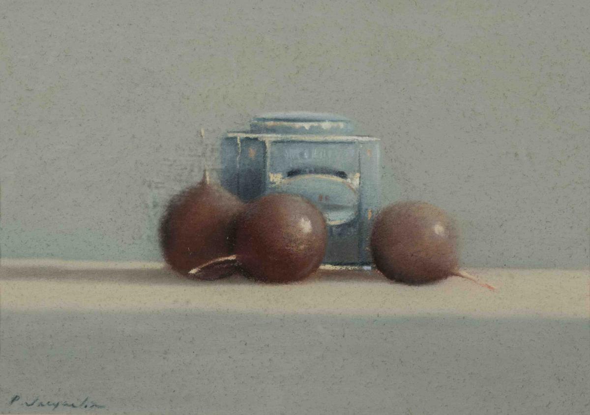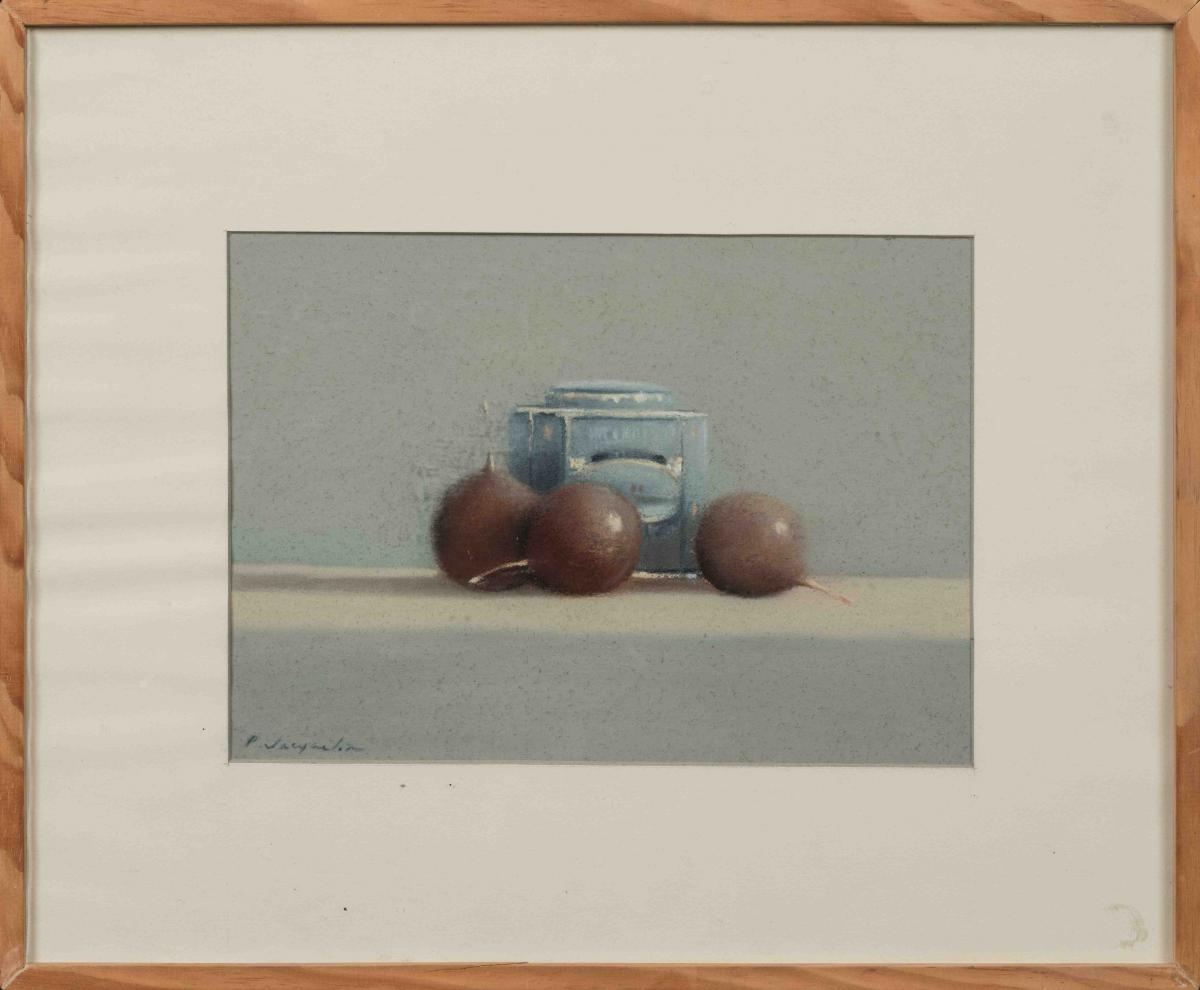 Pierre JACQUELIN (1944)Nature morte aux prunes et à la boîte de thé.Pastel signé en bas...