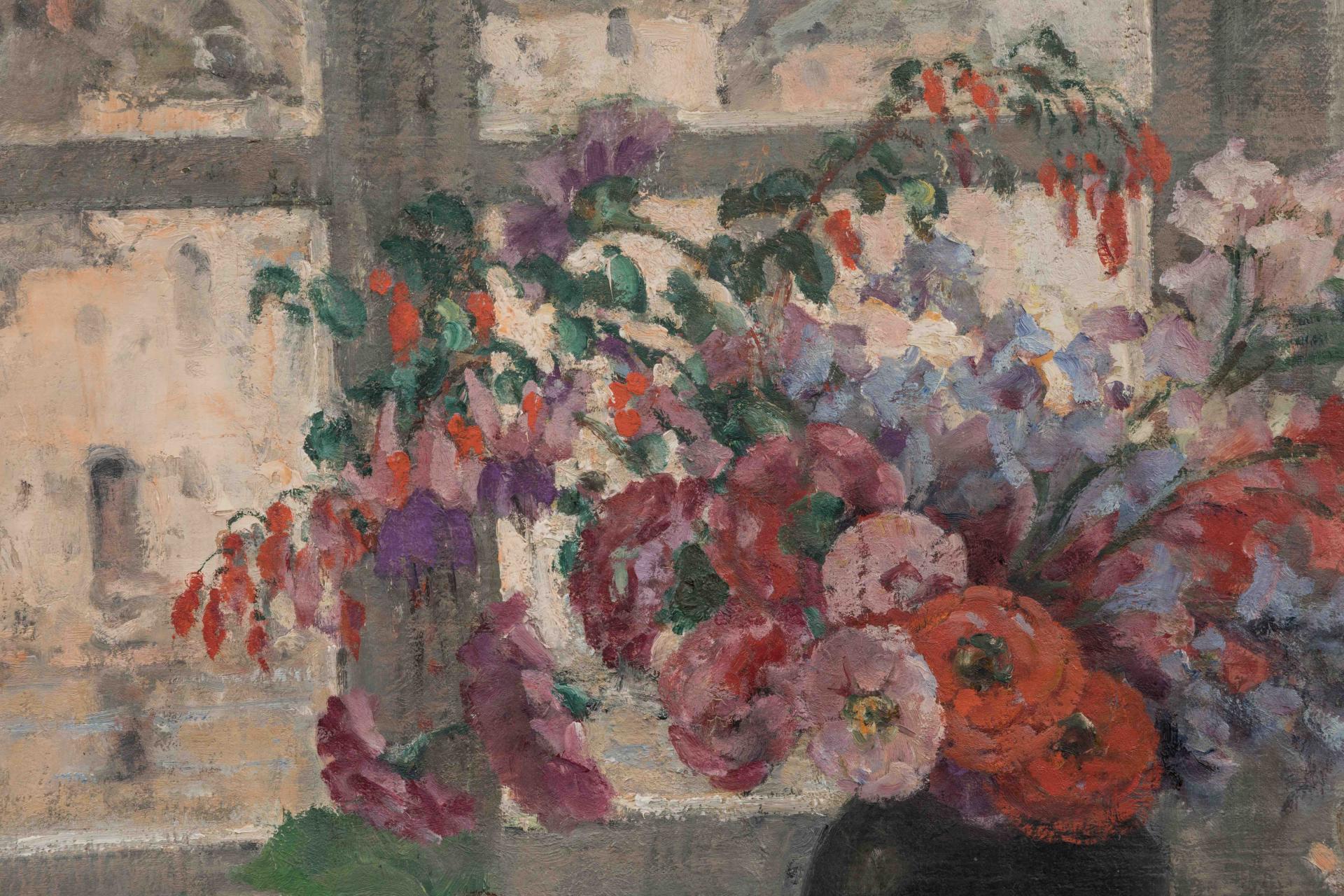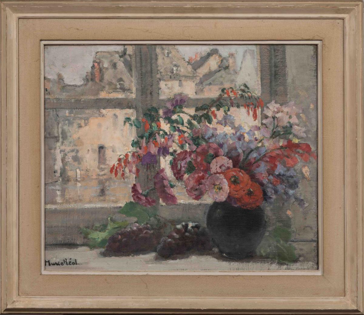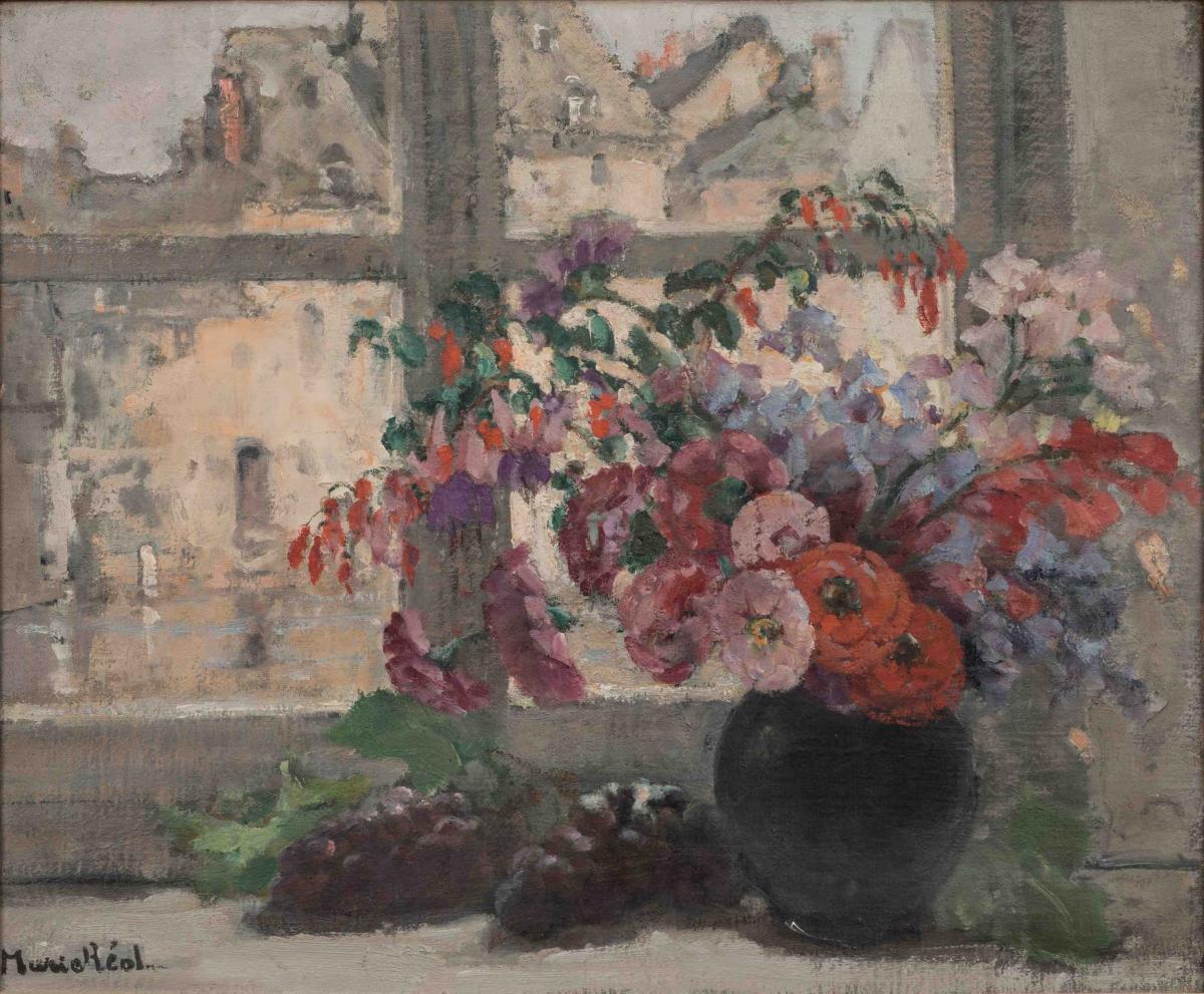 Marie-Marguerite REOL (Massiac, 1880 - Ploaré, 1963)"Bouquet dur ma fenêtre à Espalion". Huile sur toile...