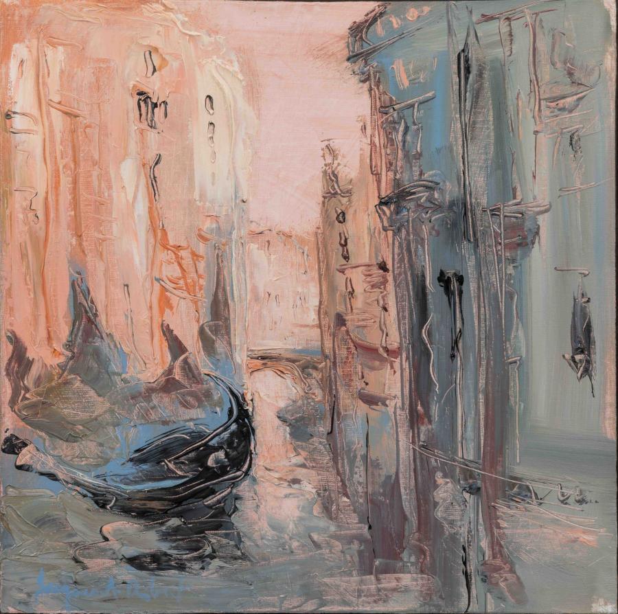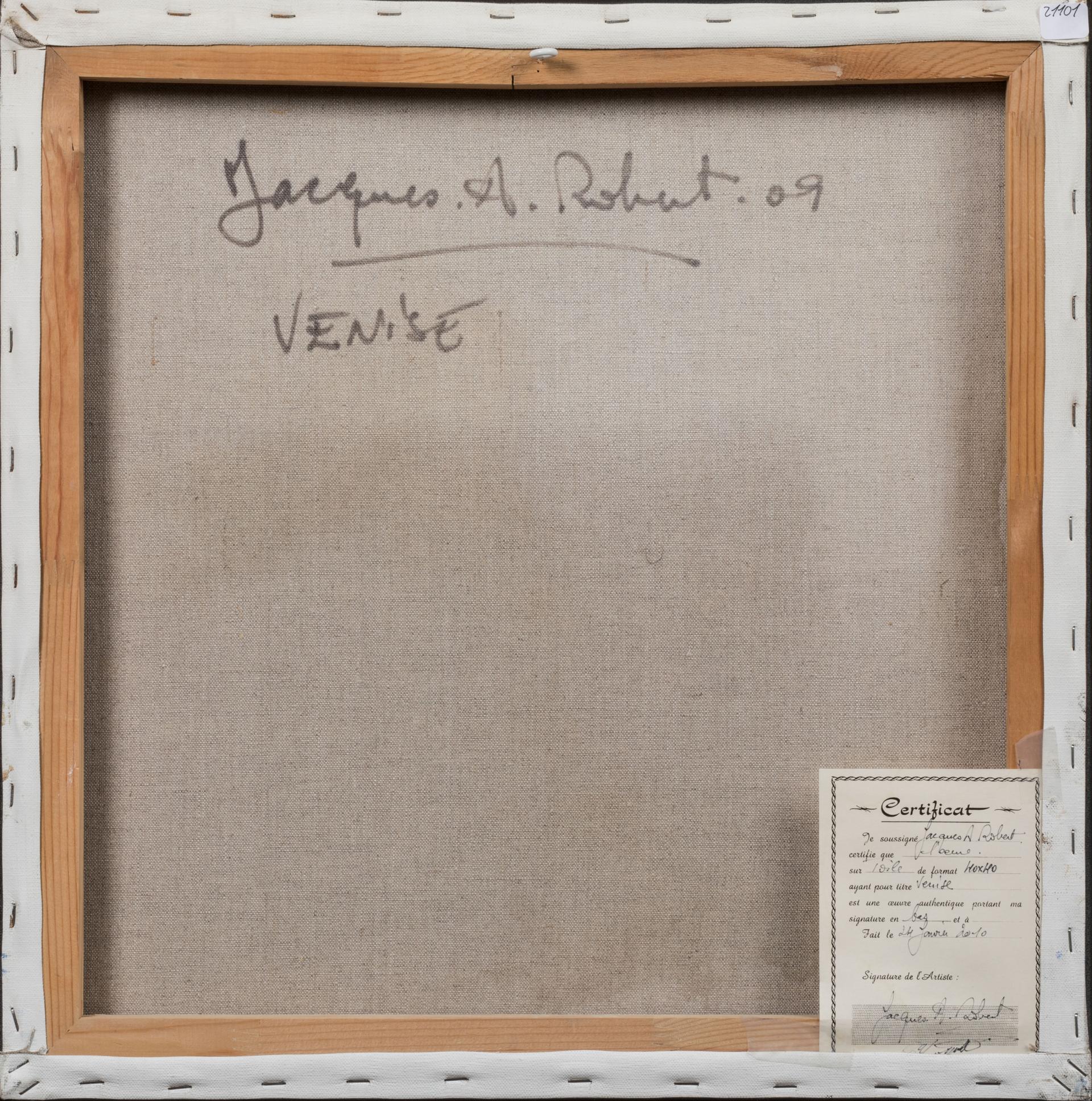 Jacques A. ROBERT (1944)"Venise".Huile sur toile signée en bas à gauche. Titrée et datée 09 au dos. Hauteur : 40 cm. Largeur : 40 cm.