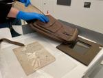Elle ouvre deux boîtes, en sort les objets, les manipule soigneusement avec des gants. On y trouve six plaques de verre photographiques inédites où figure Mathurin Méheut sur le front, en uniforme, ainsi qu’une plaque où on le voit avec sa femme et sa fille. À côté, un porte-cartes en cuir contenant sa pochette à parois quadrillée présente des taches de peinture à l’intérieur. Un couvre-chef en cuir doublé, vraisemblablement porté lors de reconnaissances aériennes fait aussi partie du lot, ainsi qu’une lettre.