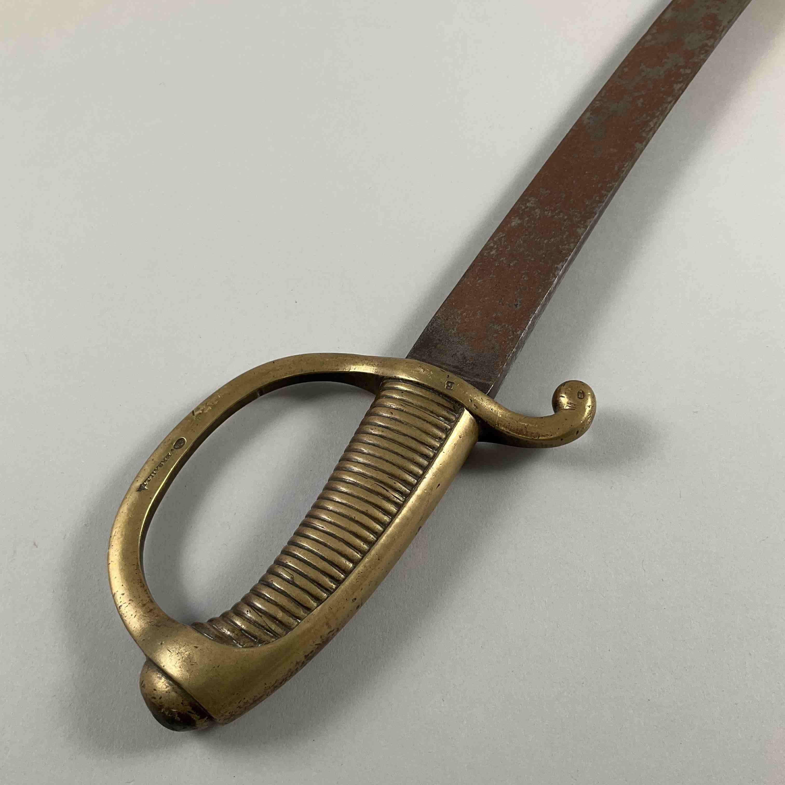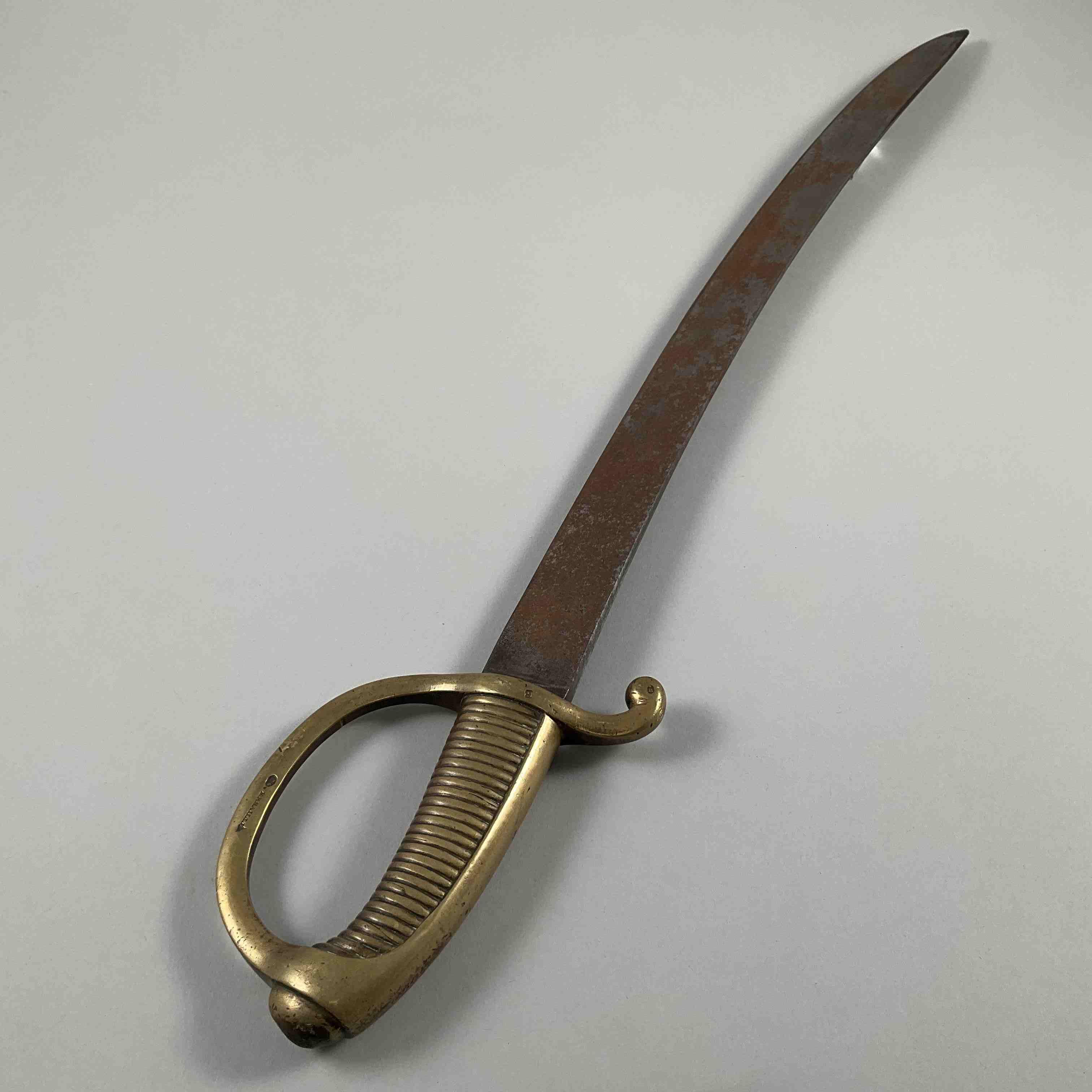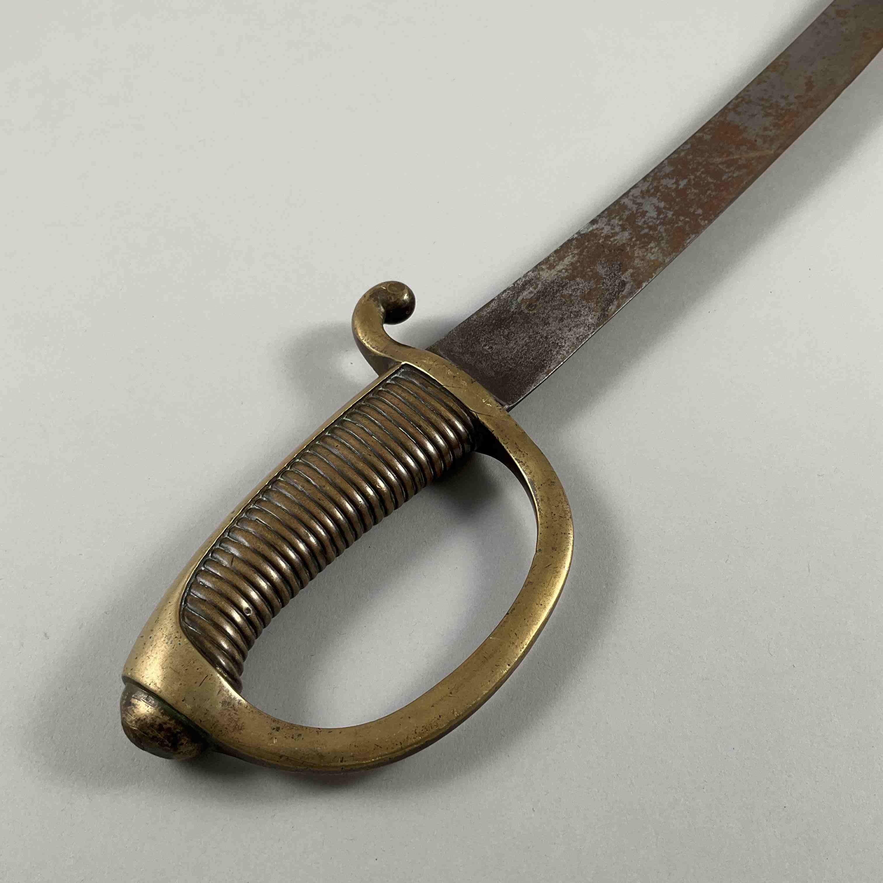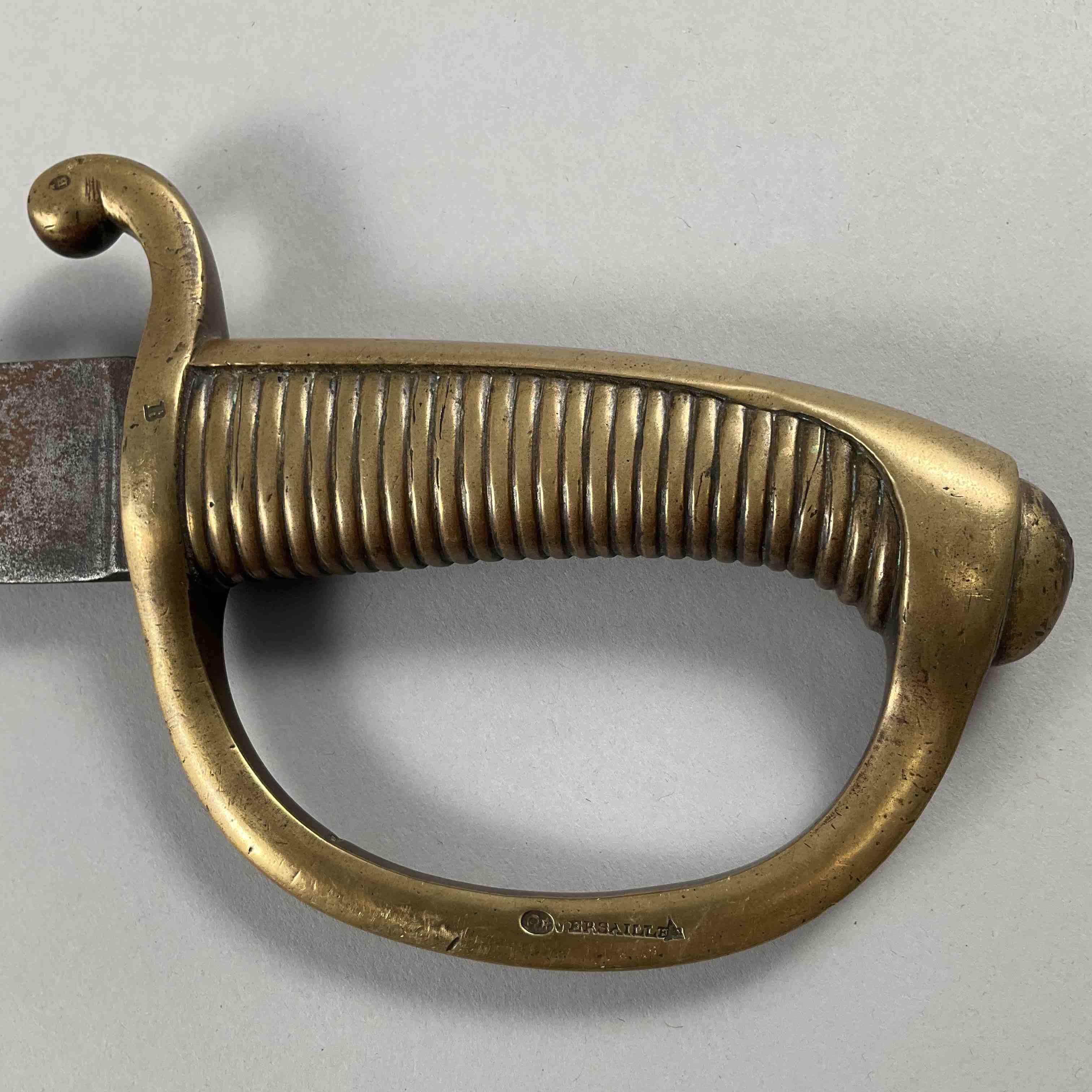 SABRE D'INFANTERIE dit BRIQUET, modèle An XI. Monture en laiton marquée "Versailles" et poinçonnée. Lame signée de la manufacture royale du Kligenthal et datée du 9 octobre 1814, poinçonnée (oxydation).