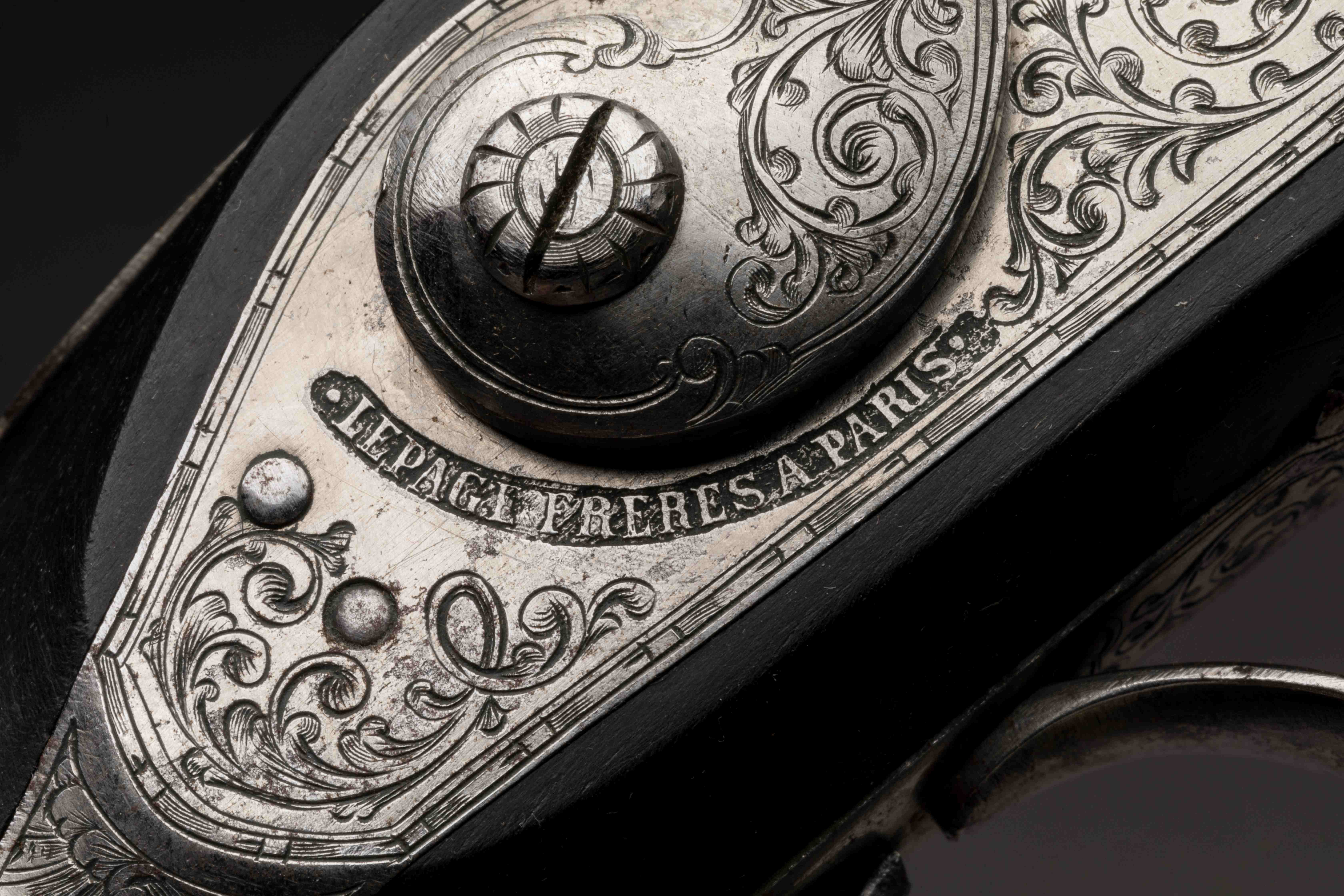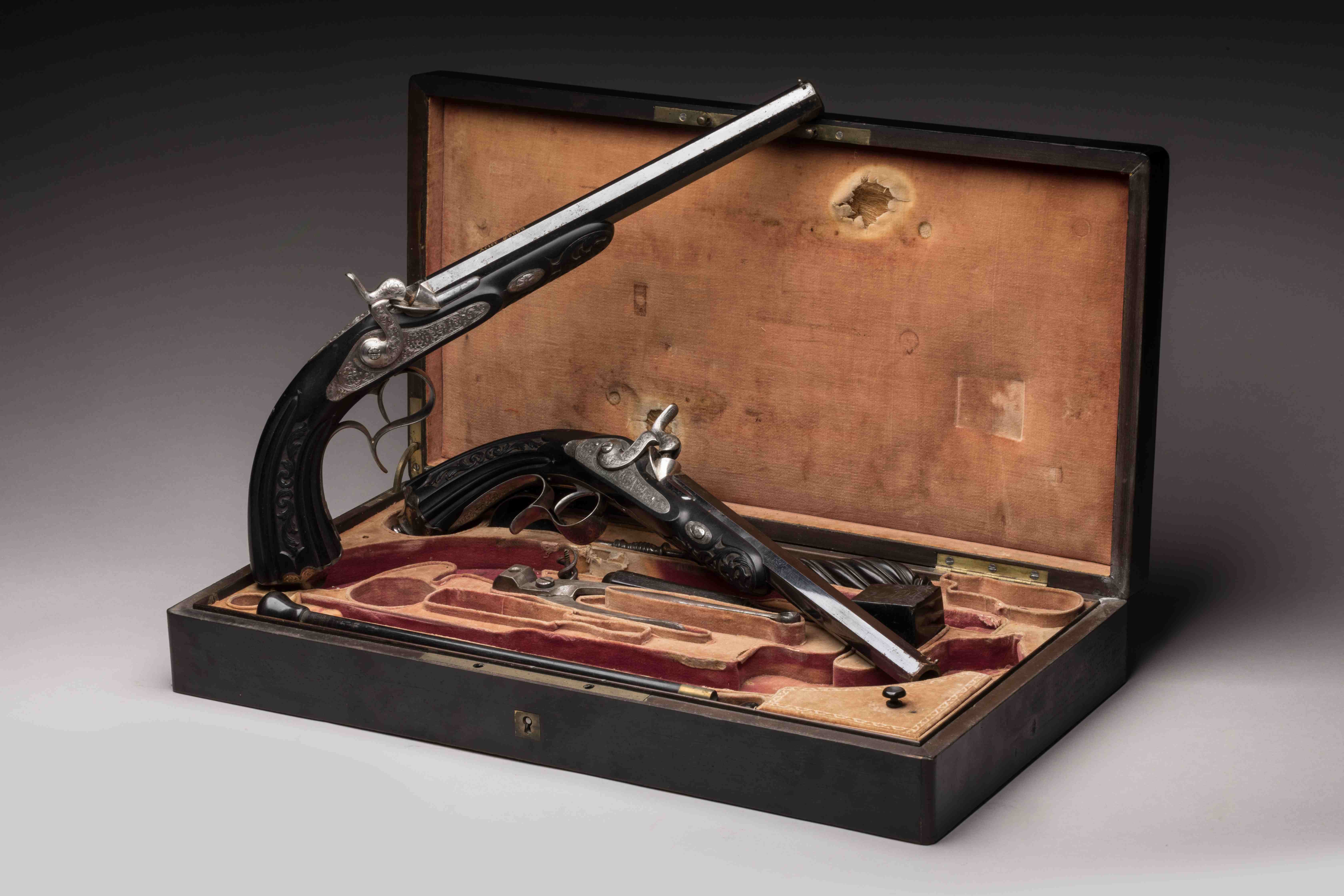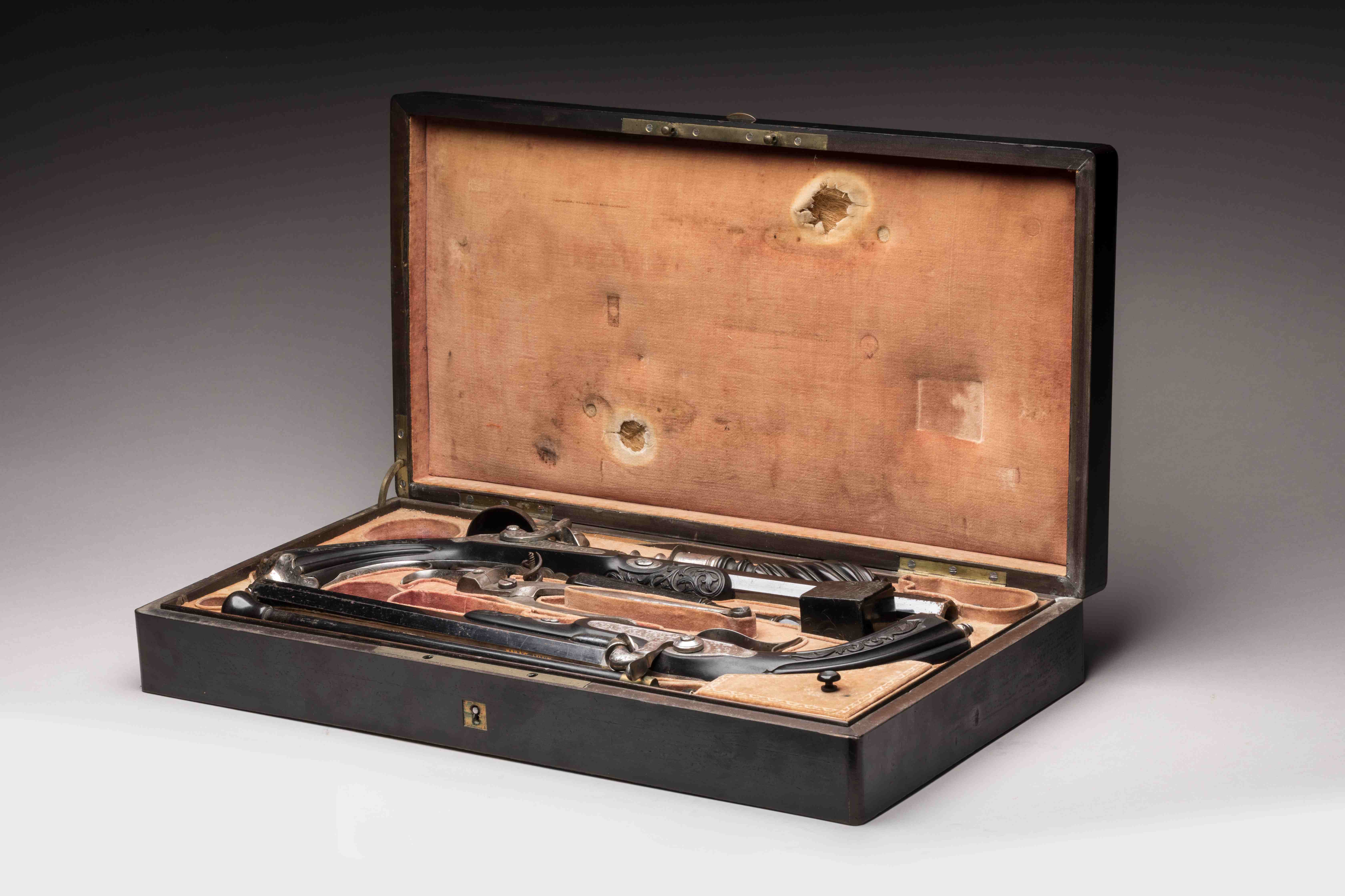 CASSETTE-NECESSAIRE contenant une PAIRE DE PISTOLETS DE DUEL à percussion par LEPAGE Frères. Canons octogonaux bleuis et marqués à l'or sur le pan supérieur : "Acier fondu". Platines, chiens, pontets à repose-doigt et calottes à toupie en fer finement gravés de rinceaux et coquilles. Crosses cannelées et fûts en ébène sculptés de feuillages. Signés sur la platine "Lepage Frères à Paris". Mécanismes fonctionnels. La cassette en placage d'ébène marqueté de filets de laiton est centré d'un cartouche monogrammé "FF". Il contient, sur un montage à la française garni de velours : louche à plomb à manche en ébène torsadé, moule à balles, baguette de bourrage, maillet (accidenté), louche à poudre, baguette de nettoyage, tire-bourre, deux cheminées de rechange et quelques balles. Avec sa clef.