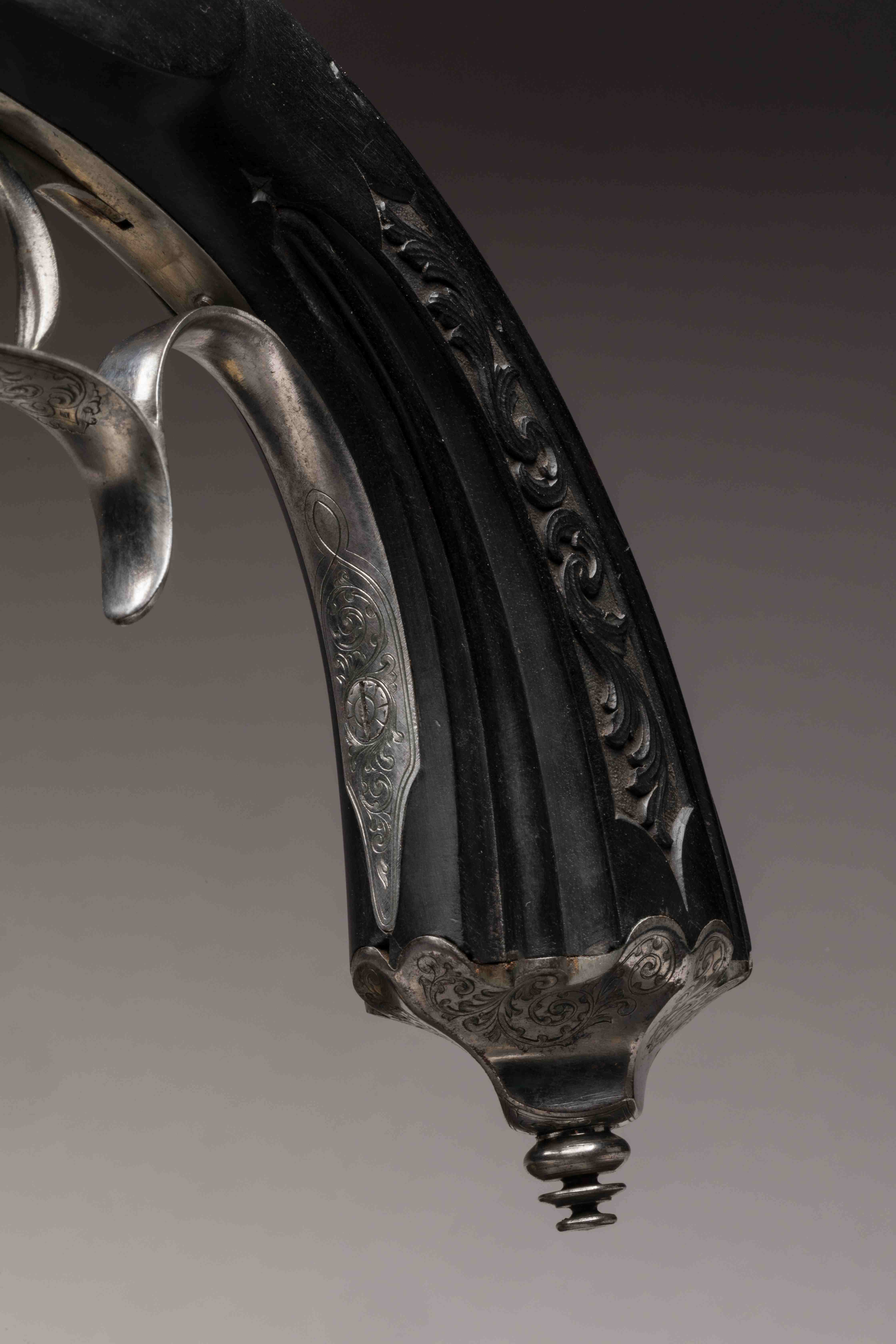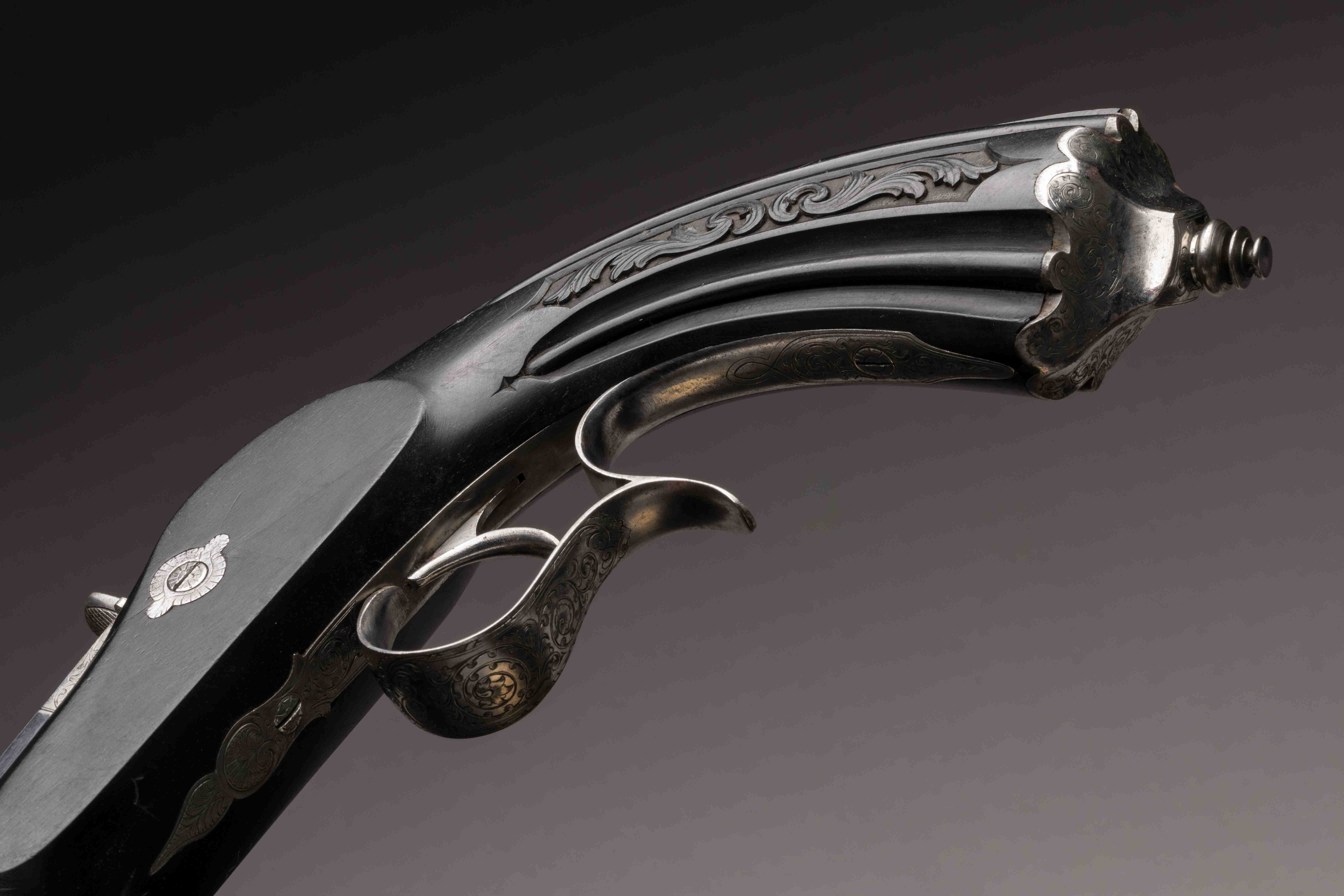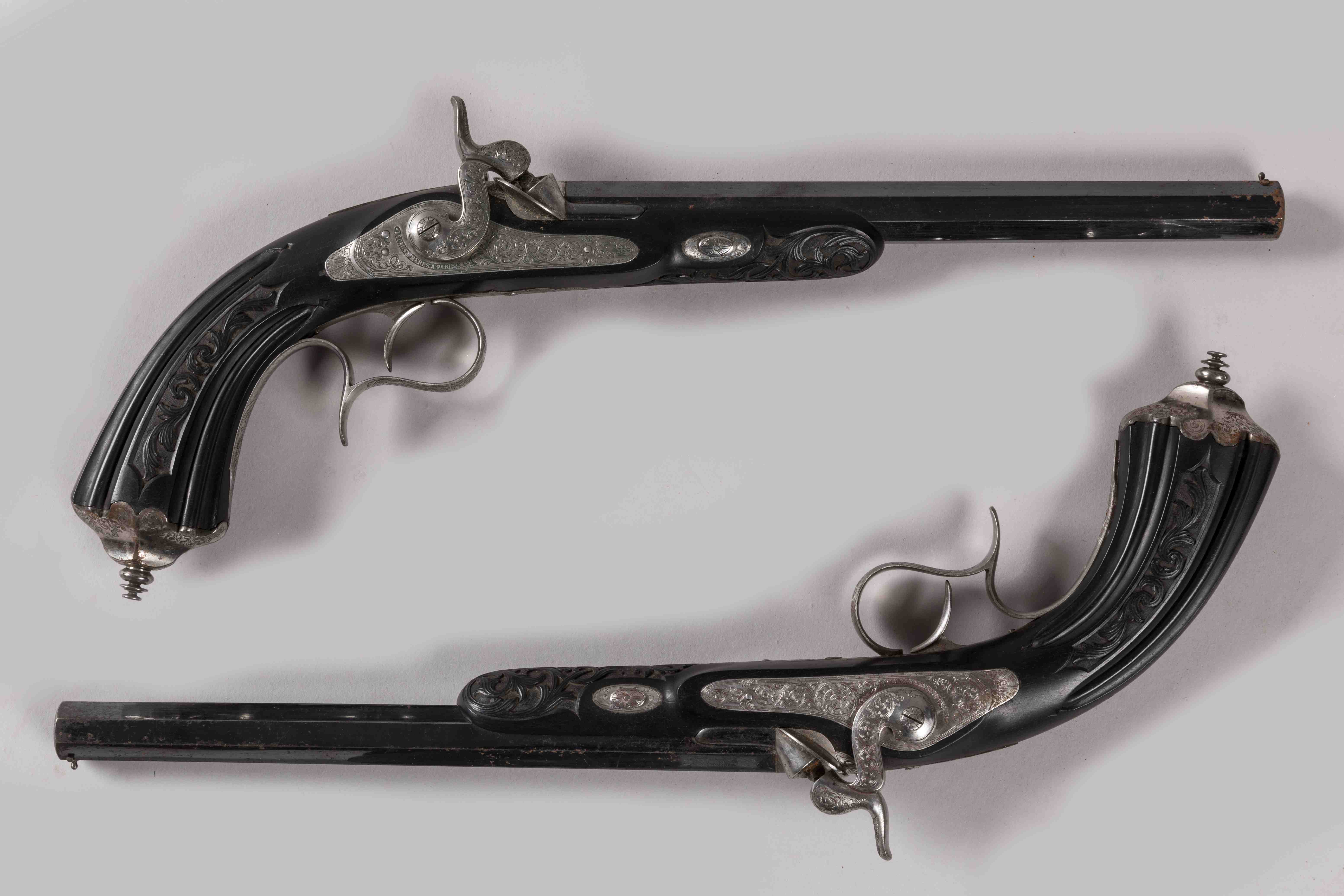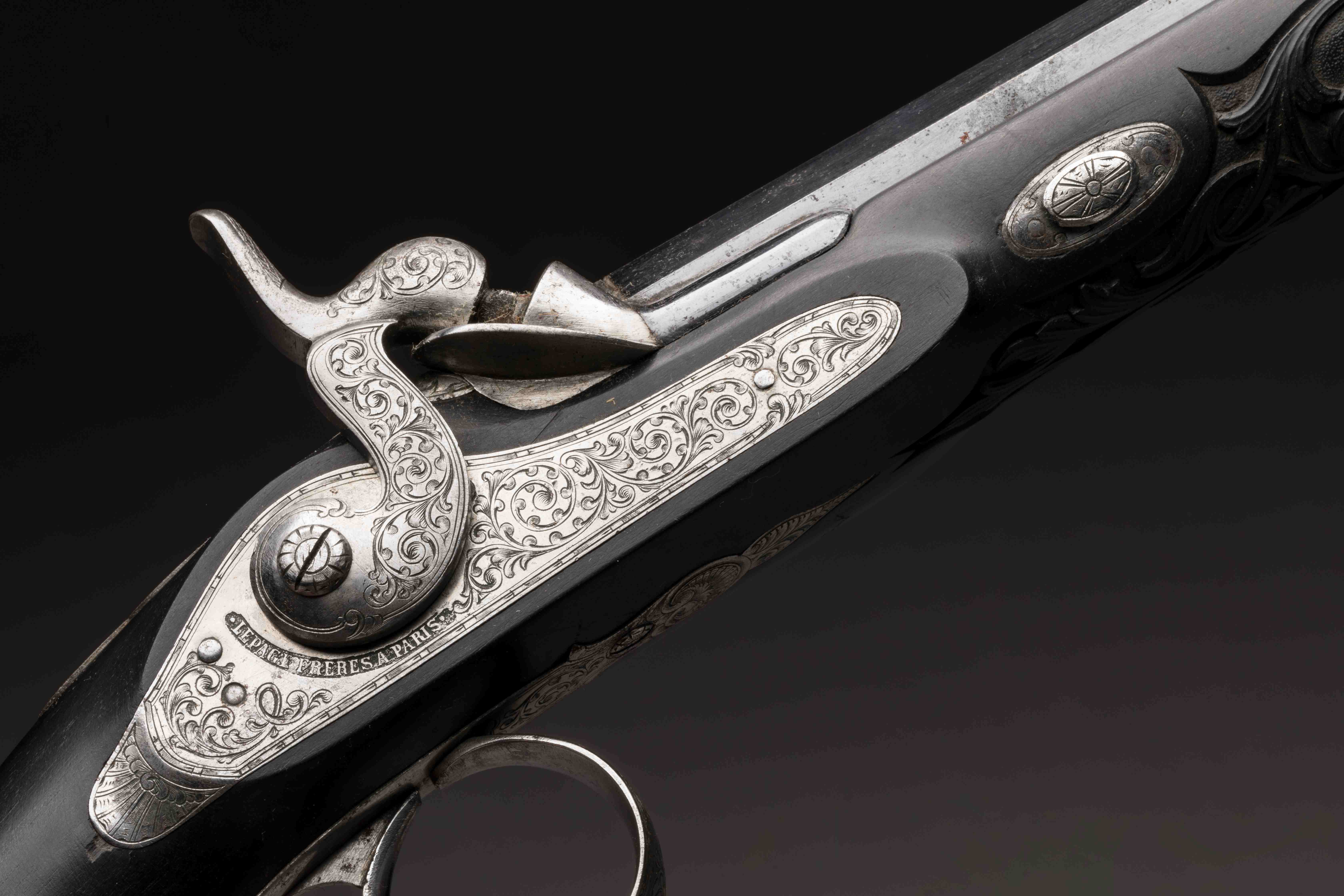 CASSETTE-NECESSAIRE contenant une PAIRE DE PISTOLETS DE DUEL à percussion par LEPAGE Frères. Canons octogonaux bleuis et marqués à l'or sur le pan supérieur : "Acier fondu". Platines, chiens, pontets à repose-doigt et calottes à toupie en fer finement gravés de rinceaux et coquilles. Crosses cannelées et fûts en ébène sculptés de feuillages. Signés sur la platine "Lepage Frères à Paris". Mécanismes fonctionnels. La cassette en placage d'ébène marqueté de filets de laiton est centré d'un cartouche monogrammé "FF". Il contient, sur un montage à la française garni de velours : louche à plomb à manche en ébène torsadé, moule à balles, baguette de bourrage, maillet (accidenté), louche à poudre, baguette de nettoyage, tire-bourre, deux cheminées de rechange et quelques balles. Avec sa clef.