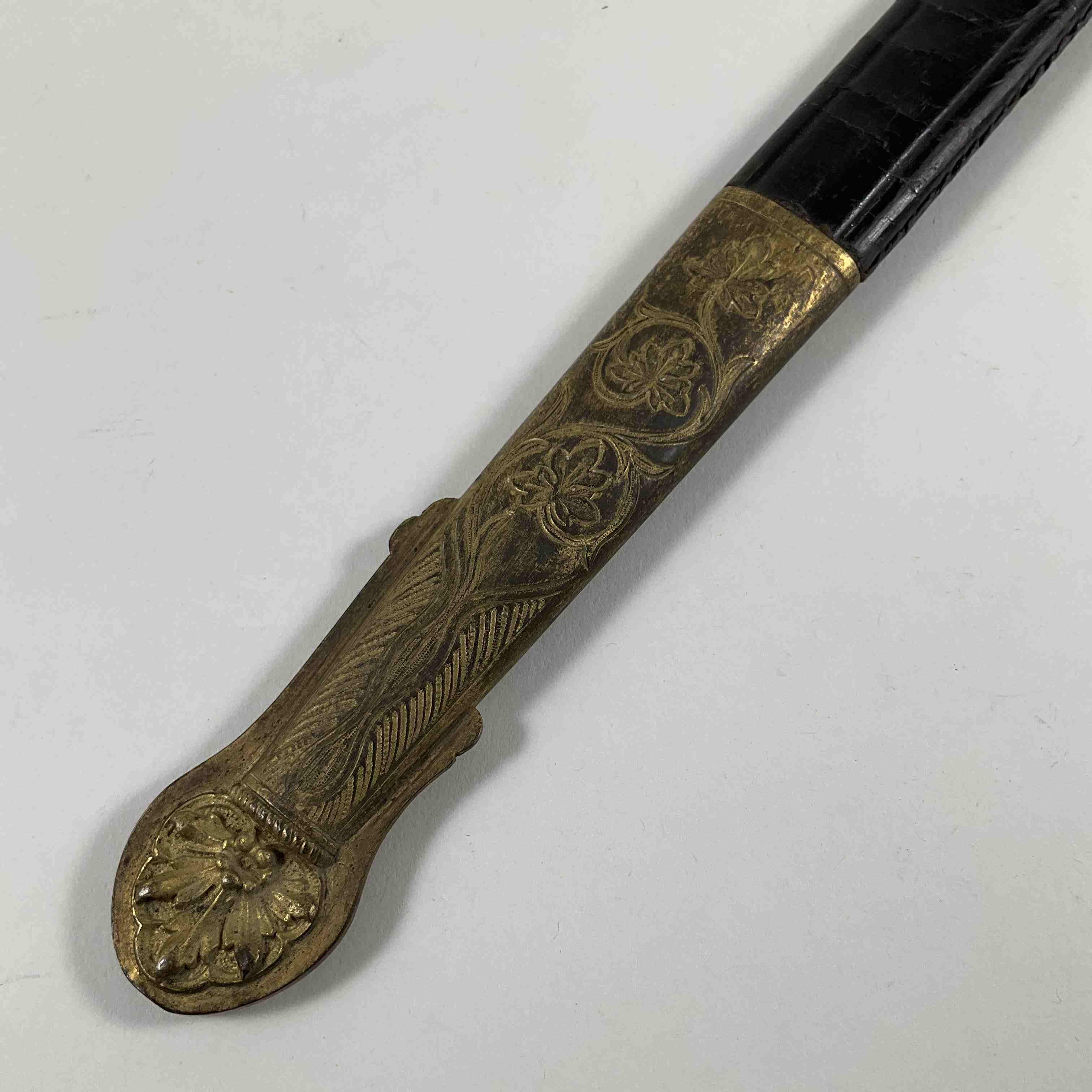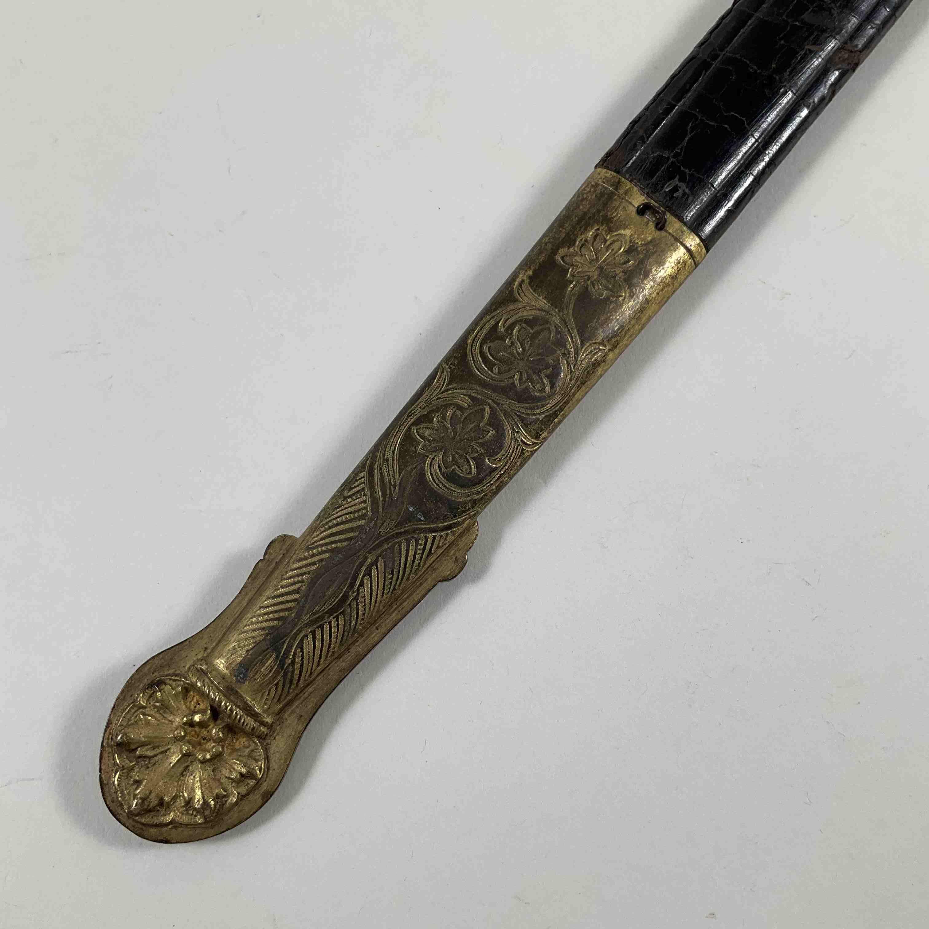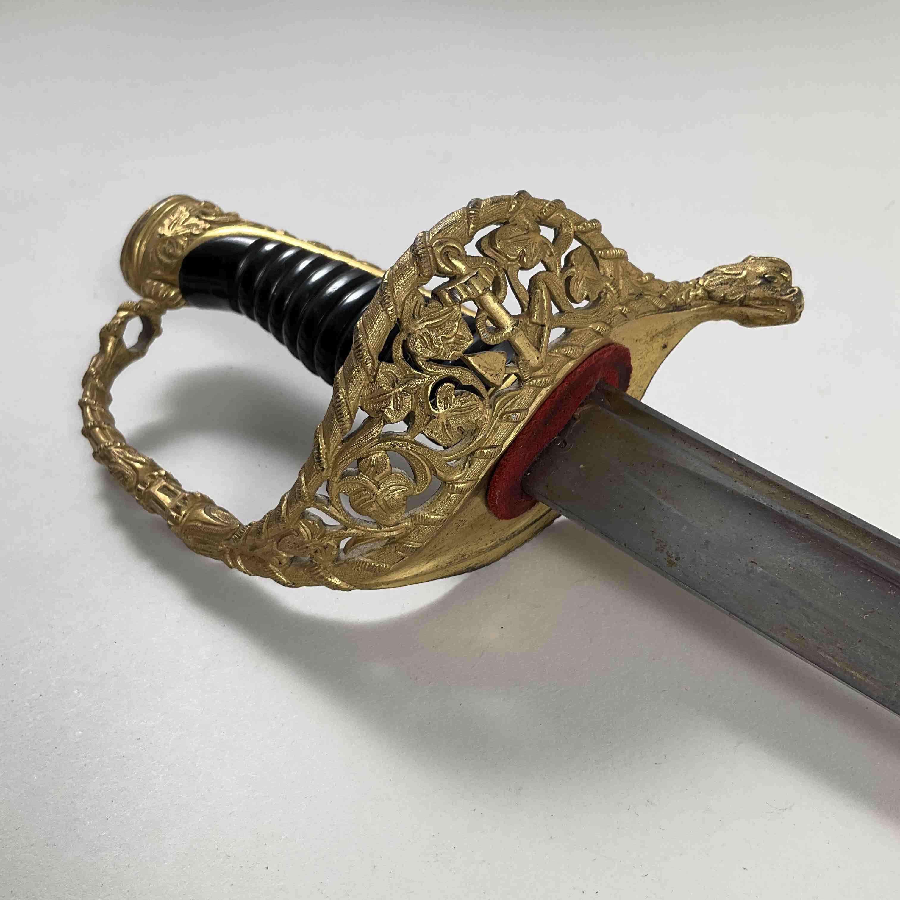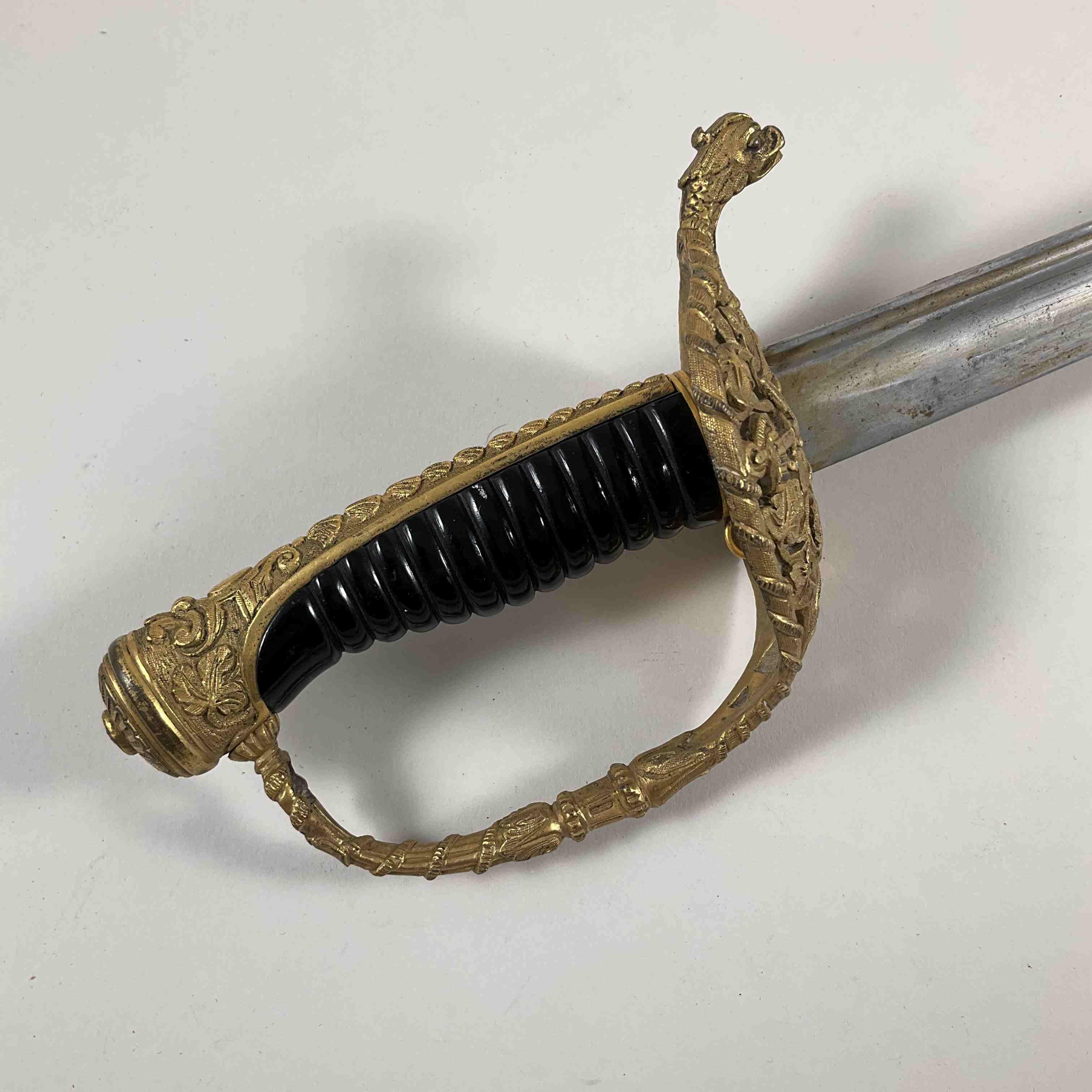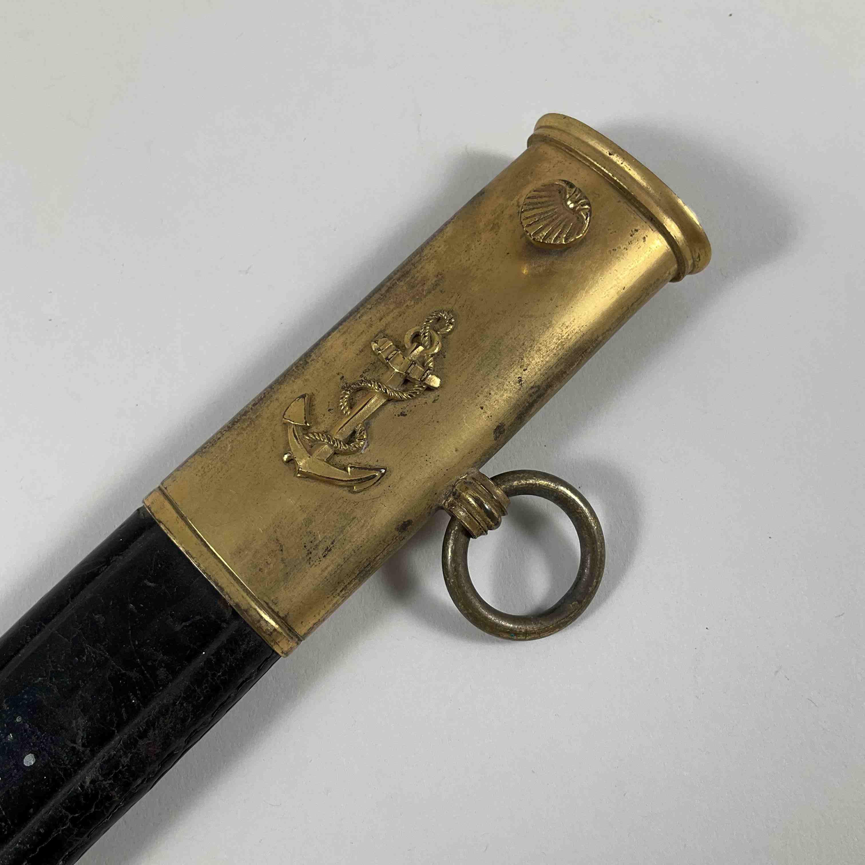 - SABRE d'Officier de Marine modèle 1853-70. Poignée en corne. Monture en laiton ciselé doré. Calotte à longue queue. Garde à une branche et coquille ajourée à décor de l'ancre et feuillage. Lame légèrement courbe marquée "Coulaux & Cie Klingenthal" et contre tranchant, pans creux et gouttière. Fourreau en cuir à trois garnitures en laiton découpé à décor ciselé et doré, à deux anneaux de suspente. Longueur totale : 84 cm.