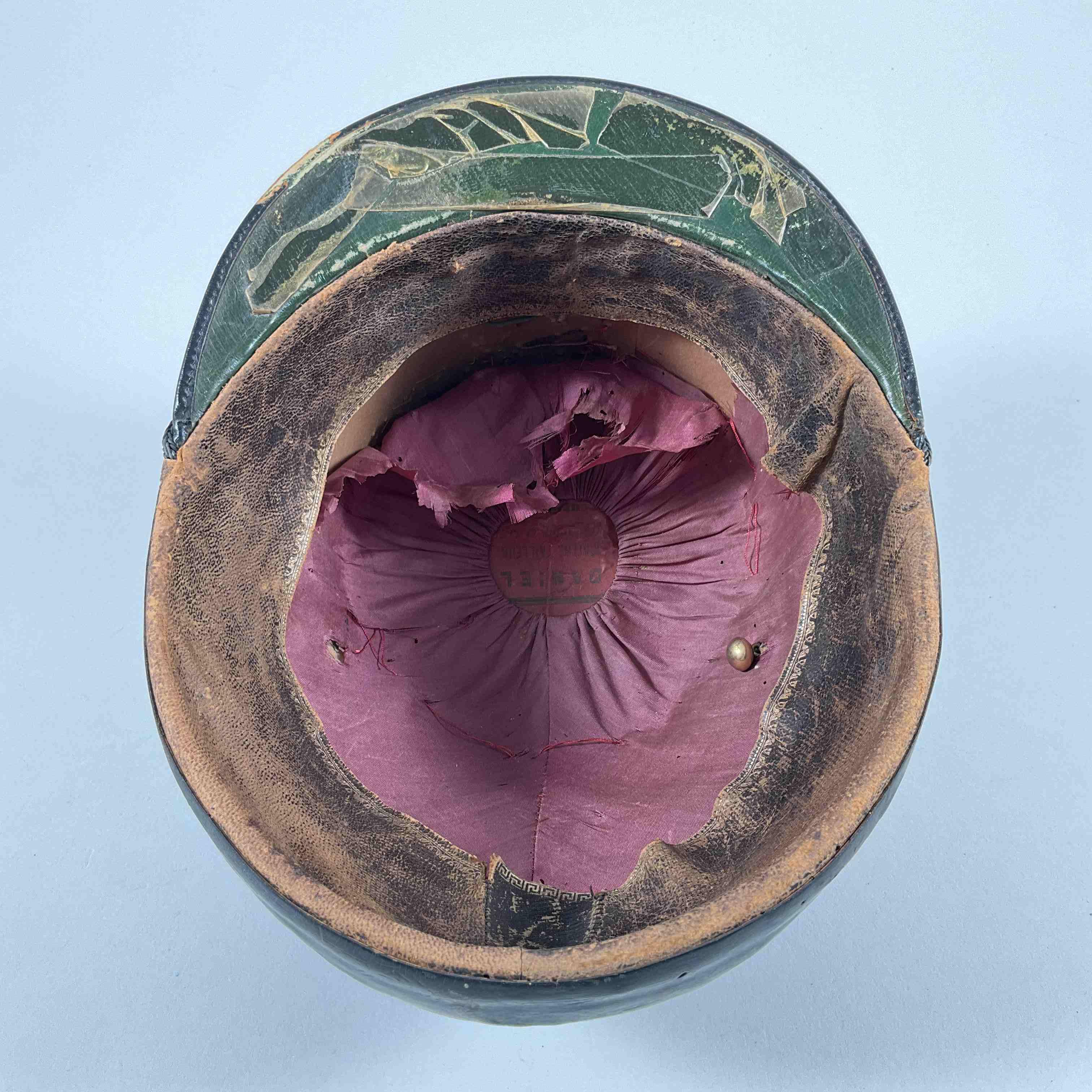 - SHAKO au règlement de 1872. Fût en carton recouvert d un drap bleu marine, un galon en passementerie d'argent et bandeau en cuir. La calotte est en cuir rigide, visière en cuir. Il est orné d une cocarde avec bouton et ancre. On y joint ses deux casoars (un rouge et un tricolore) et sa boîte de transport en bois.