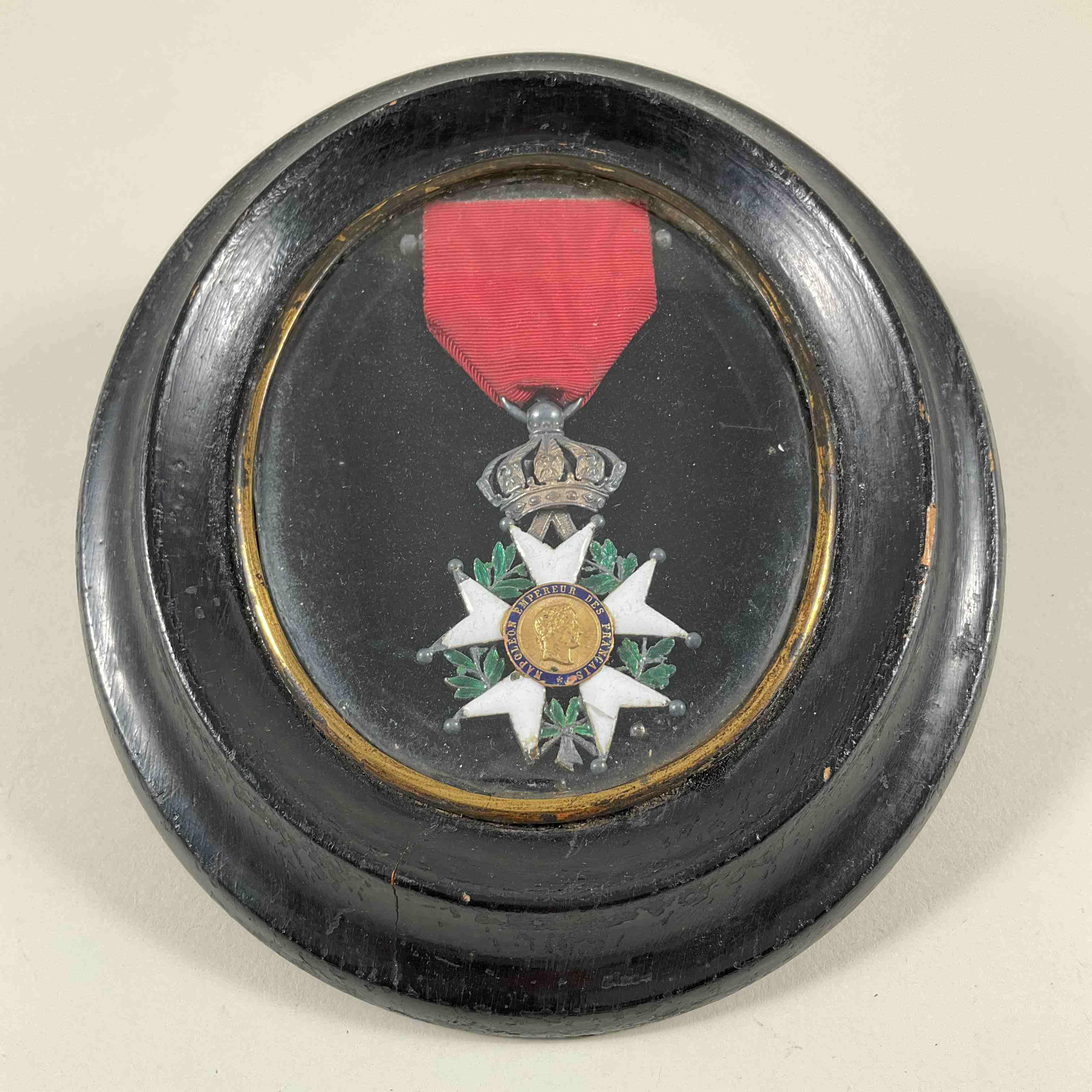 - SECOND EMPIRE, ORDRE DE LA LEGION D'HONNEUR, ETOILE DE CHEVALIER en argent émaillé (accidents) dans son encadrement en ovale en bois noirci d'époque.