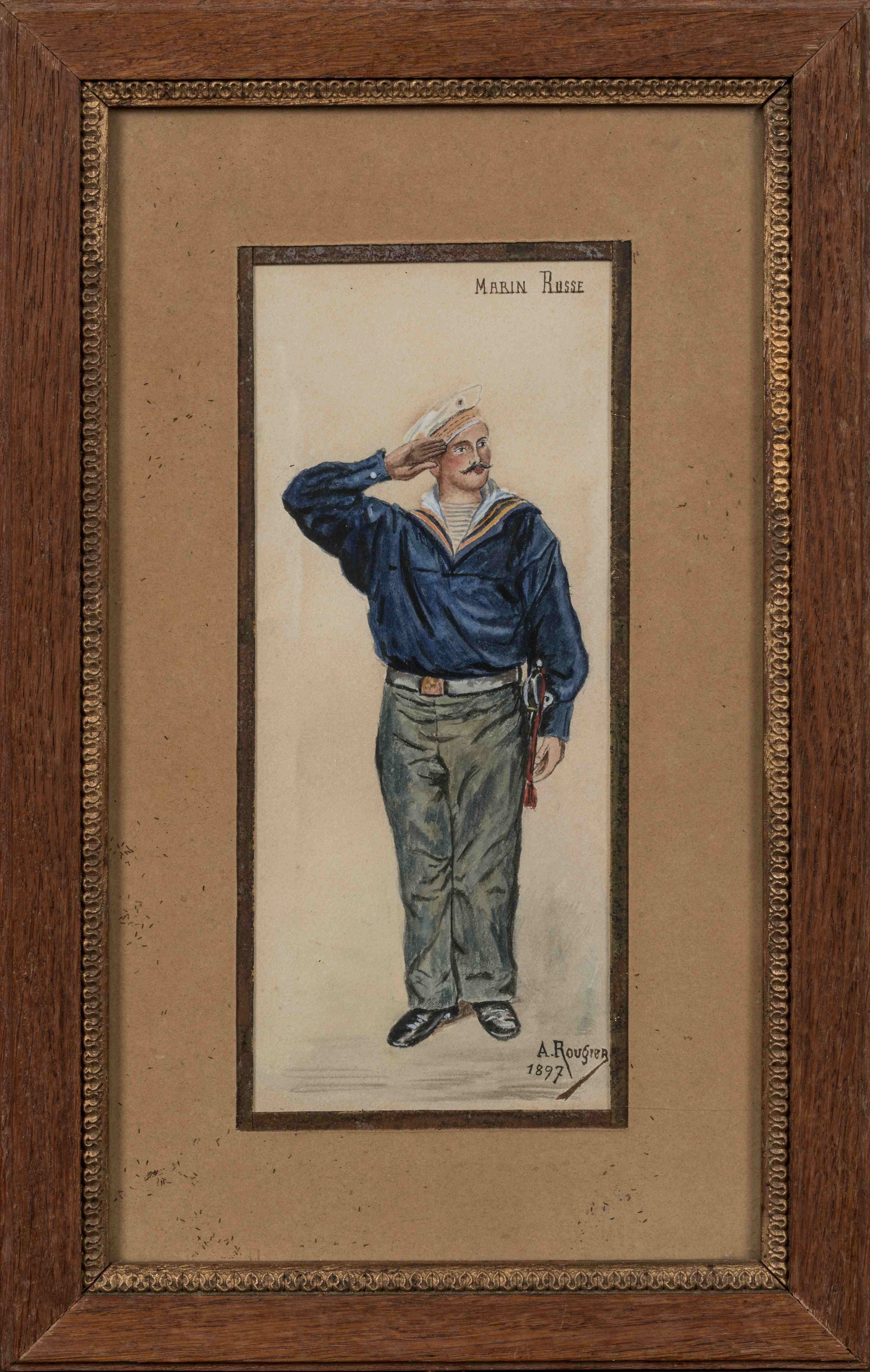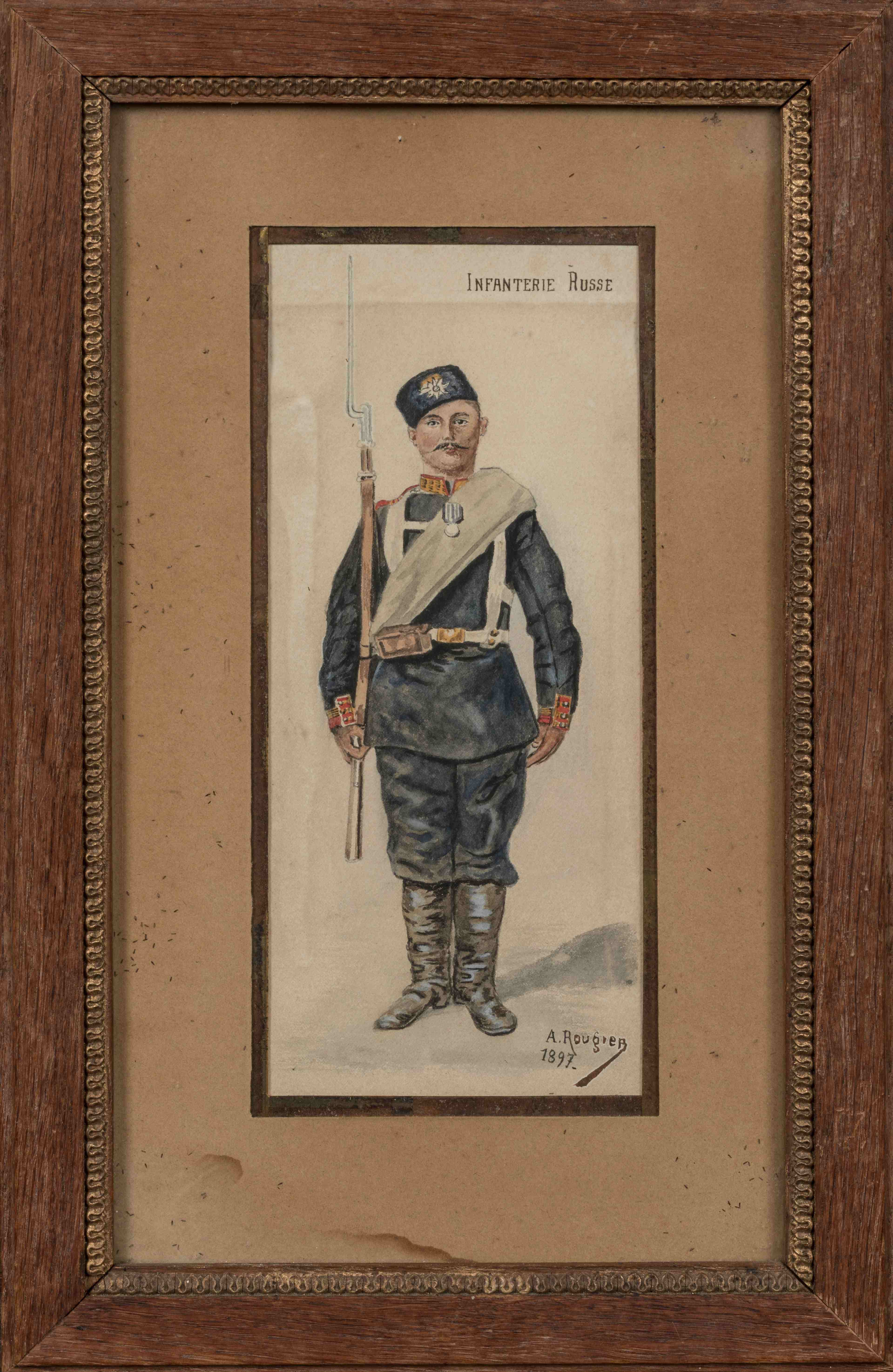 A. ROUGIER (XIXe)"Marin russe" - "Infanterie russe".Paire d'aquarelles gouachées signées et datées 1897 en bas...