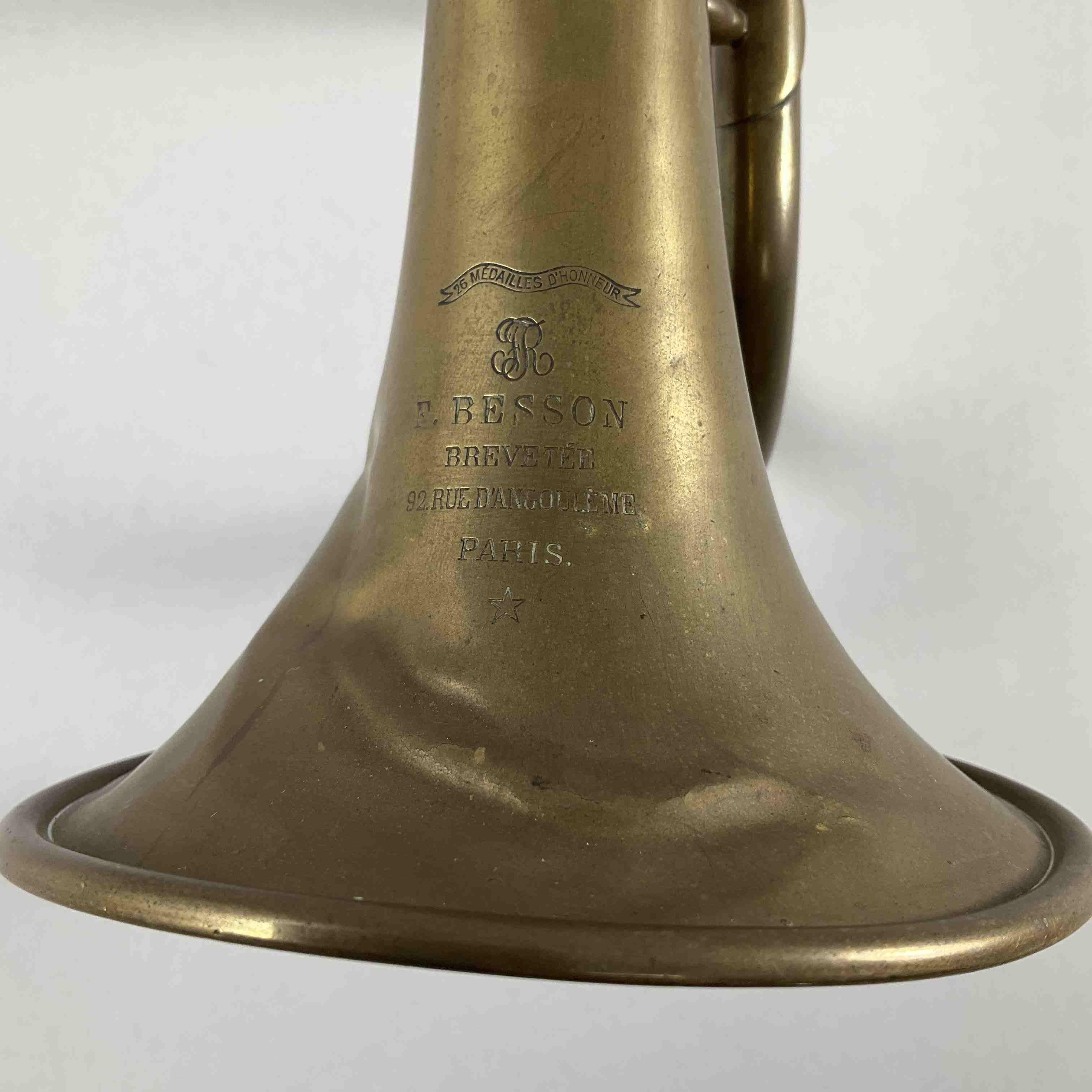 BUGLE à pistons en laiton de la maison Besson à Paris. Numéroté 3013. (Manque un piston, accidents).