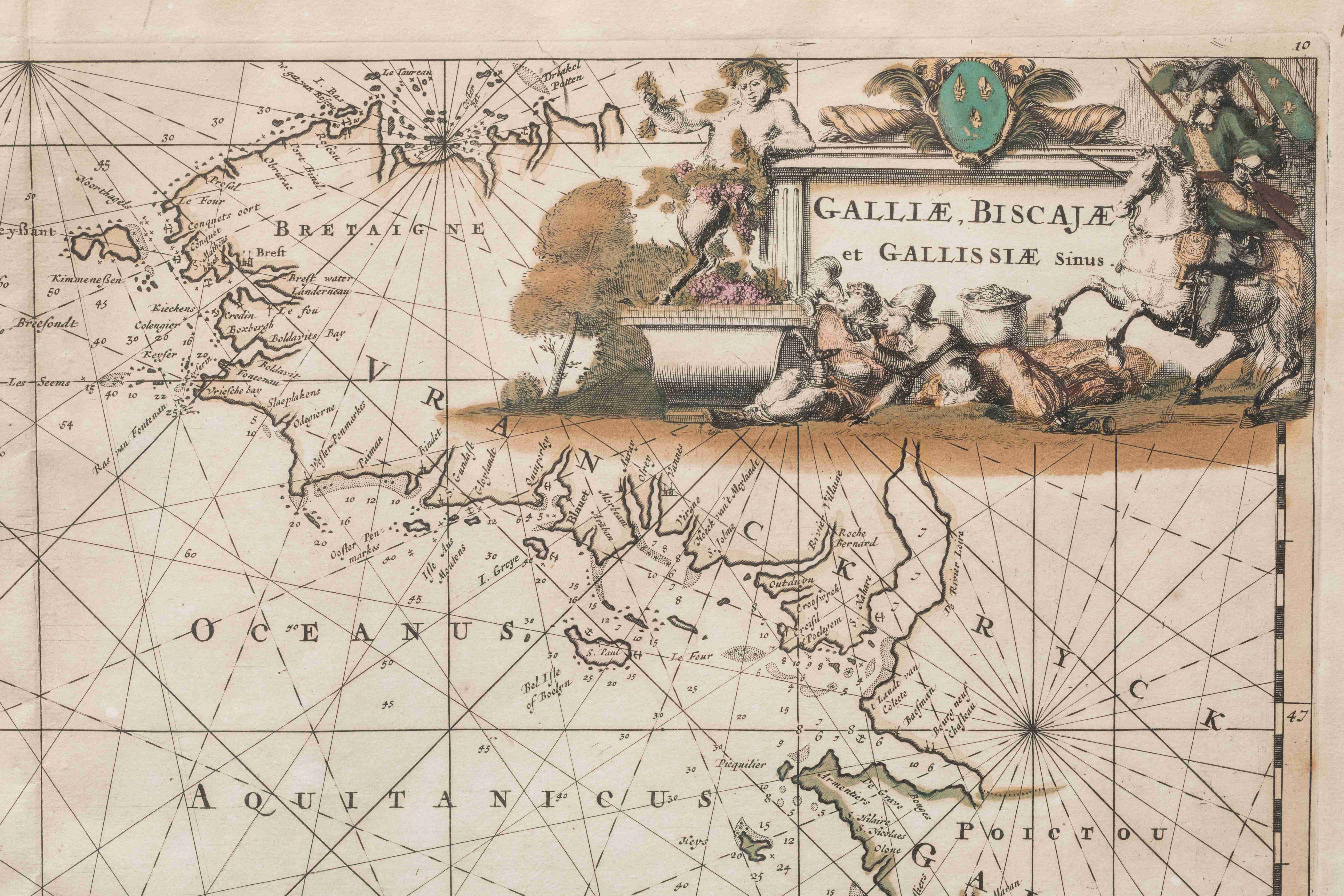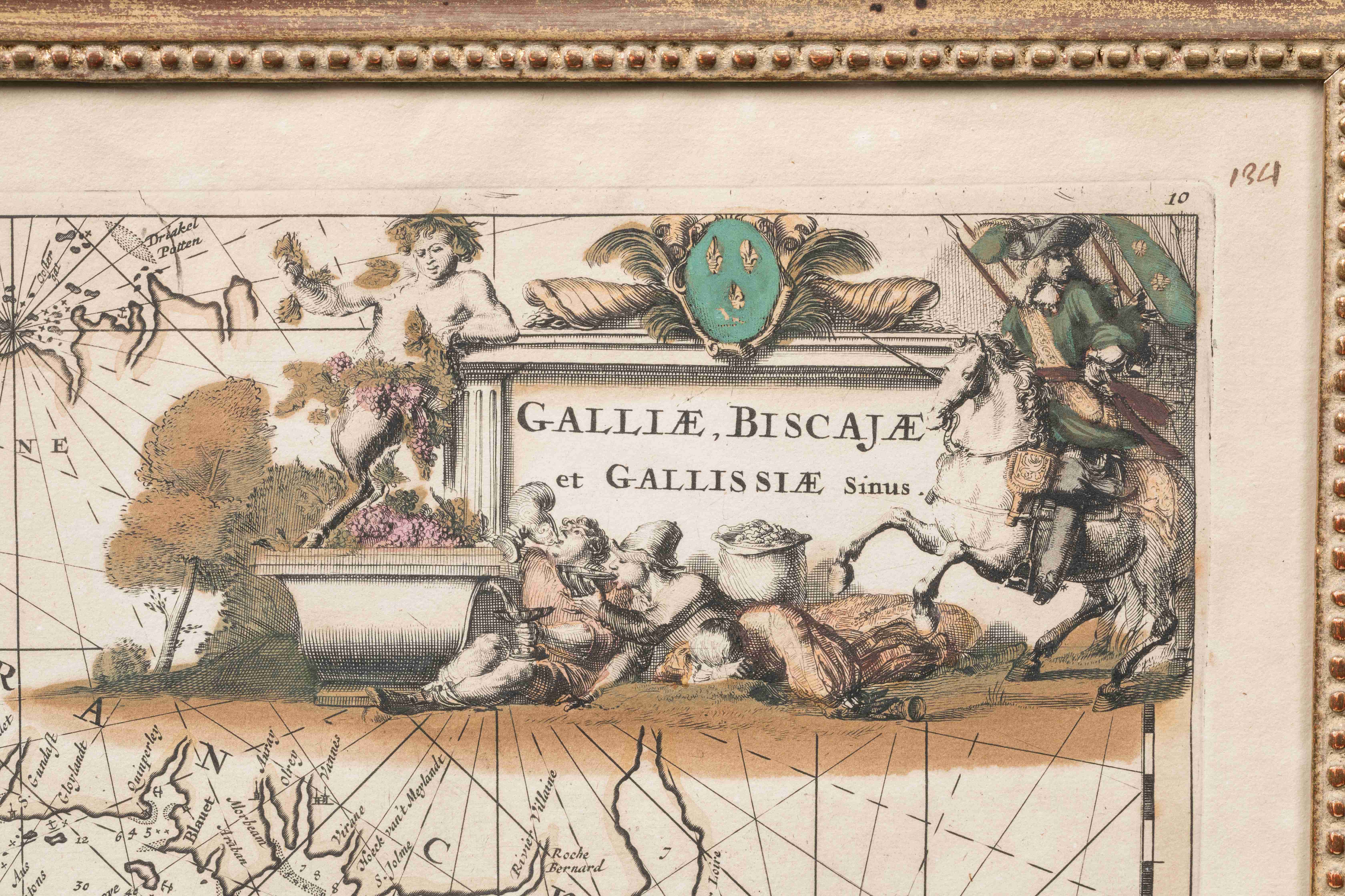 CARTE MARINE DES COTES ATLANTIQUES, DU FINISTERE A LA GALICE par DE WIT, "Galliae, Biscajae et Gallissiae Sinus". Cette carte d'une grande finesse est ornée d'une bataille navale.