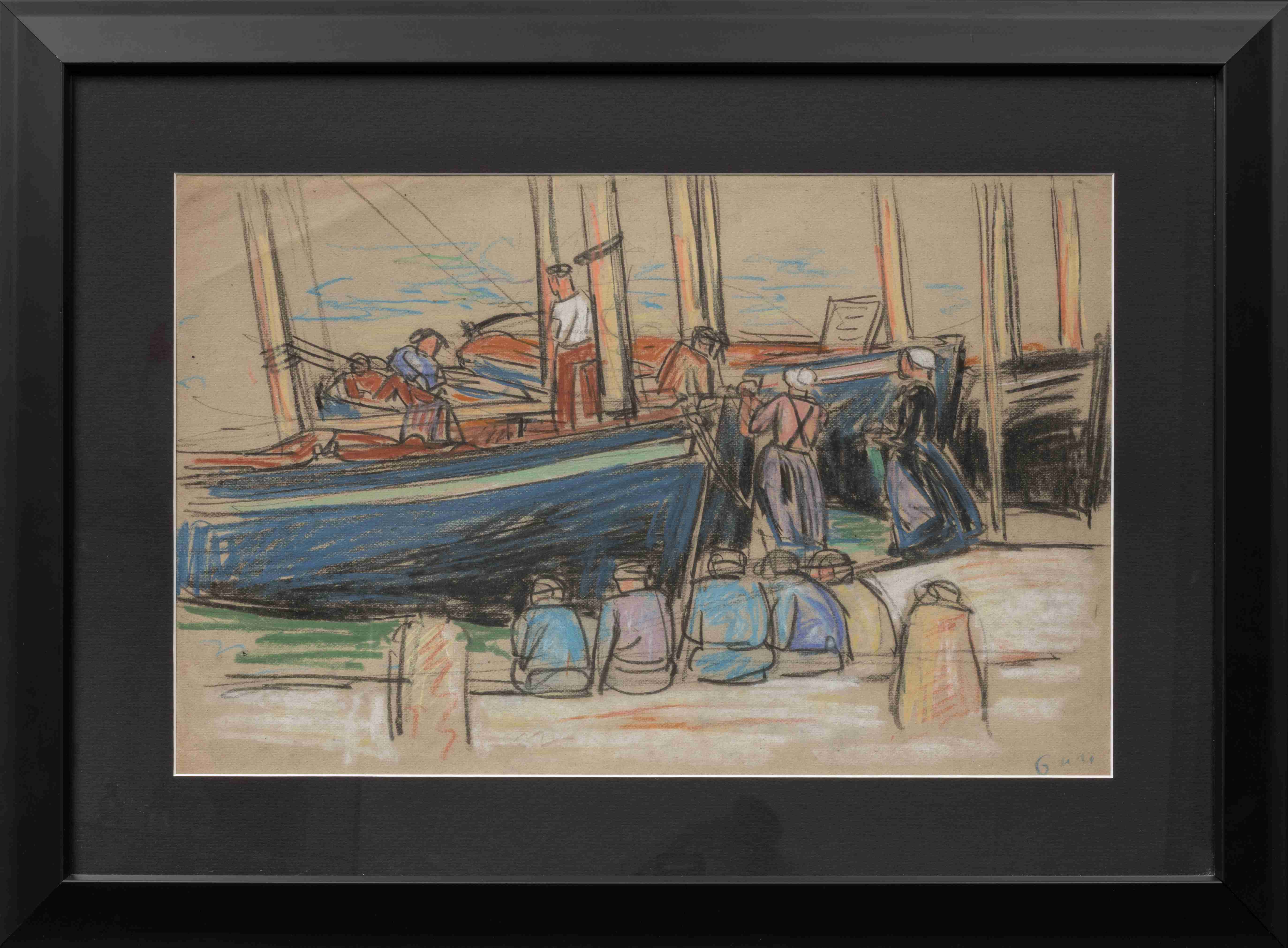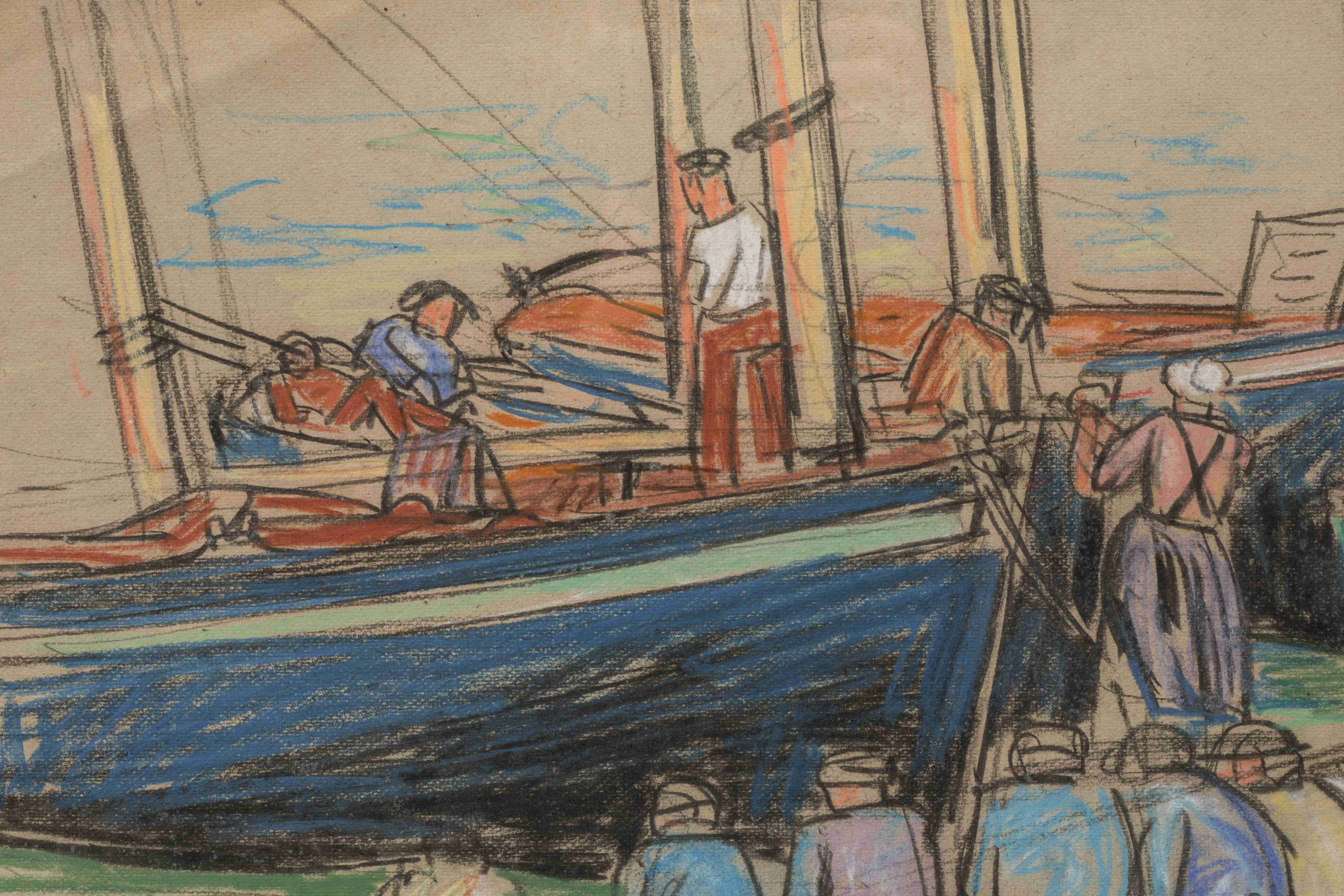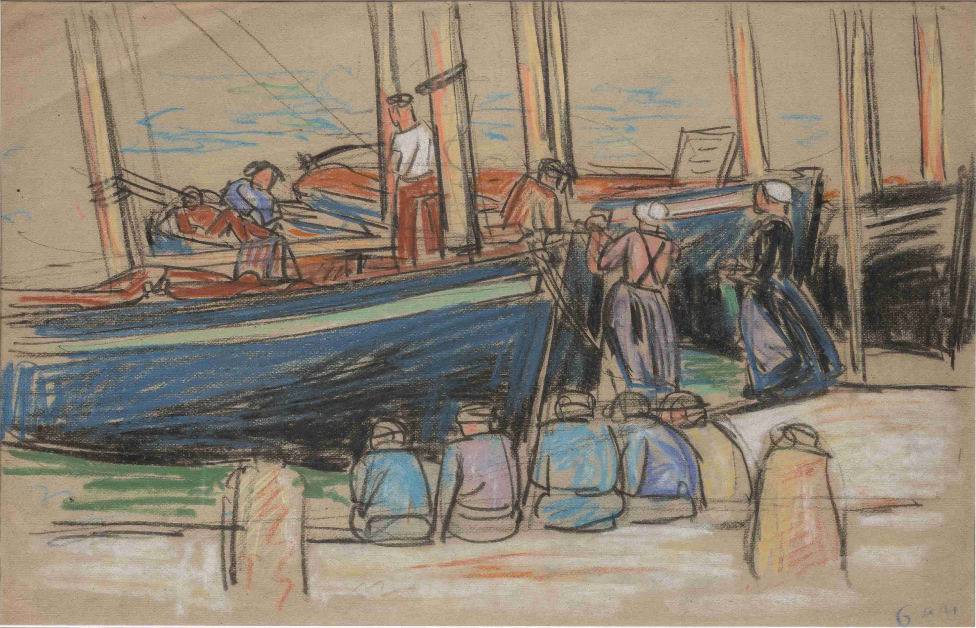 Chaloupes sardinières sur un quai animé de marins et femmes en costume.