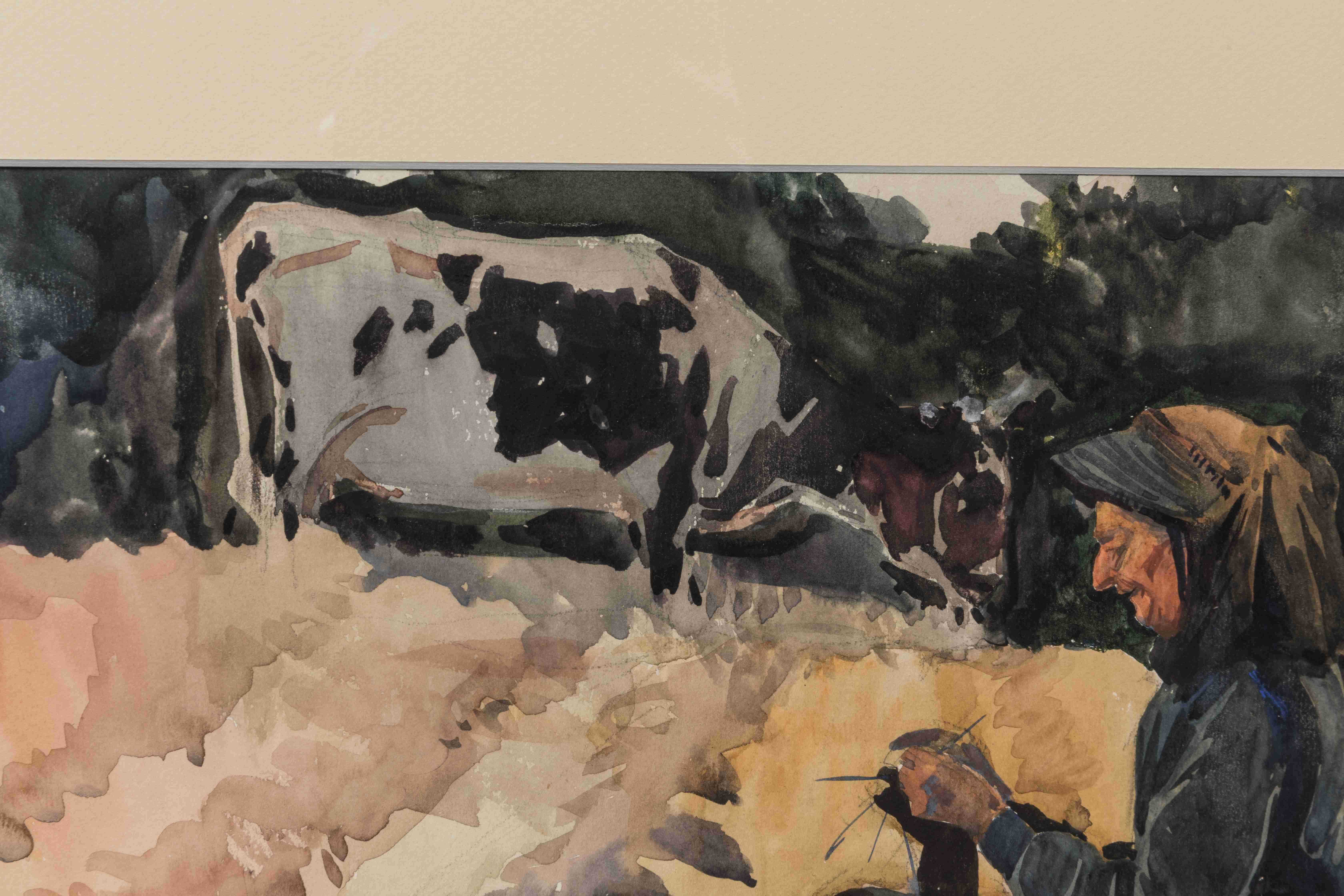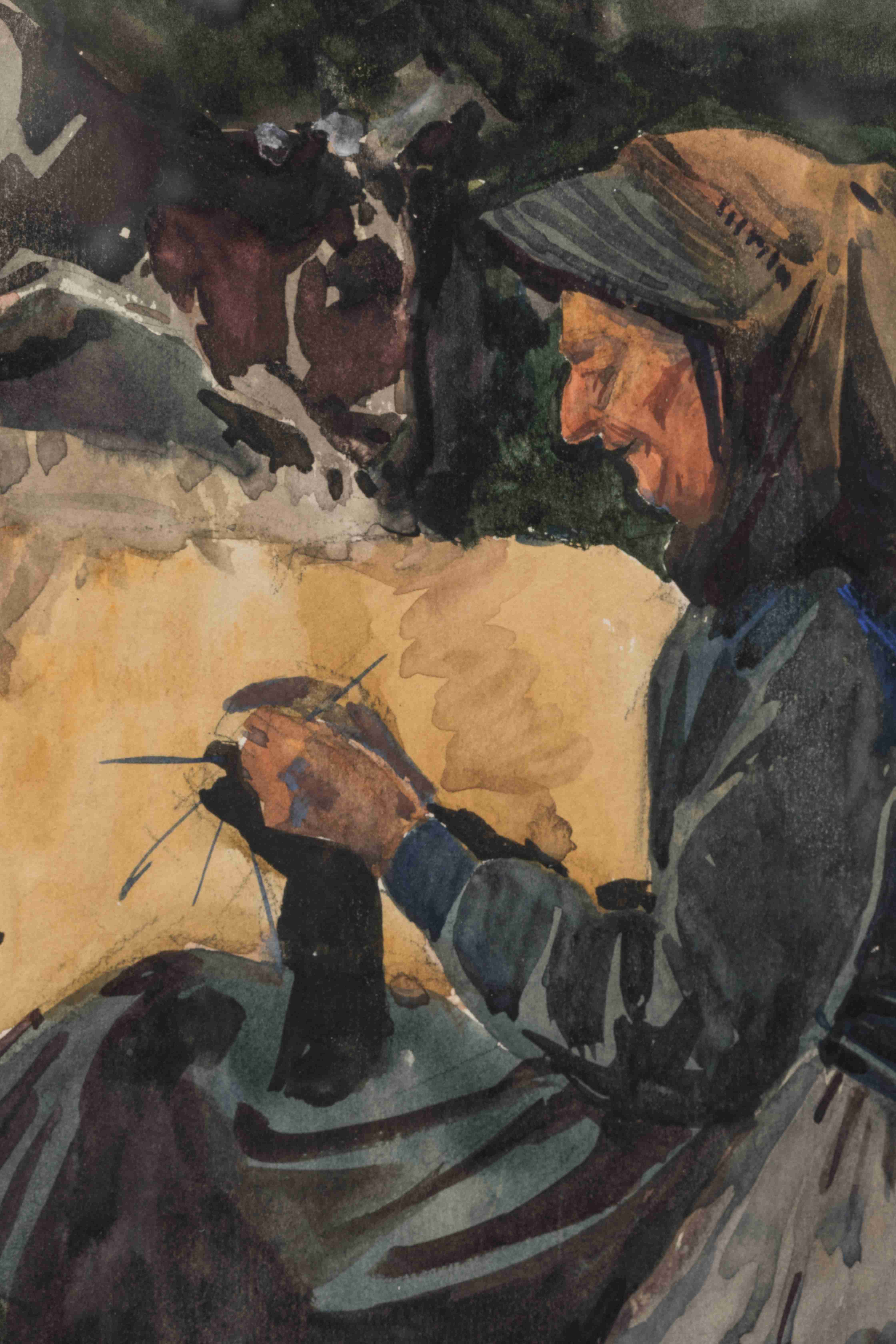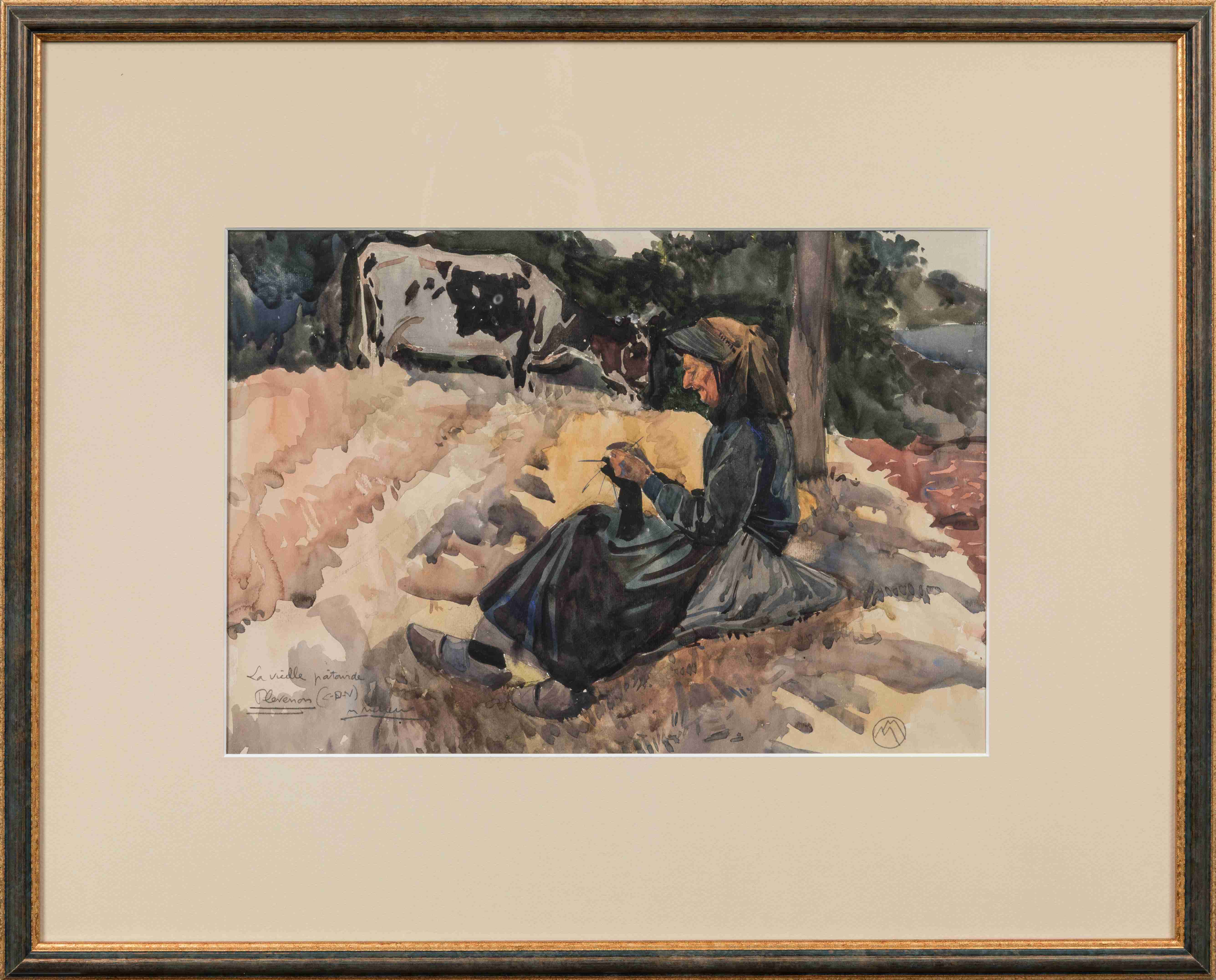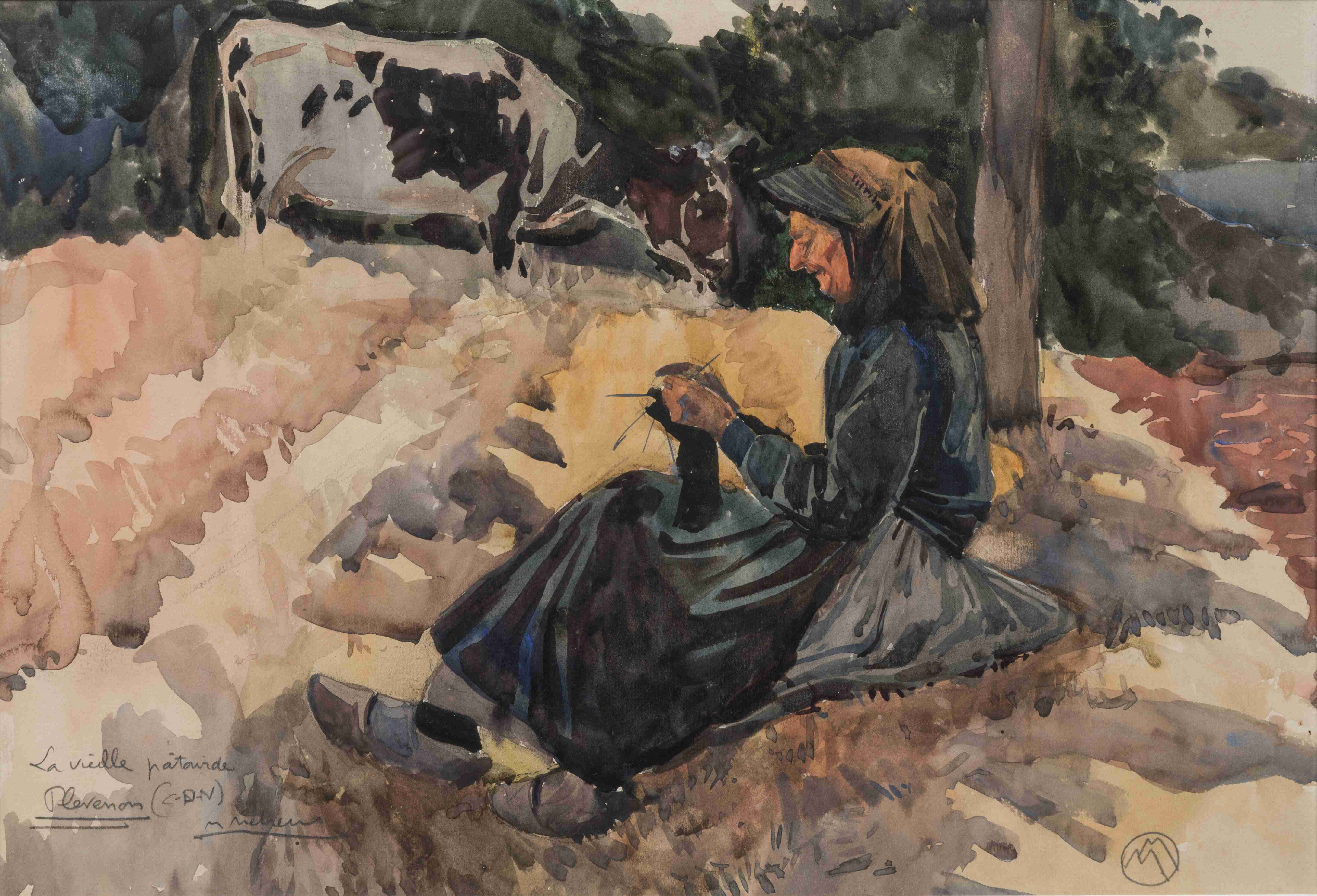 Notre vieille pâtourde, coiffée du capot de travail typique du pays de Penthièvre, est assise dos à la mer sur un coussin de bruyères. Elle tricote, tout en veillant sur sa vache, avec quatre aiguilles. Des chaussettes, donc. On reconnaît ici la précision et la justesse documentaire caractéristiques de l'oeuvre de Méheut.
