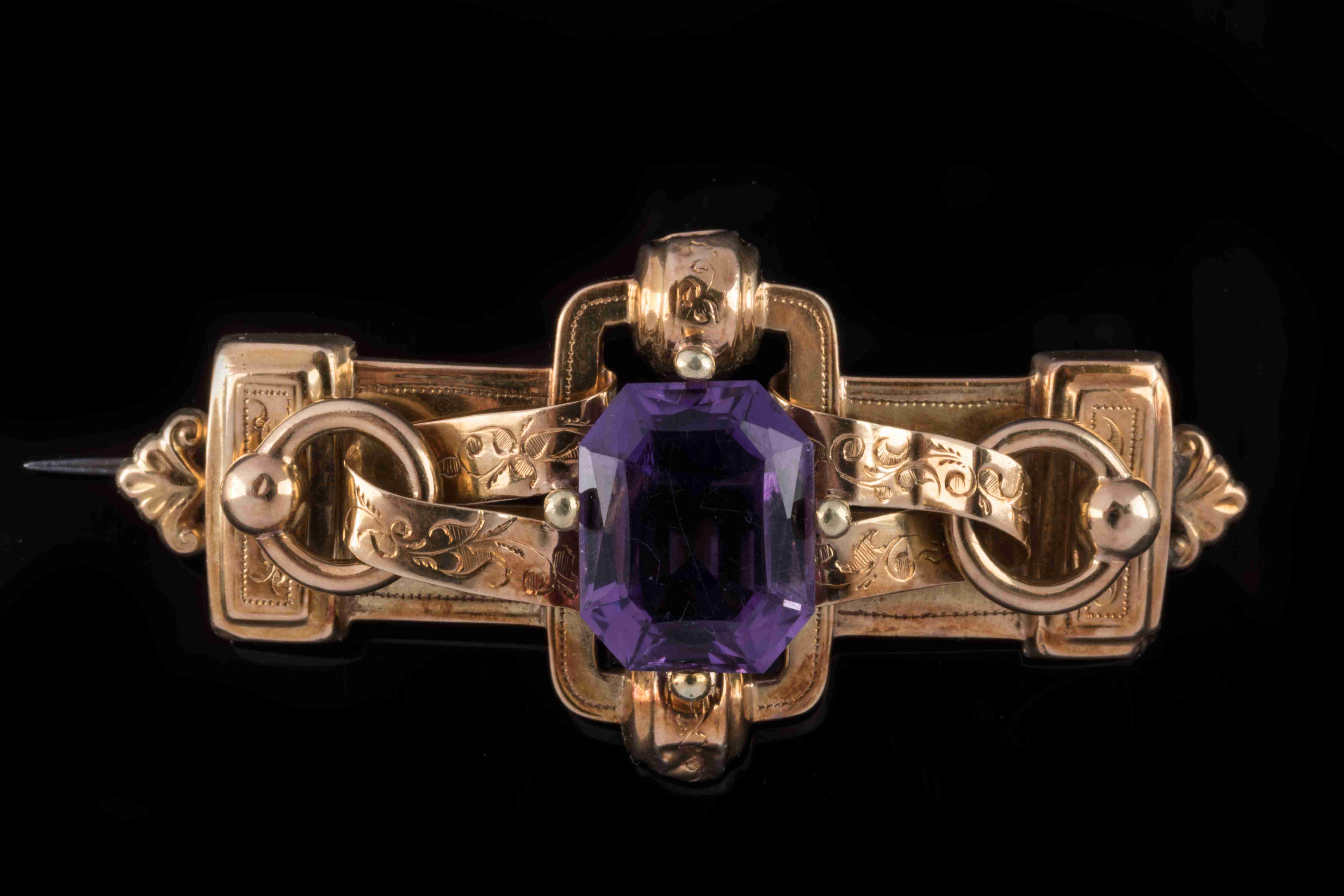 Elle est centrée d'une AMETHYSTE taille émeraude. Epingle en acier.