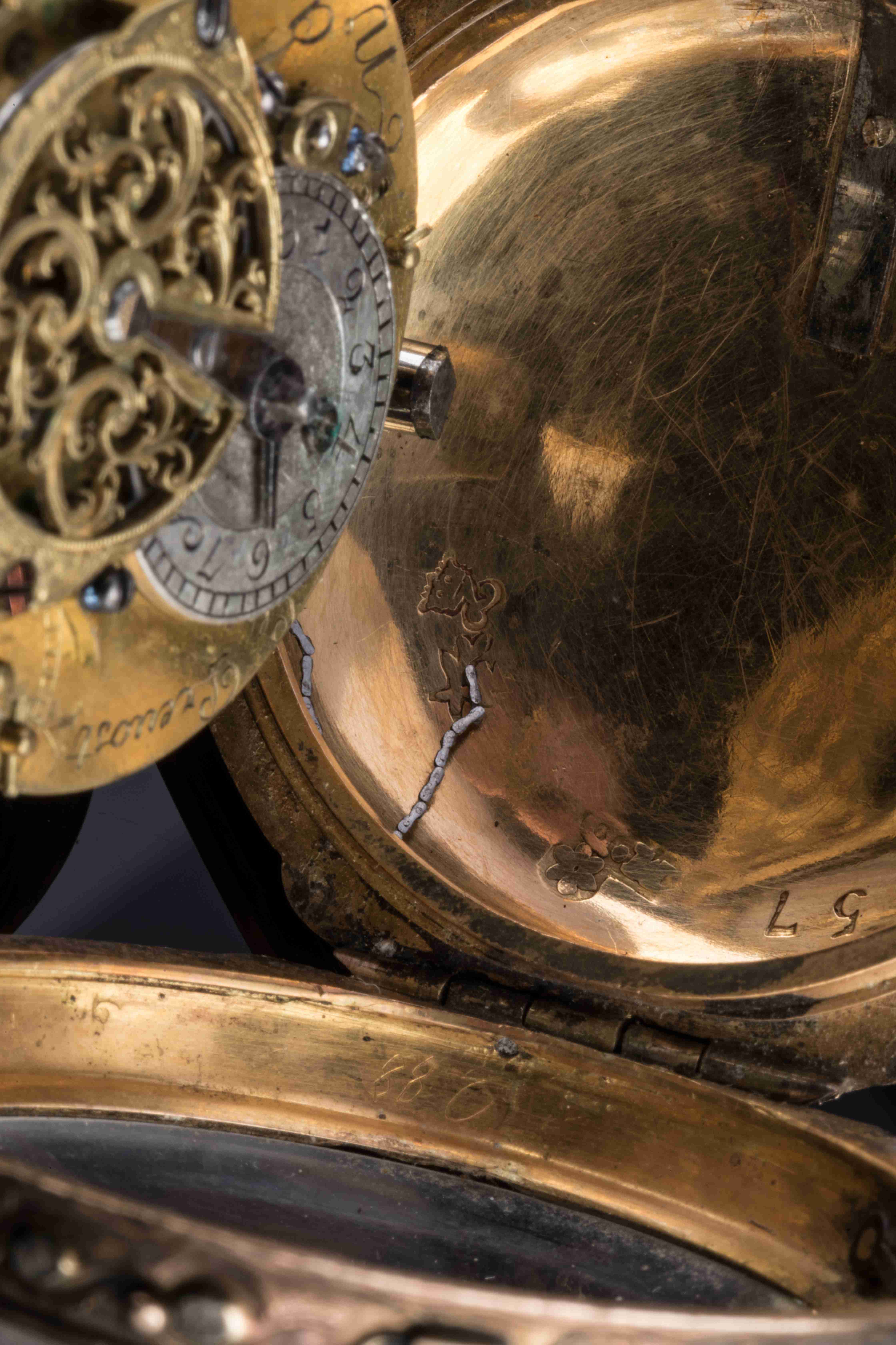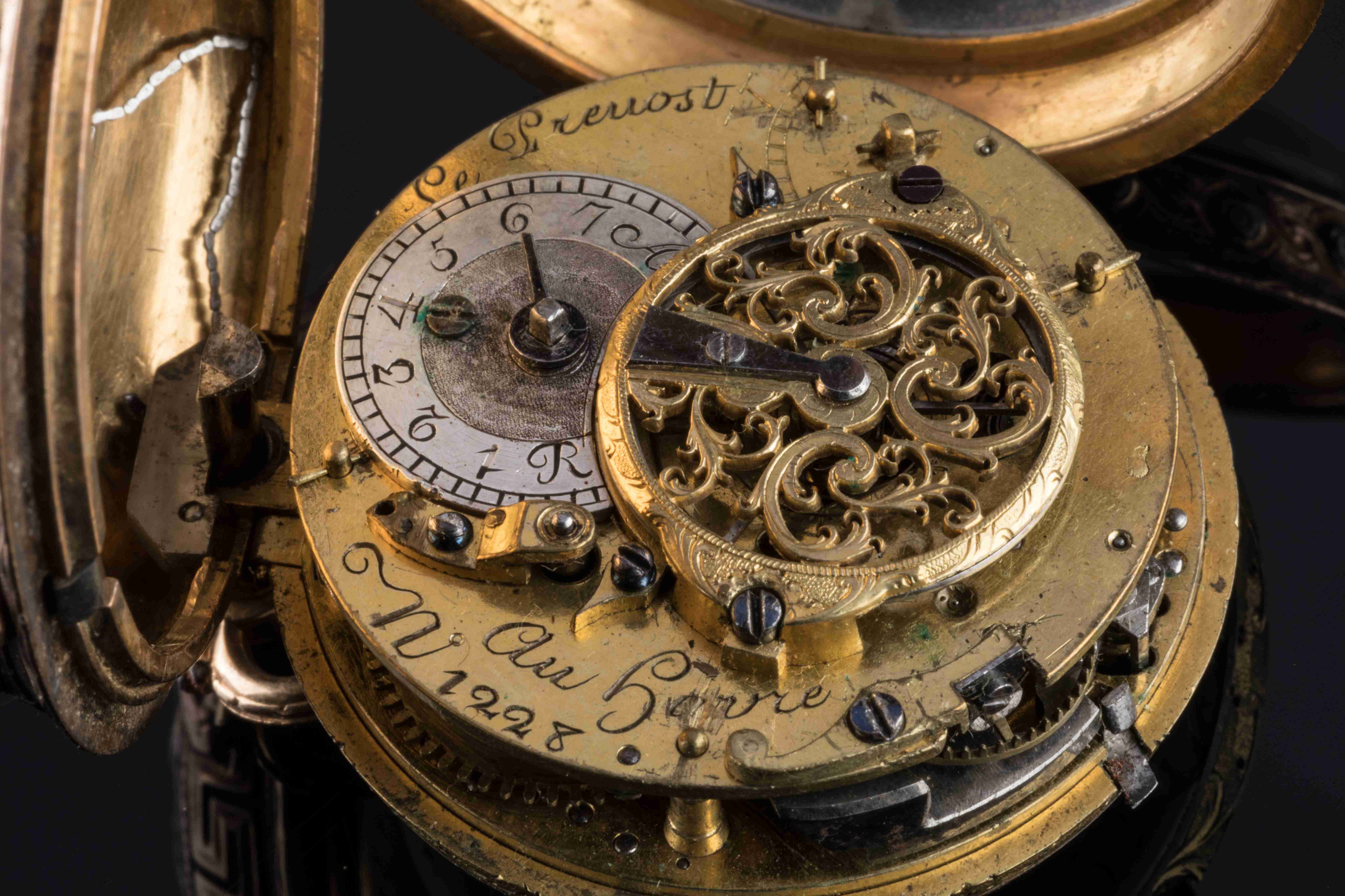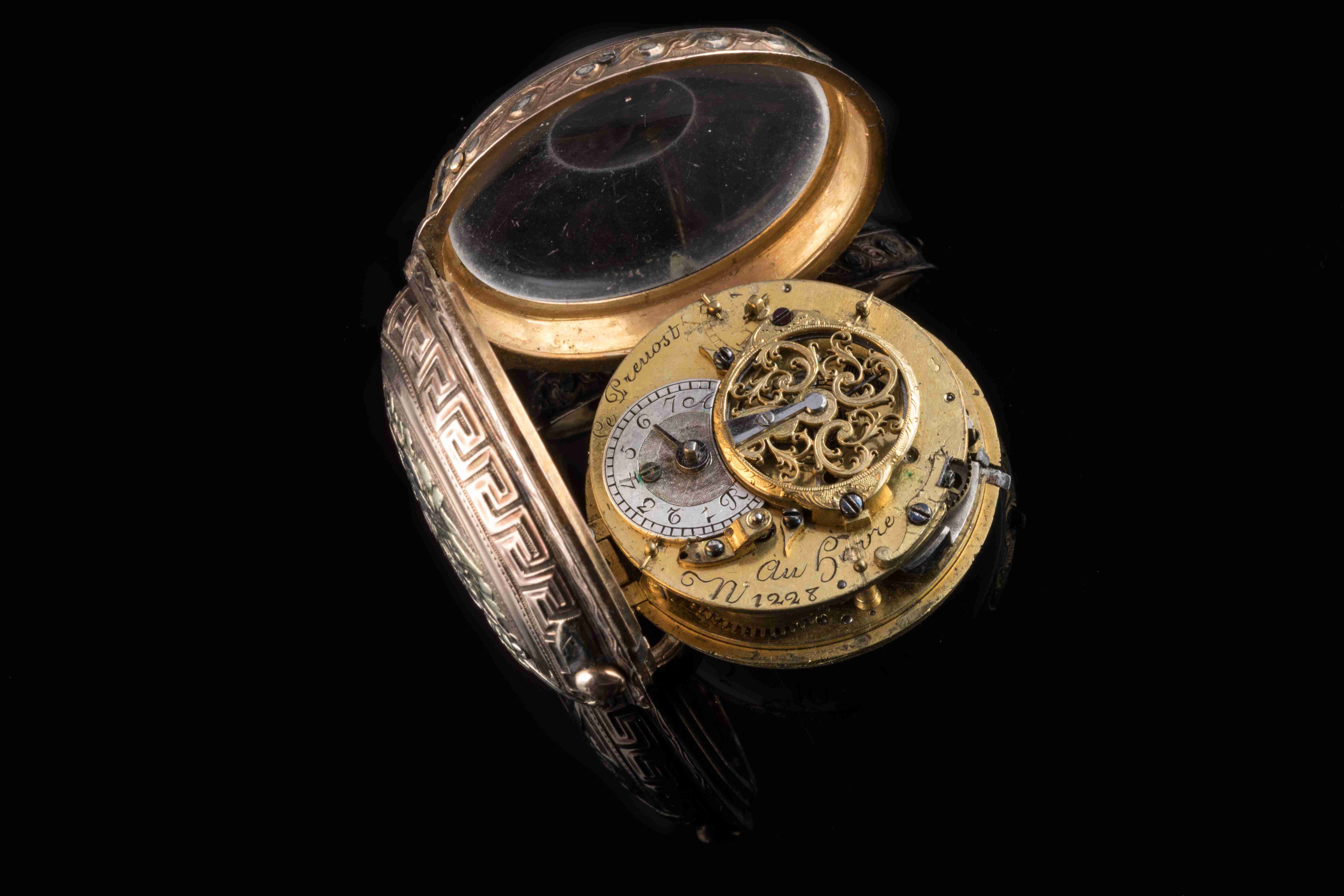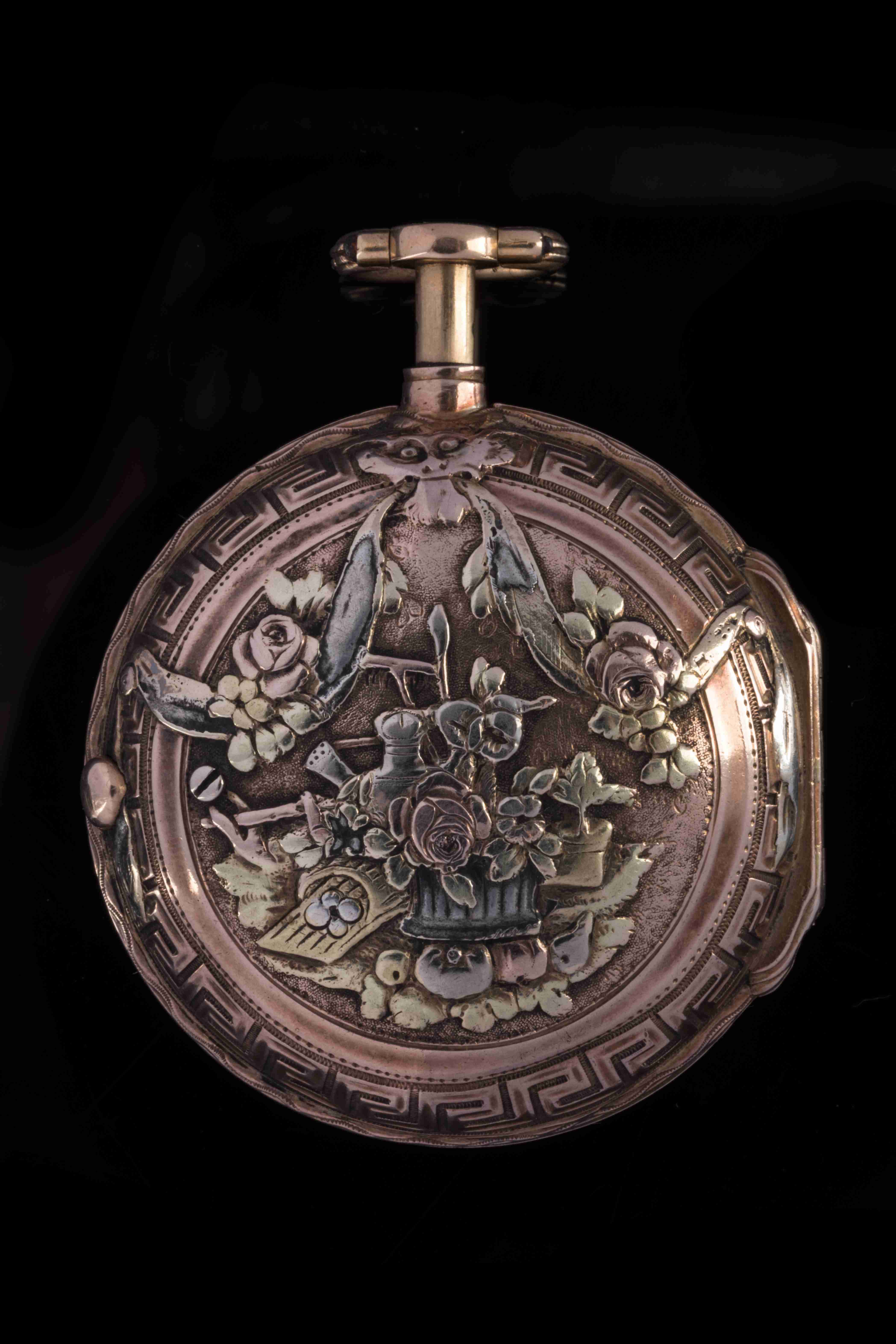 MONTRE DE GOUSSET à sonnerie "à toc et à tact" en or de quatre tons : jaune, vert, rose et gris. Le dos du boîtier, bordé d'une frise de grecques, reçoit un fin décor d'attributs jardiniers : arrosoir, oeufs dans un panier, plante en pot, panier de fleurs, fruits... Sur la lunette, c'est une frise de postes qui encadre le cadran émaillé blanc muni d'un guichet à clef et indiquant les heures en chiffres romains et les cinq minutes en chiffres arabes. Elle est dotée d'un mouvement à coq repercé d'agrafes feuillagées signé "Le Prevost / Au Havre" et numéroté 1228. Avec une clef du XVIIIe siècle en or de deux tons et acier.