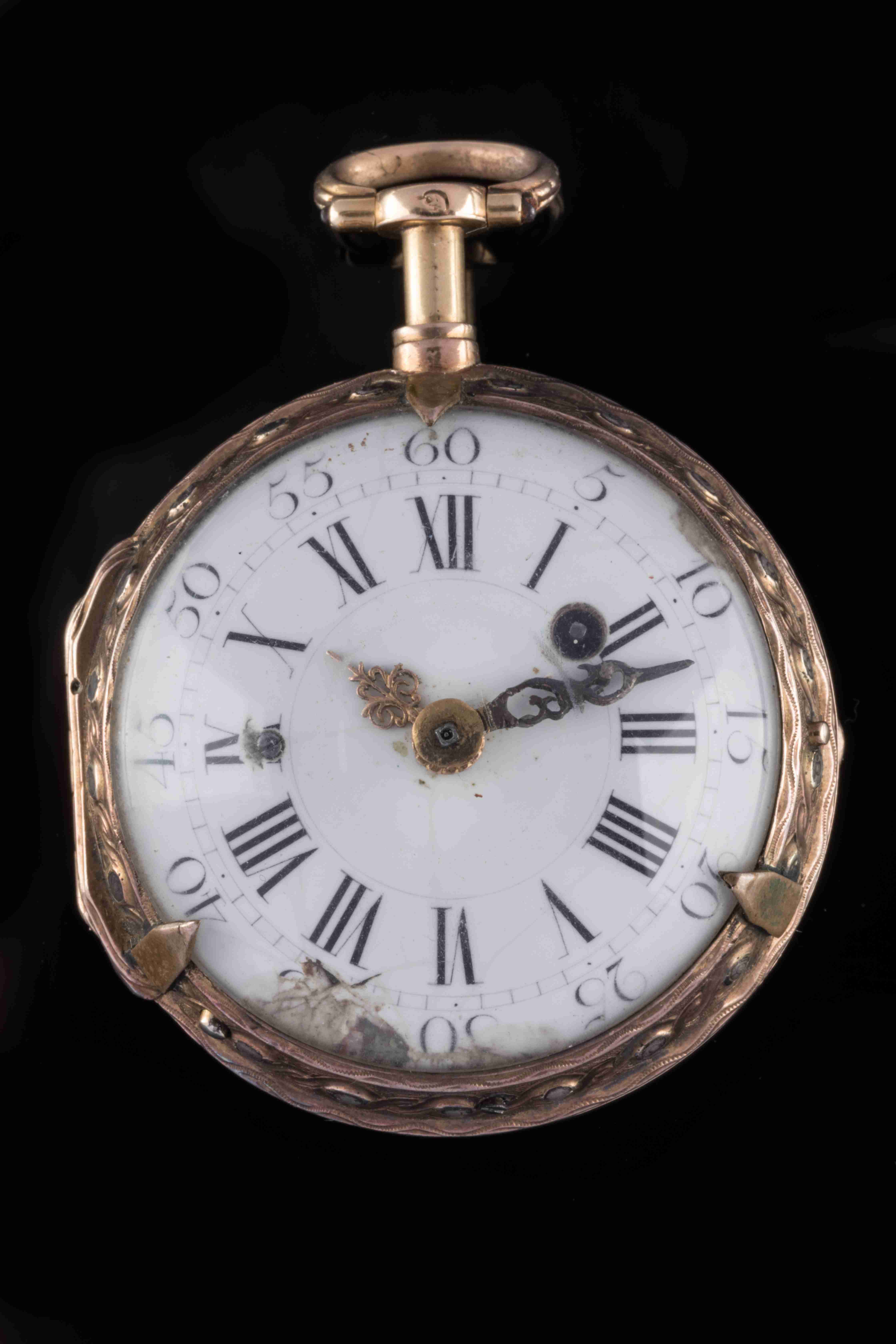 Diamètre : 4,5 cm. Poids brut de l'ensemble : 78,16 g. (Accidents et manques au cadran, lunette présentant trois pattes de fixation rapportées, non fonctionnelle).
