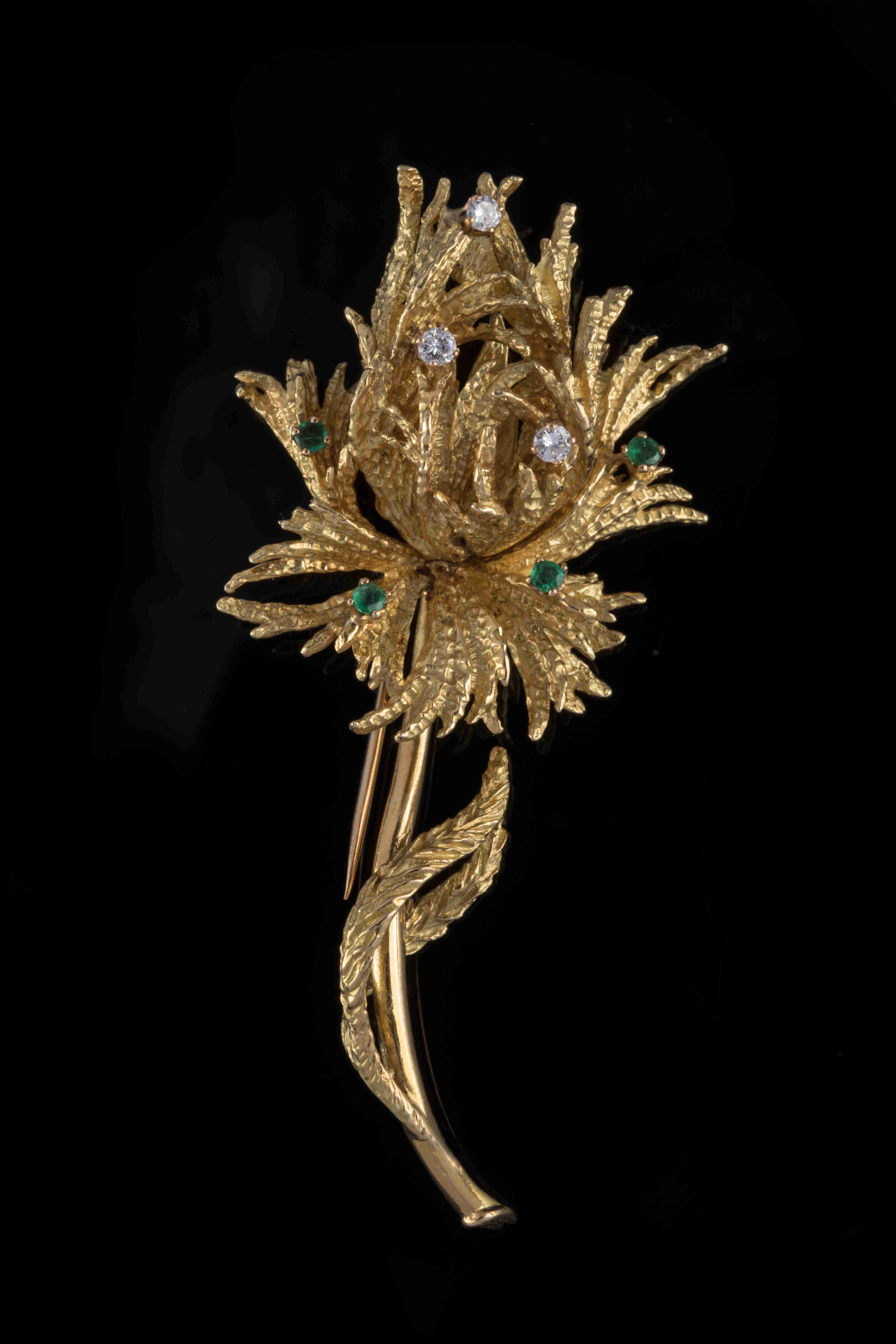 BROCHE FLEUR en or jaune amati et bruni ornée de trois petits DIAMANTS et quatre petites EMERAUDES taille ronde.