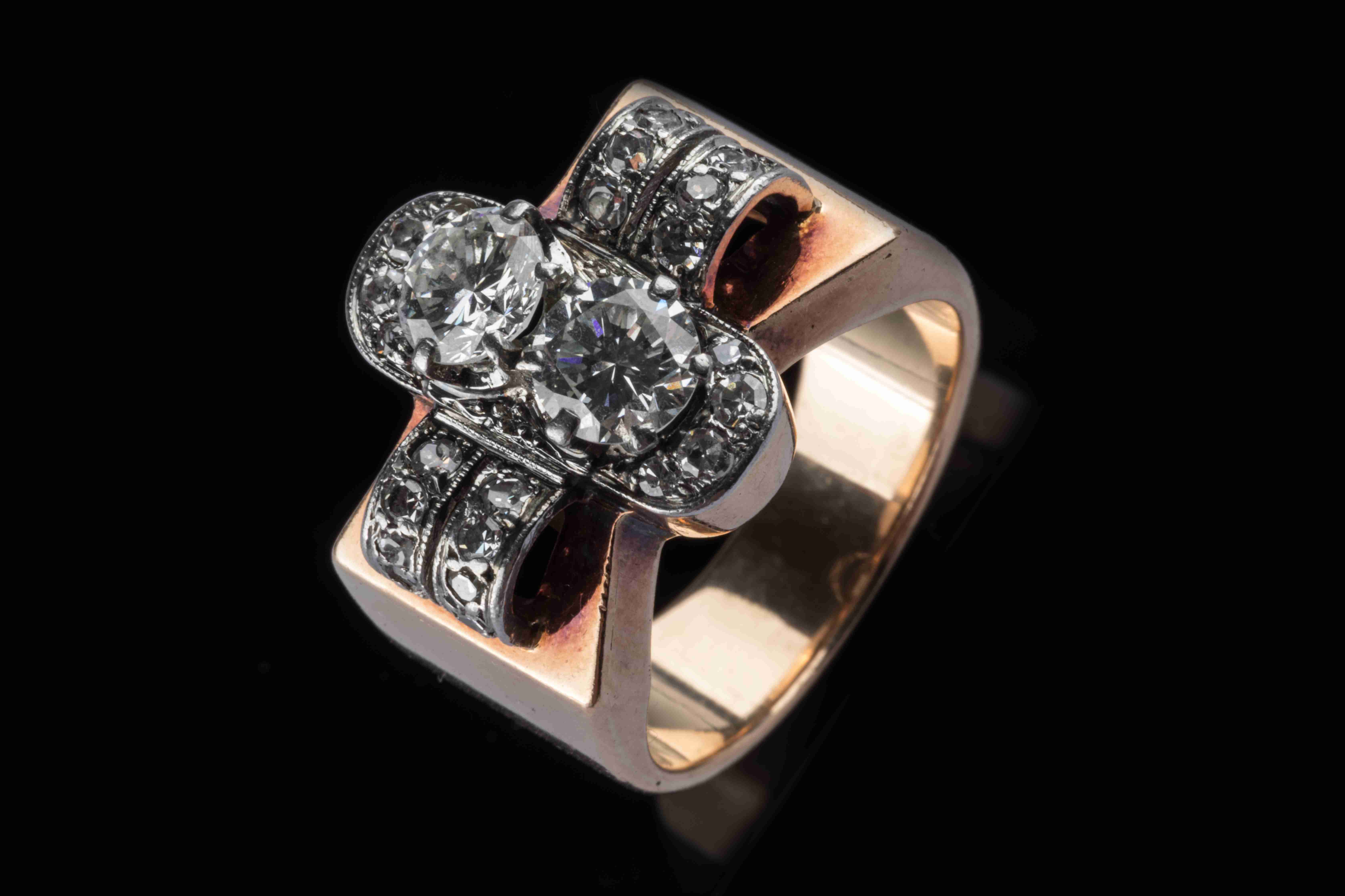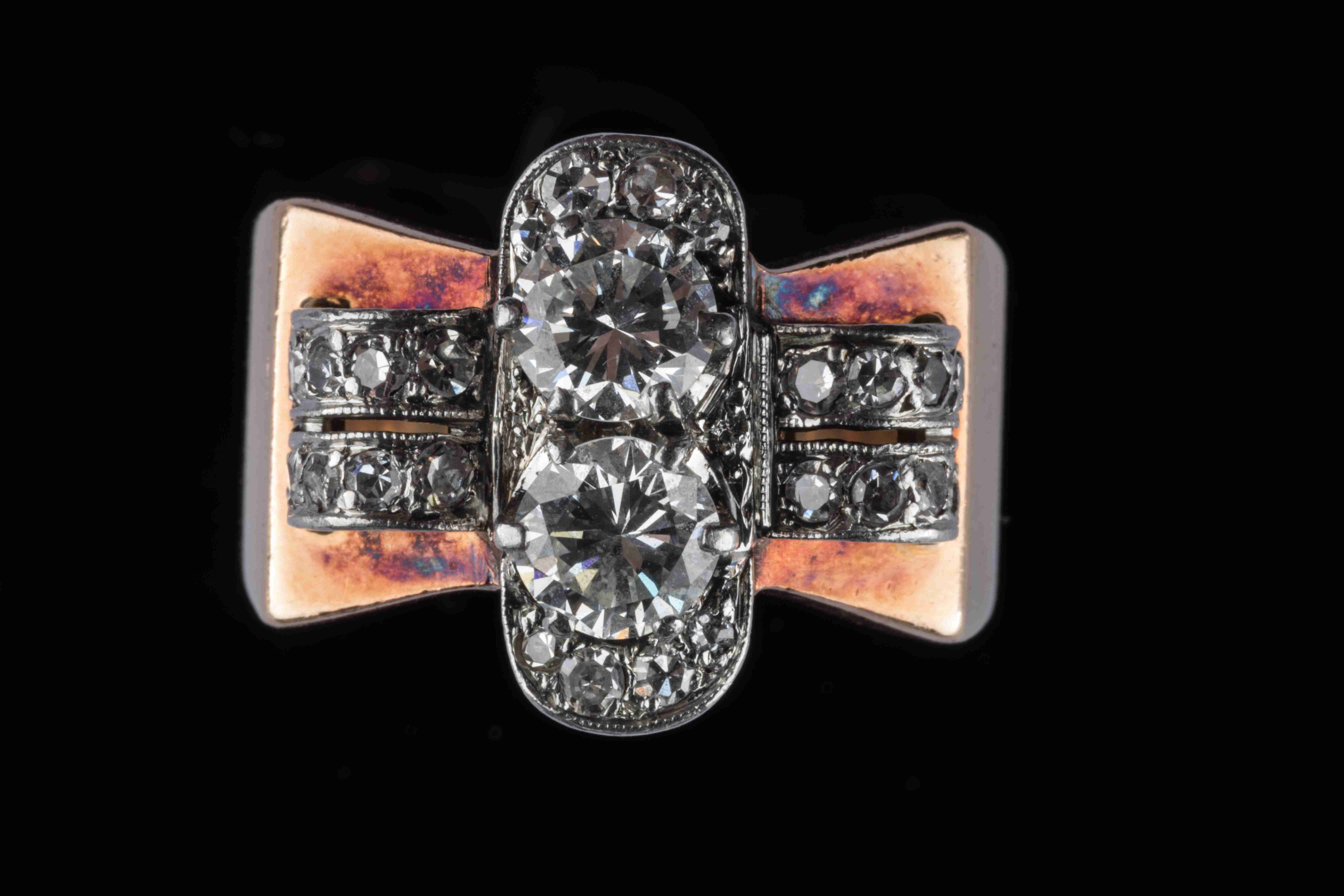 BAGUE noeud en or jaune ornée d'un motif géométrique en platine serti de DIAMANTS ronds, deux d'entre eux plus importants d'environ 0,60 carat chacun.