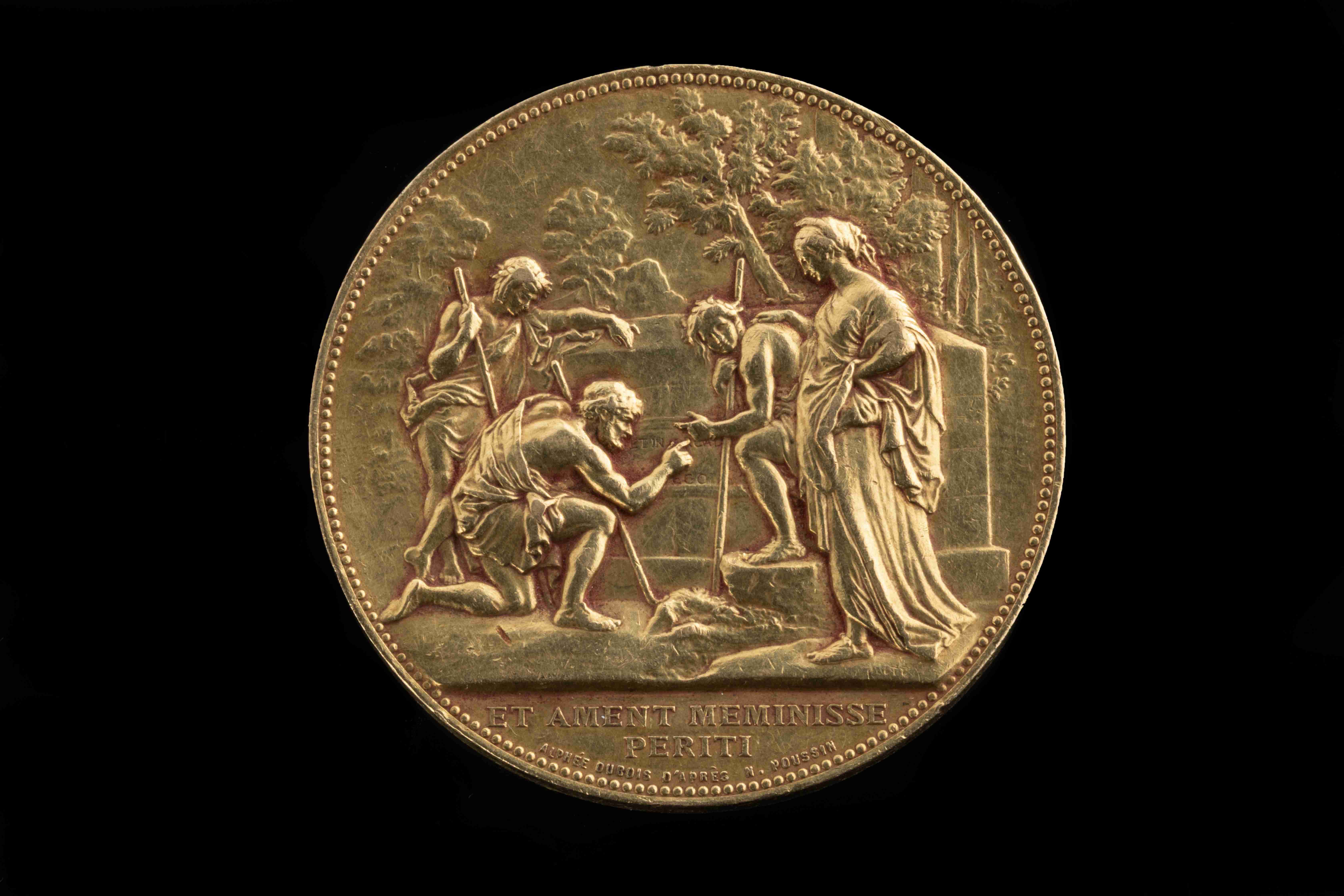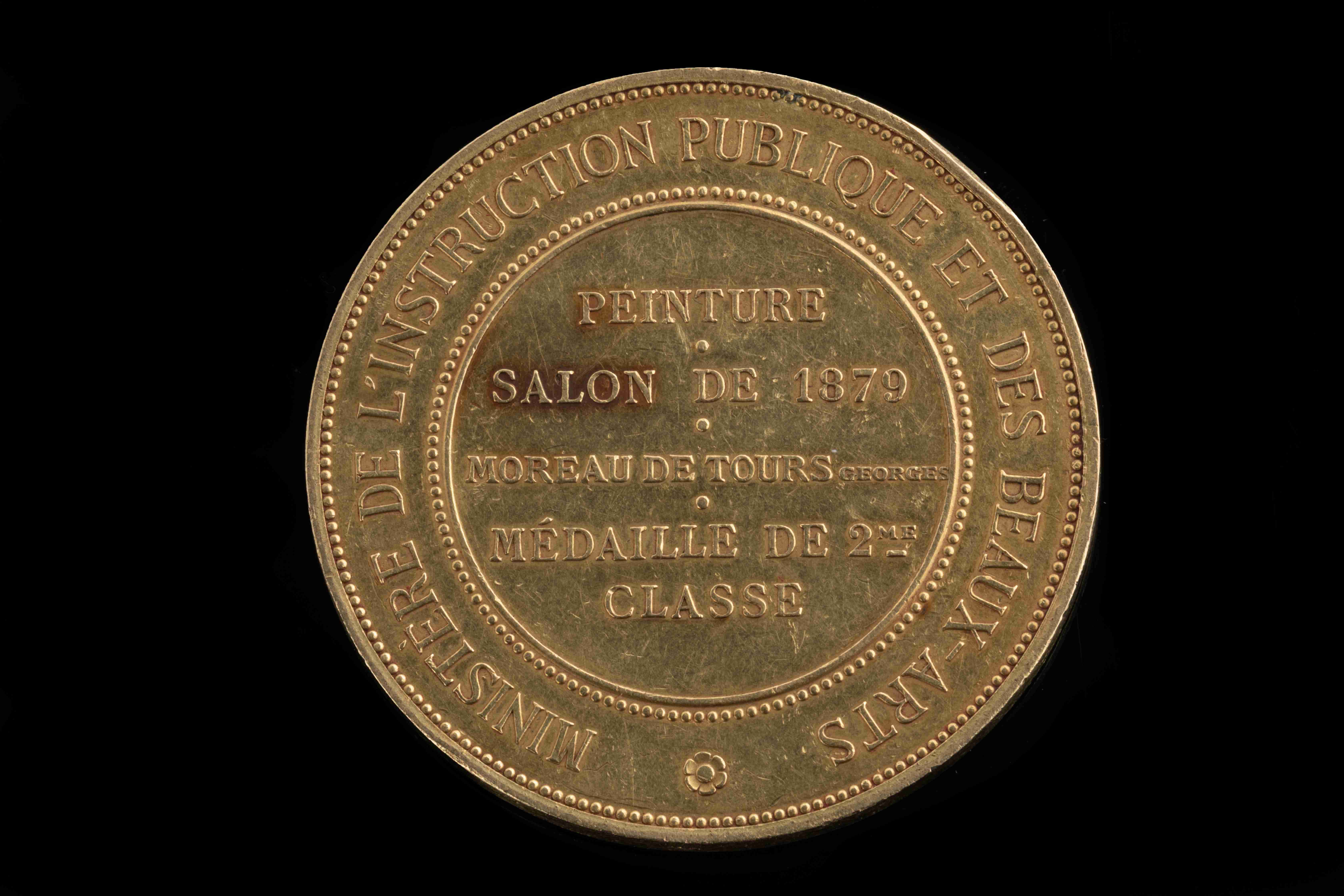 MEDAILLE en OR jaune 900°/°° de deuxième classe du Salon de 1879 décernée à Georges Moreau de Tours pour "Blanche de Castille, une extatique au XIIIe siècle". De forme ronde, elle figure, à l'avers, les Bergers d'Arcadie. A/ "Et ament meminisse periti" / Alphonse Dubois d'après N. Poussin". R/ "Ministère de l'instruction publique et des Beaux-Arts / Peinture / Salon de 1879 / Moreau de Tours Georges / Médaille de 2me / Classe".