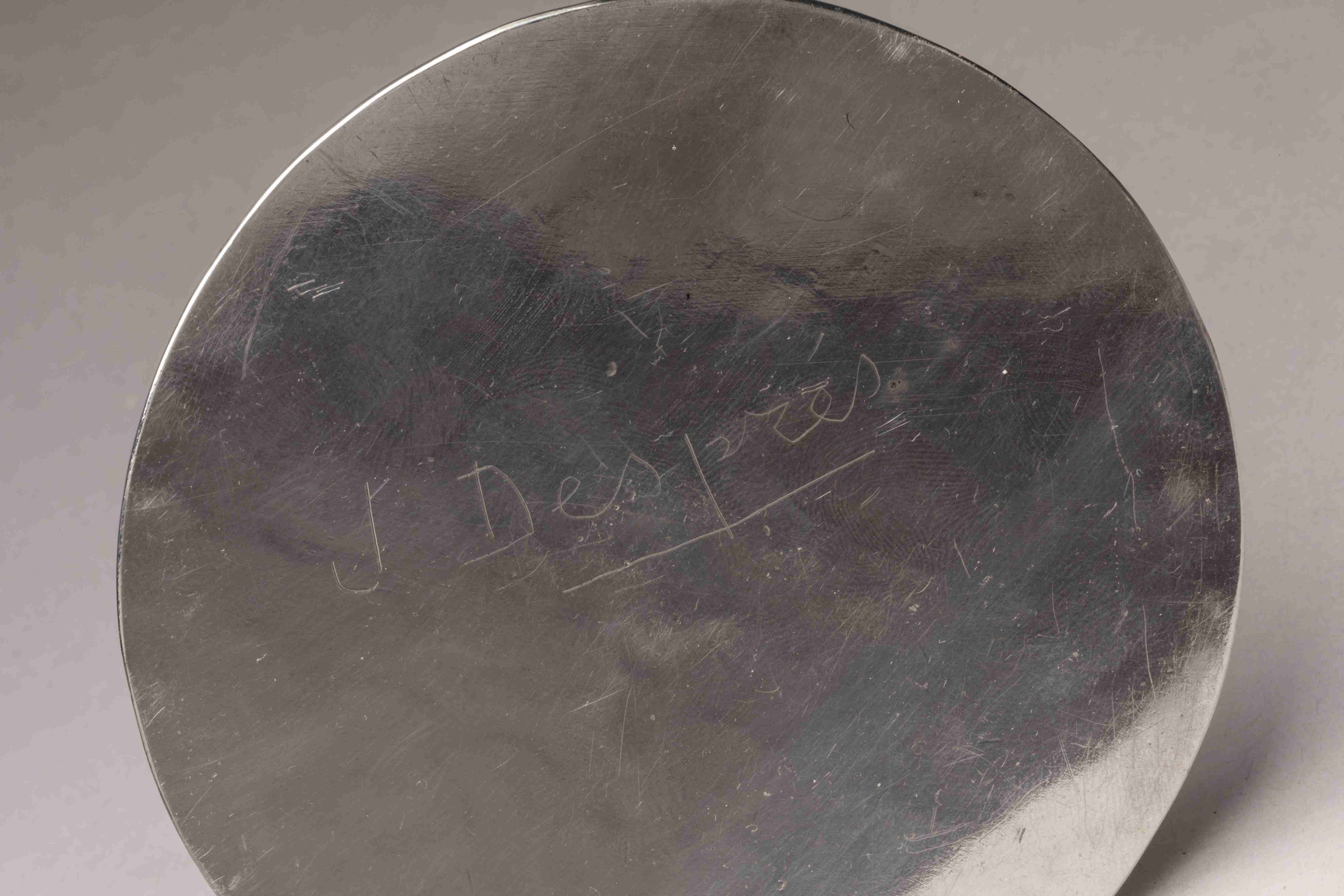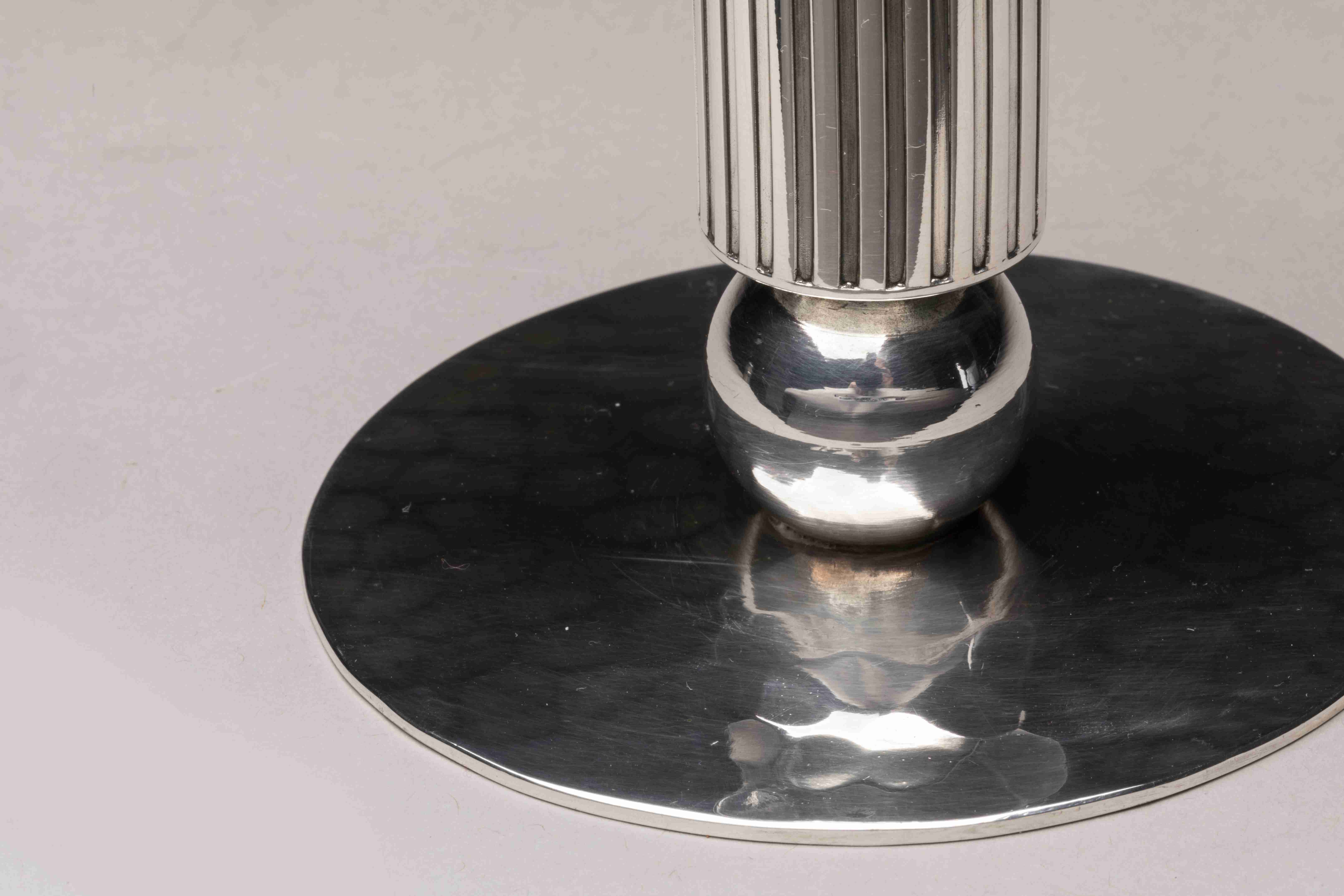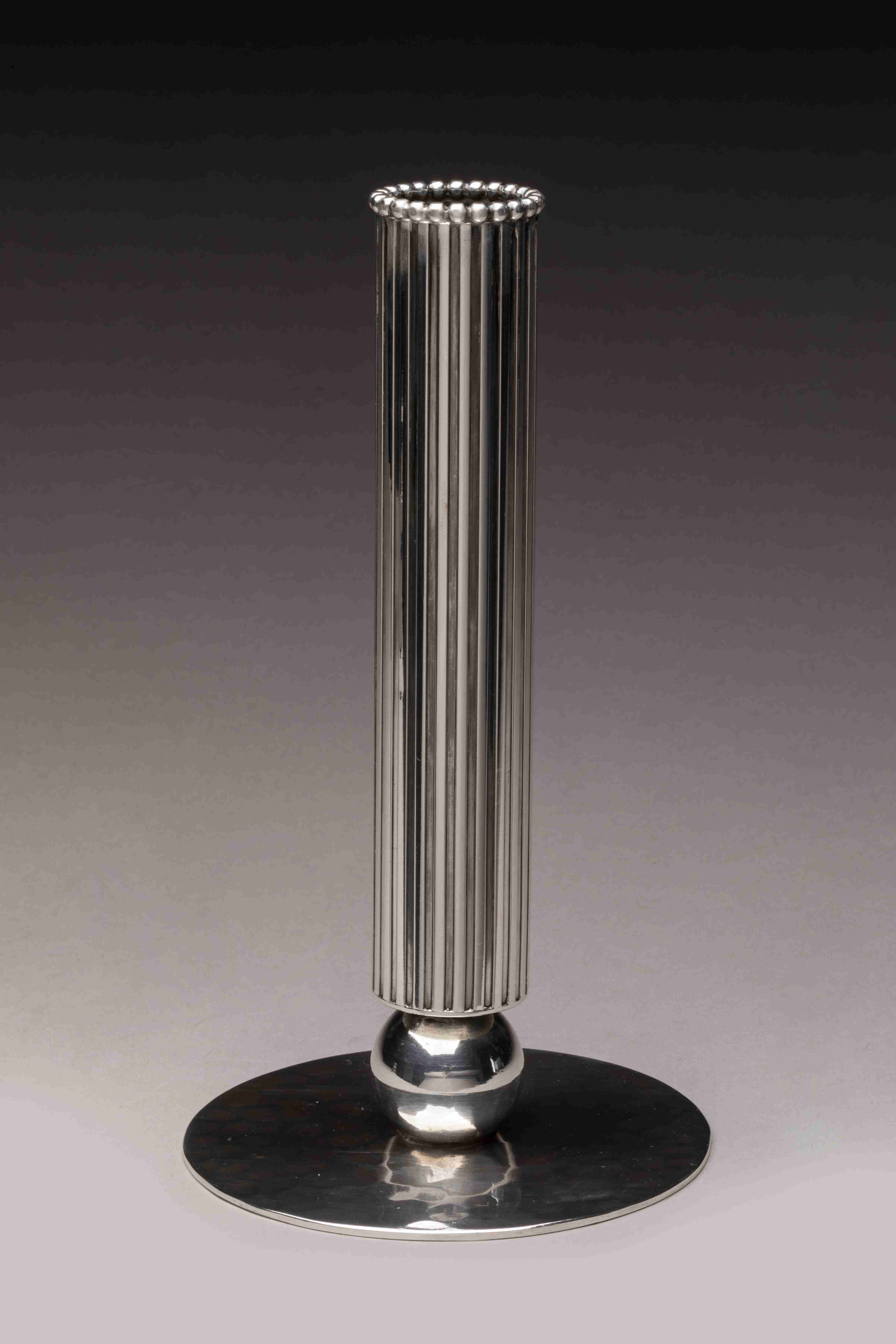Jean DESPRES (Souvigny, 1889 - Avallon, 1980) VASE SOLIFLORE en métal argenté. Fût tubulaire cannelé terminé...