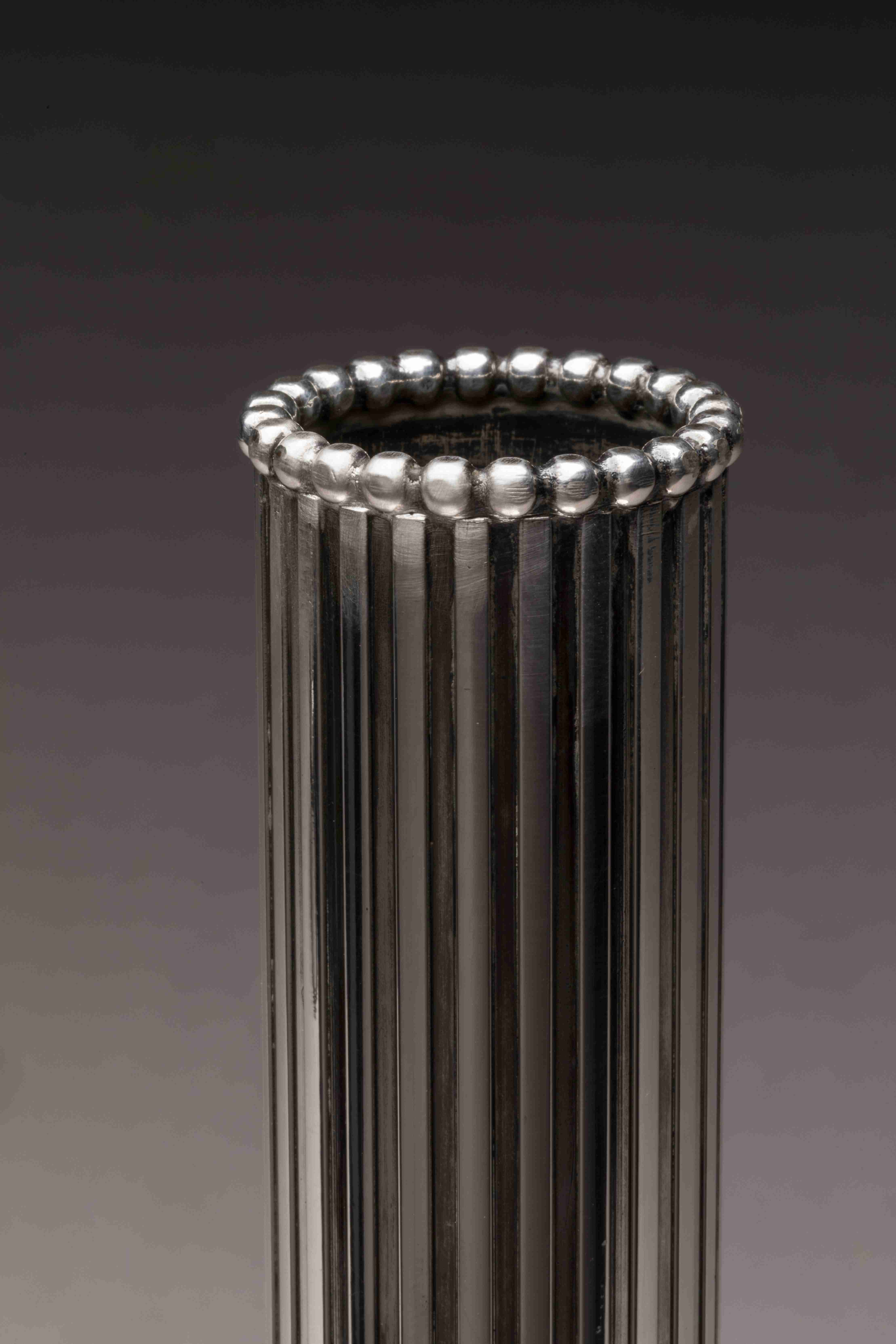 VASE SOLIFLORE en métal argenté. Fût tubulaire cannelé terminé par une sphère. Le bord orné d'un rang de billes. Il repose sur une base circulaire martelée. Signé.