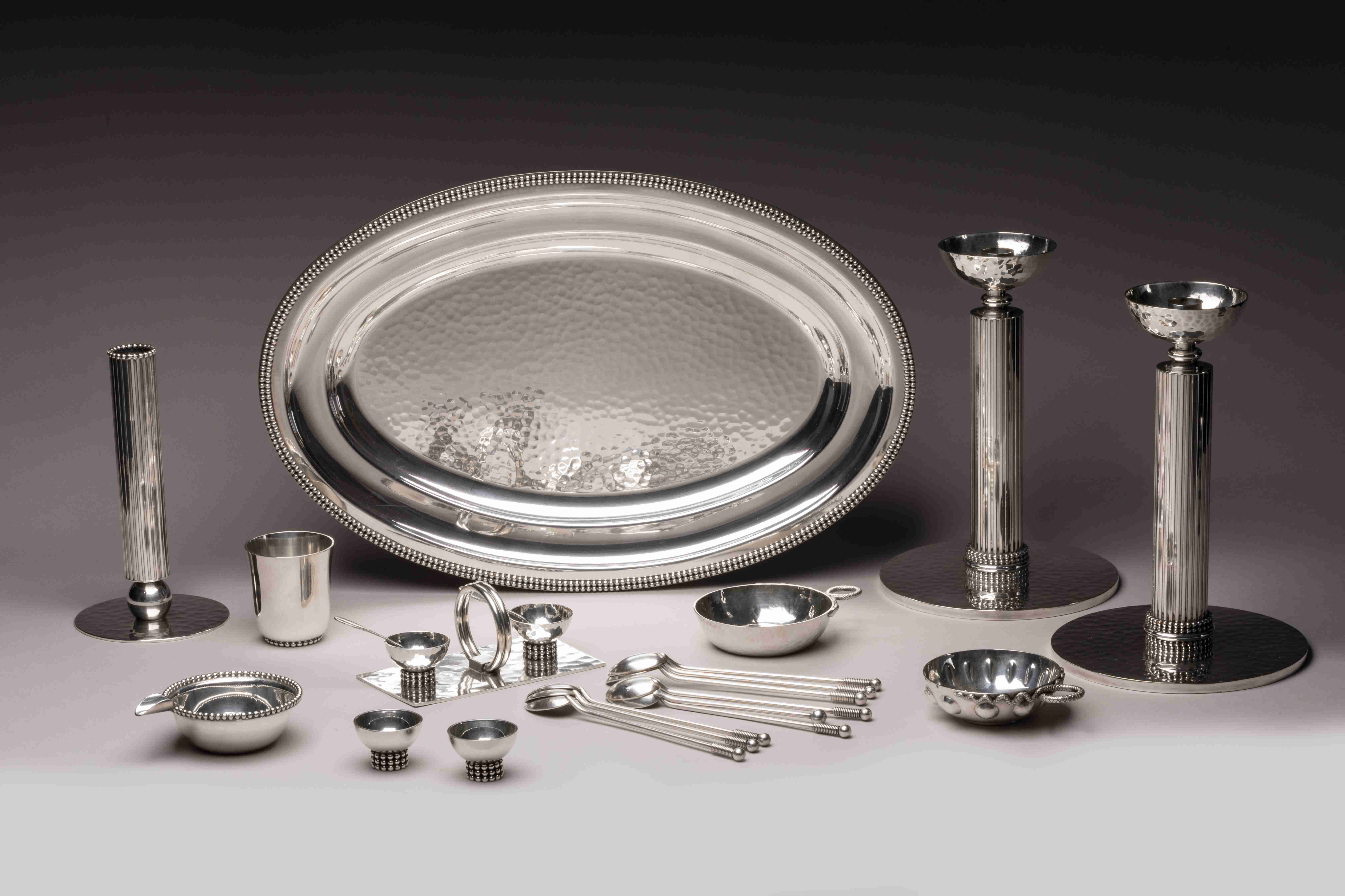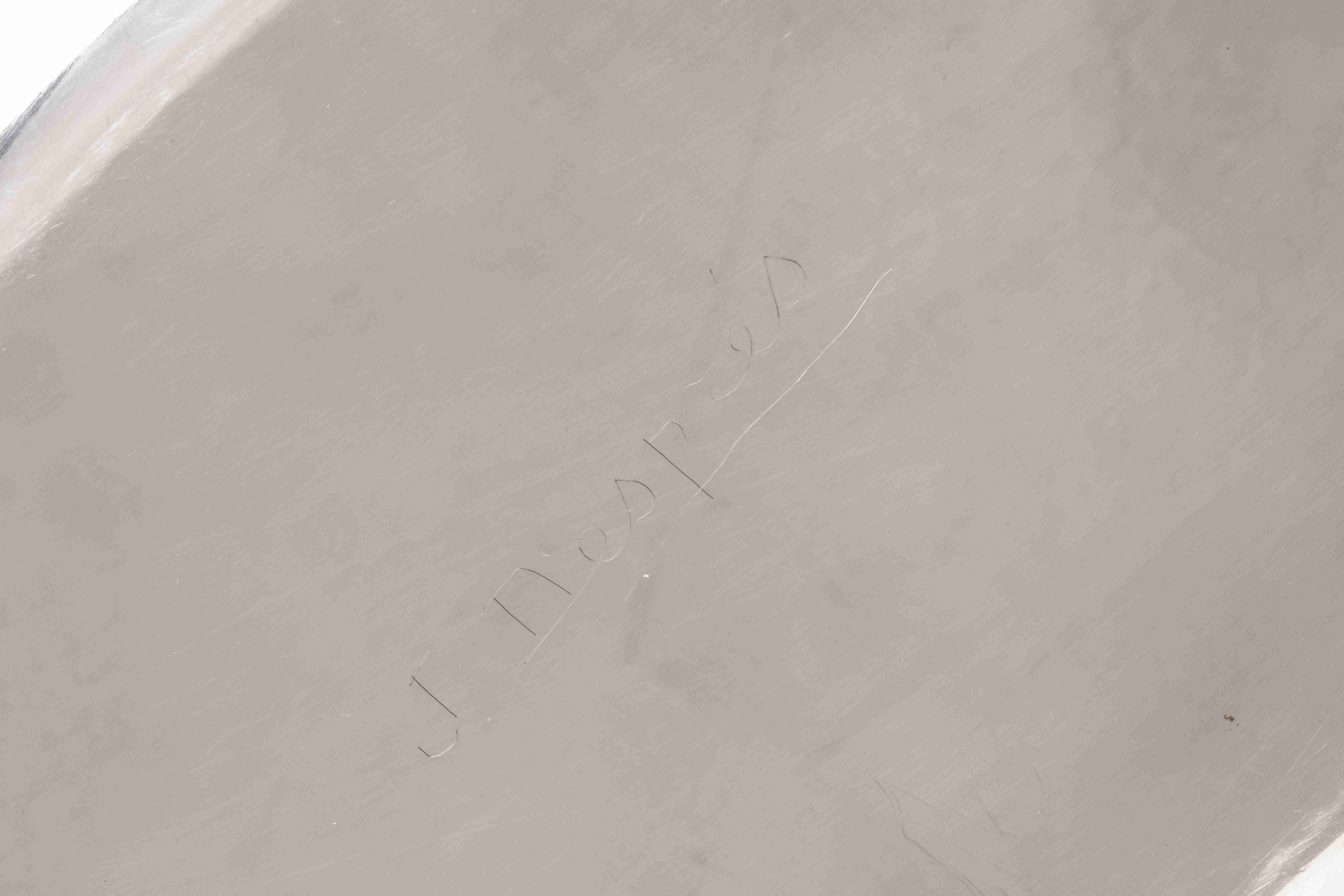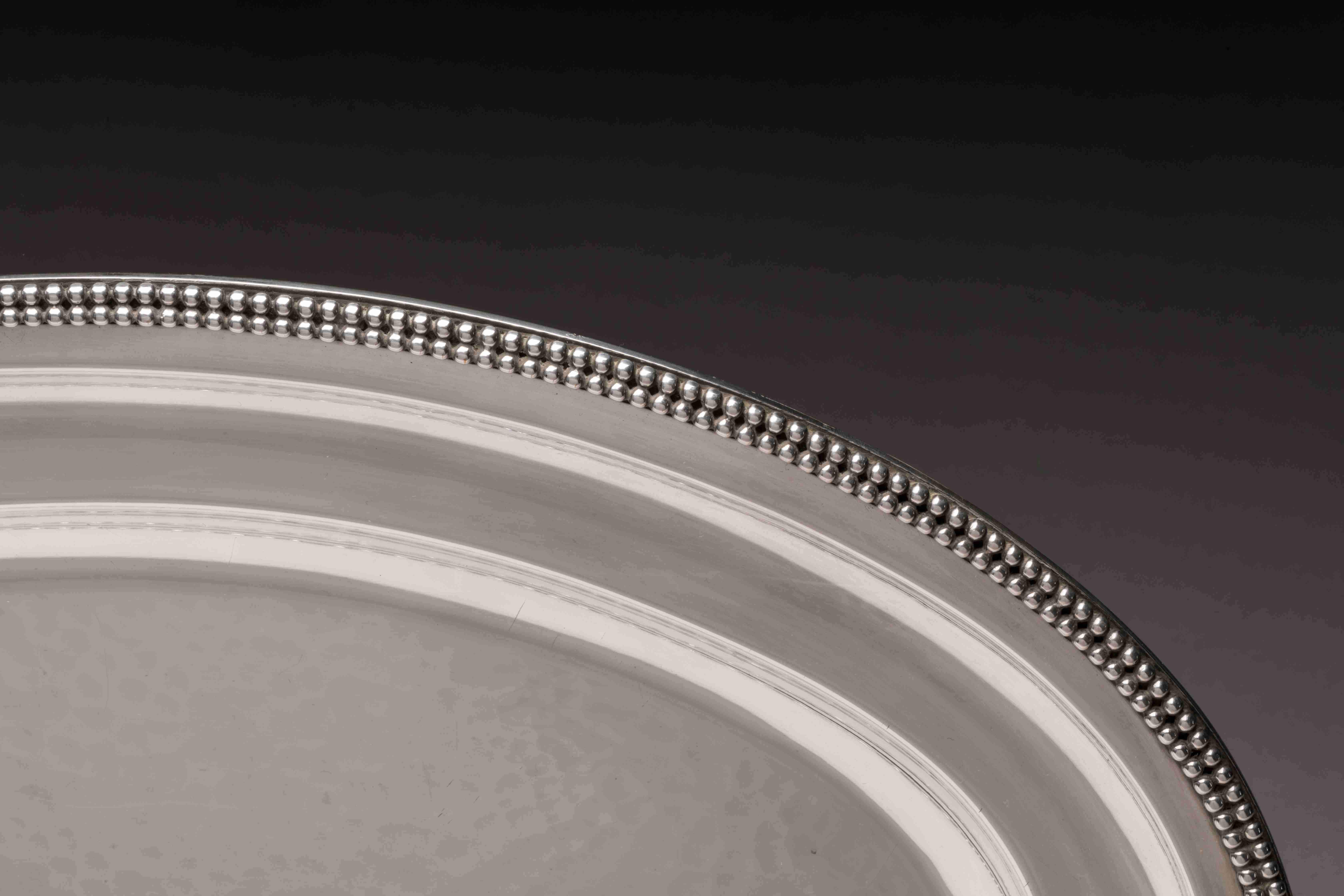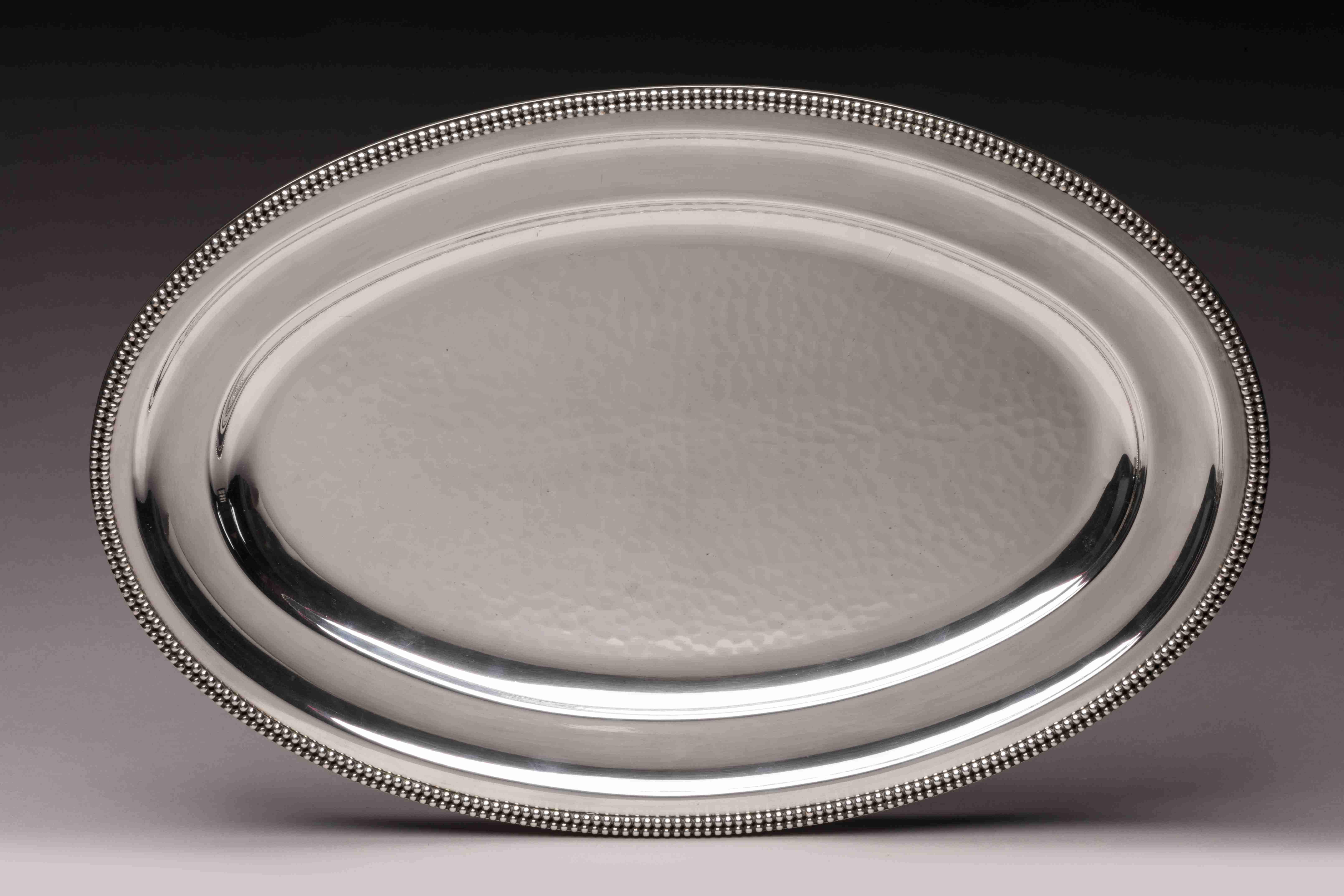 PLAT de forme ovale en métal argenté. Bassin martelé et aile bordée d'un double rang de billes. Signé.