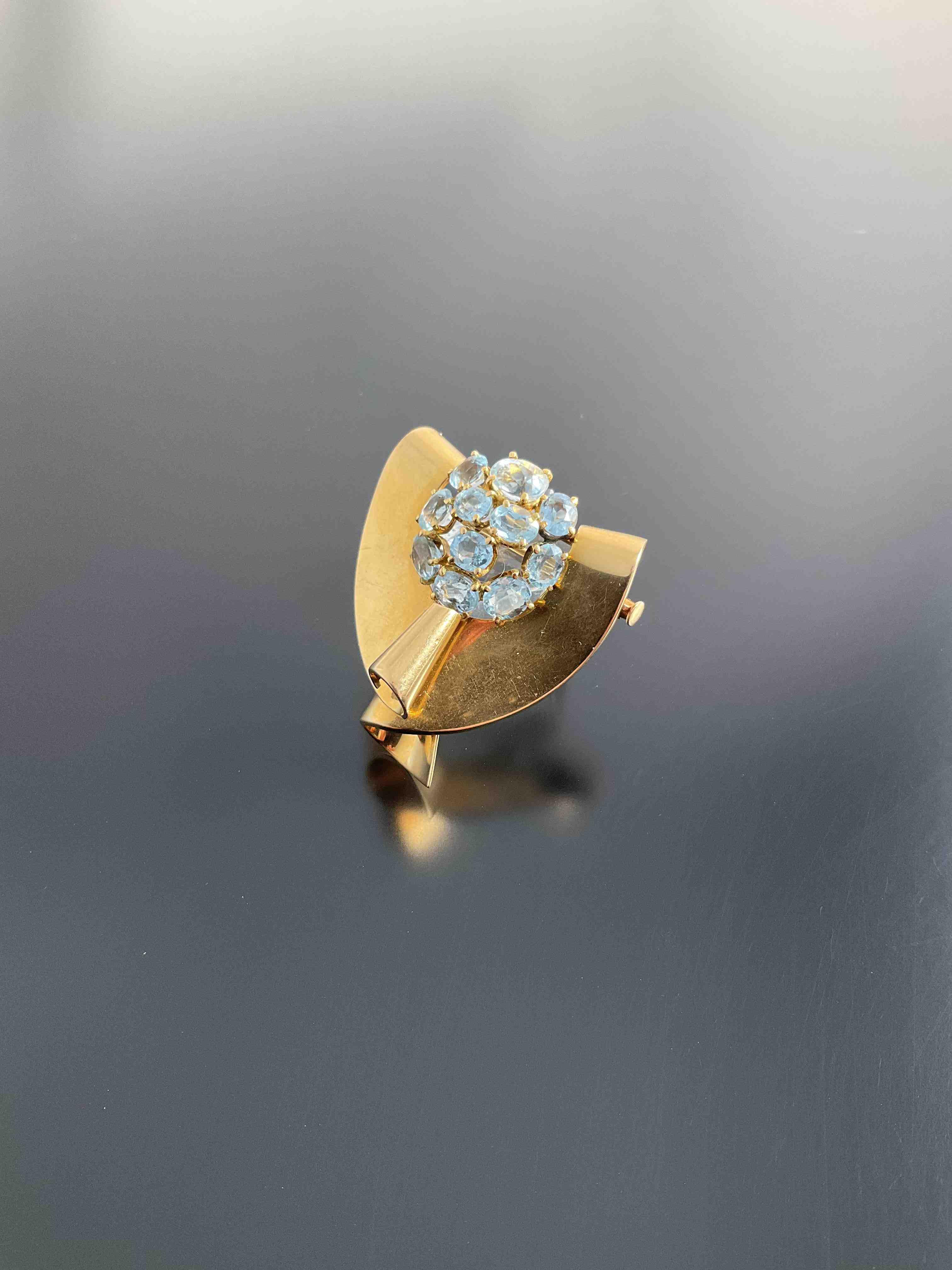 BROCHE en or jaune figurant un drapé orné de onze AIGUES-MARINES (?) taille ovale.