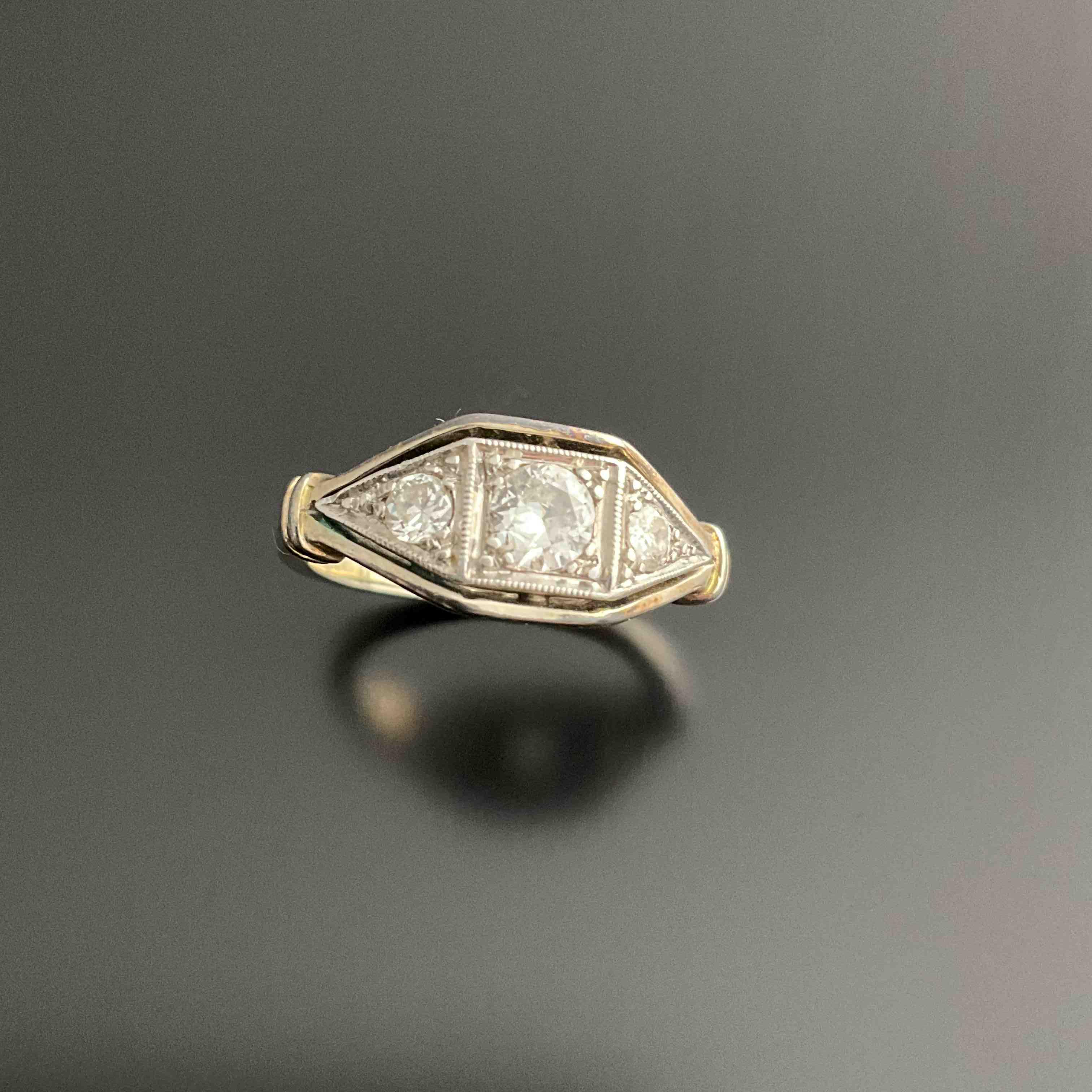 BAGUE en or gris à plateau de forme losangique orné de trois DIAMANTS, celui du centre plus important pour environ 0,25 carat.