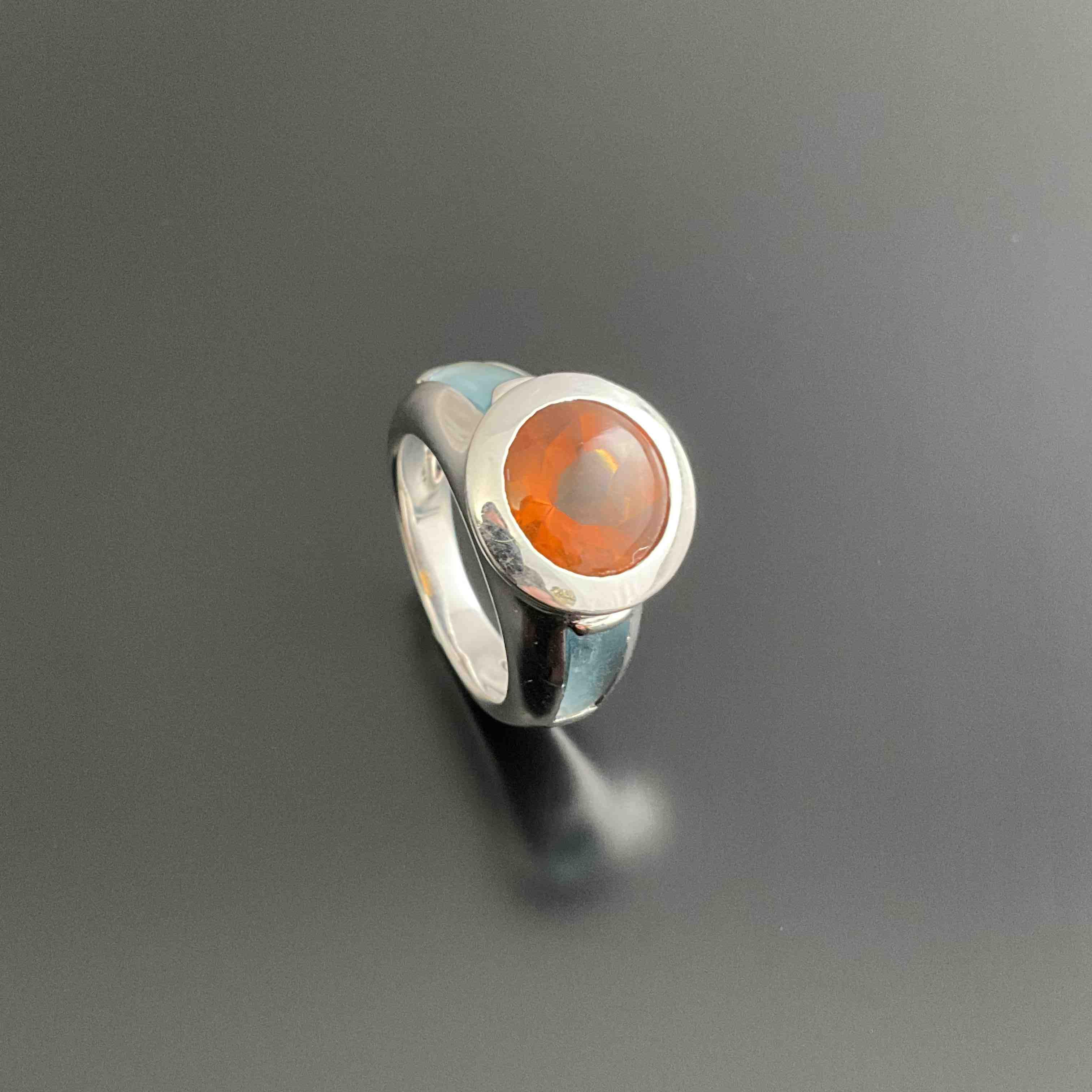 BAGUE en or gris ornée en serti clos d'une CITRINE ronde. Elle est épaulée de deux plaques de pierre bleutée.