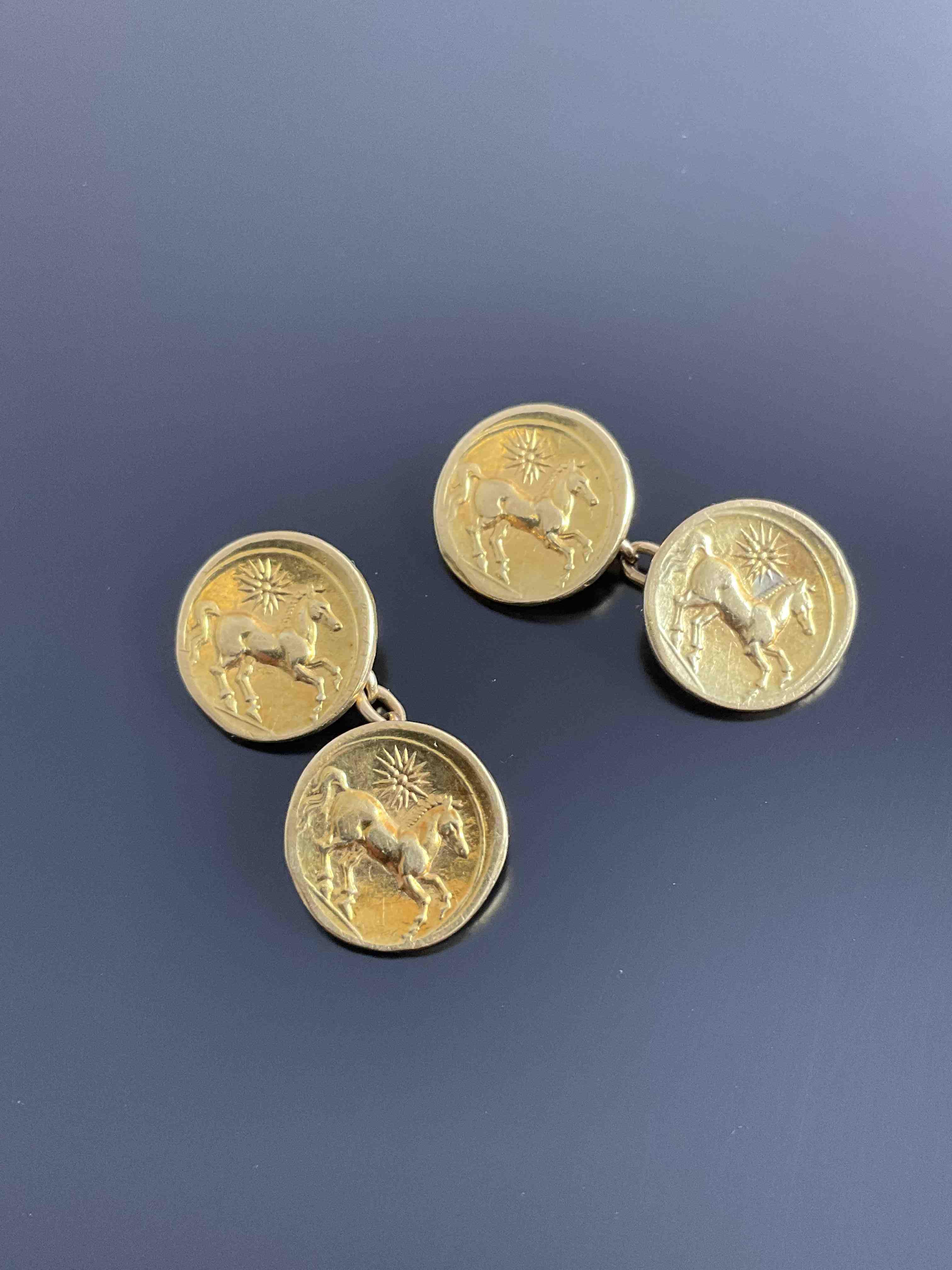 PAIRE de BOUTONS DE MANCHETTES en or jaune adoptant la forme d'une monnaie antique figurant un cheval se cabrant sous un soleil.