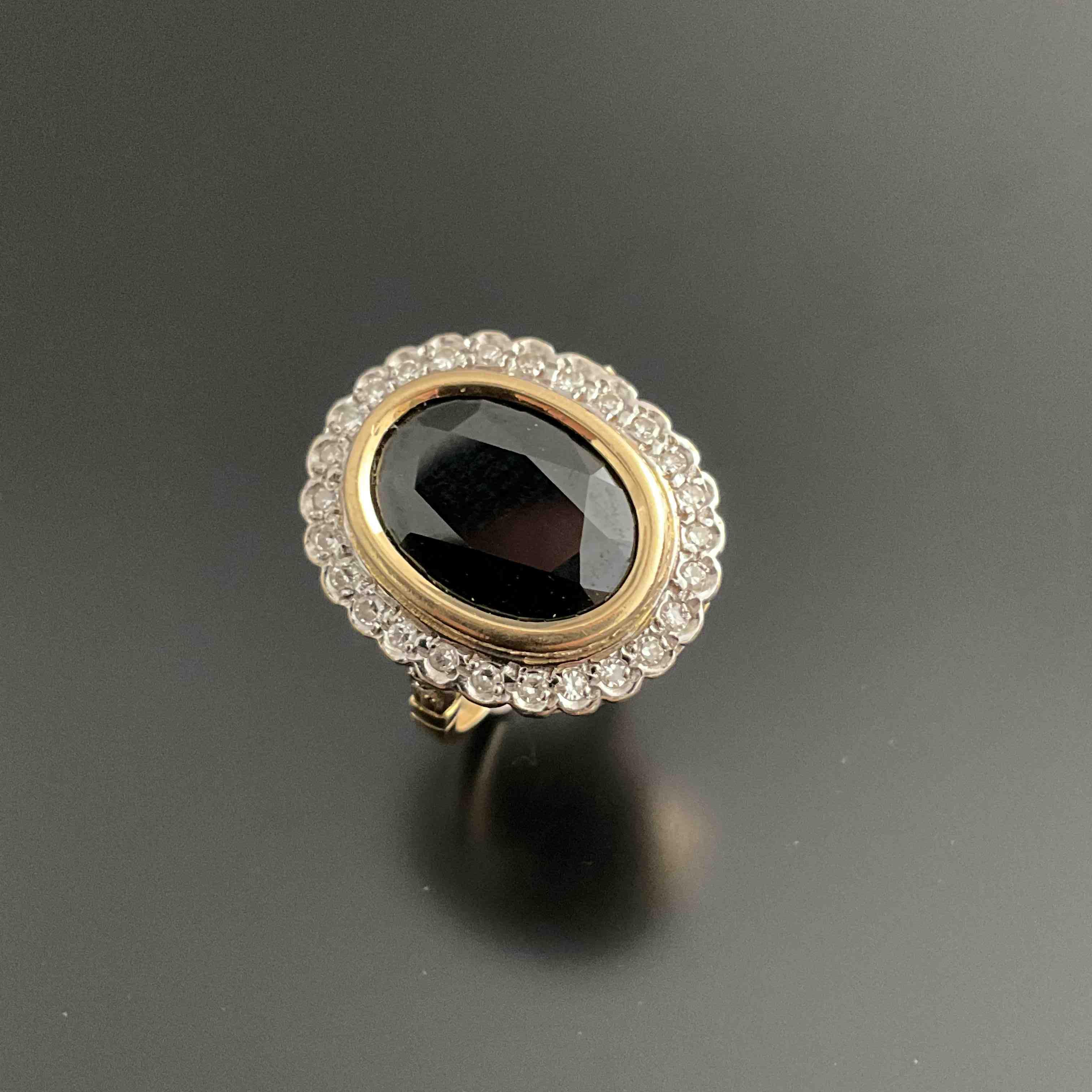 BAGUE pompadour en or jaune ornée d'un SAPHIR taille ovale dans un entourage de BRILLANTS....