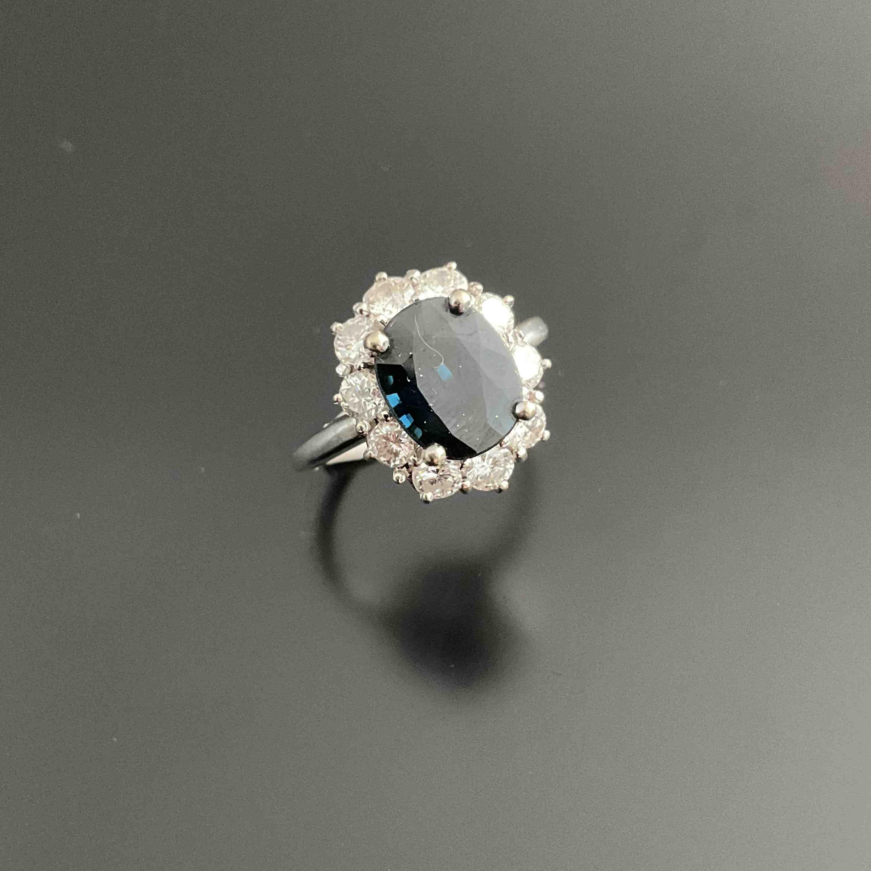 BAGUE pompadour en or gris ornée d'un SAPHIR taille ovale dans un entourage de 10 DIAMANTS. Tour de doigt : 50. Poids brut : 4,00 g.