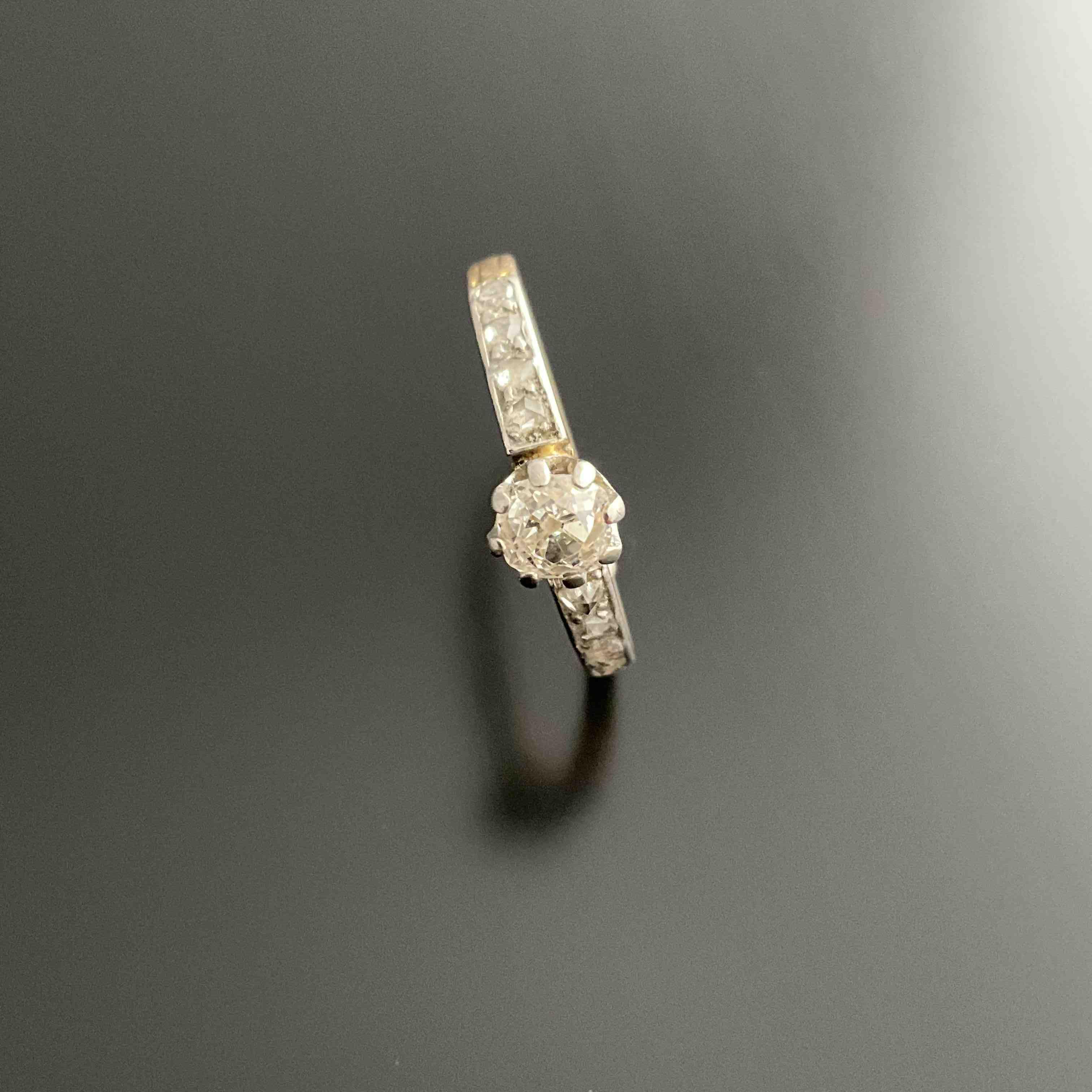 BAGUE en or jaune et gris ornée d'un DIAMANT solitaire taille ancienne d'environ 0,25 carat. Il est épaulé de huit éclats de DIAMANT.