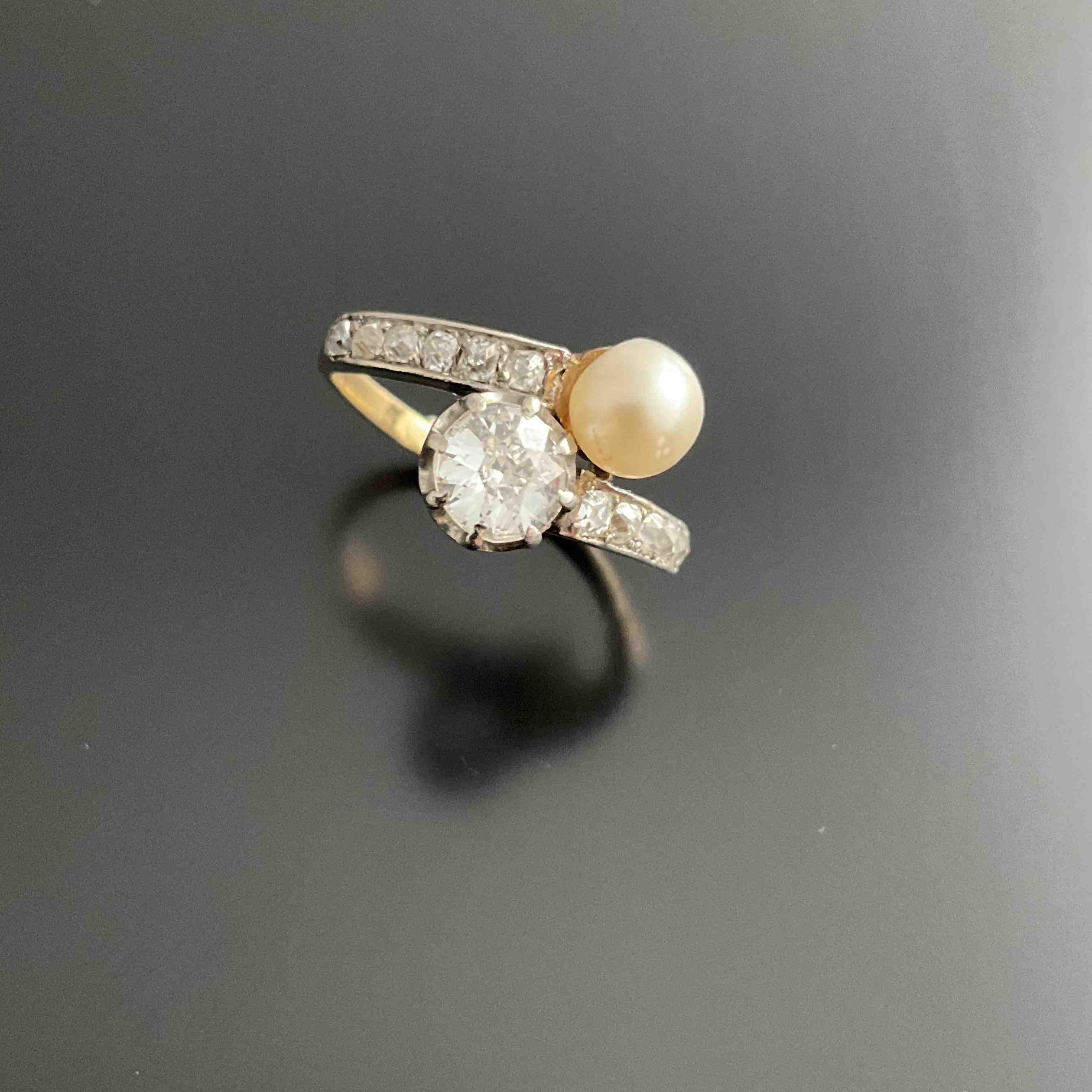 BAGUE "Vous et Moi" en or jaune et gris ornée d'un DIAMANT solitaire taille moderne d'environ 0,60 carat et d'une PERLE. Six petits DIAMANTS aux épaulements.