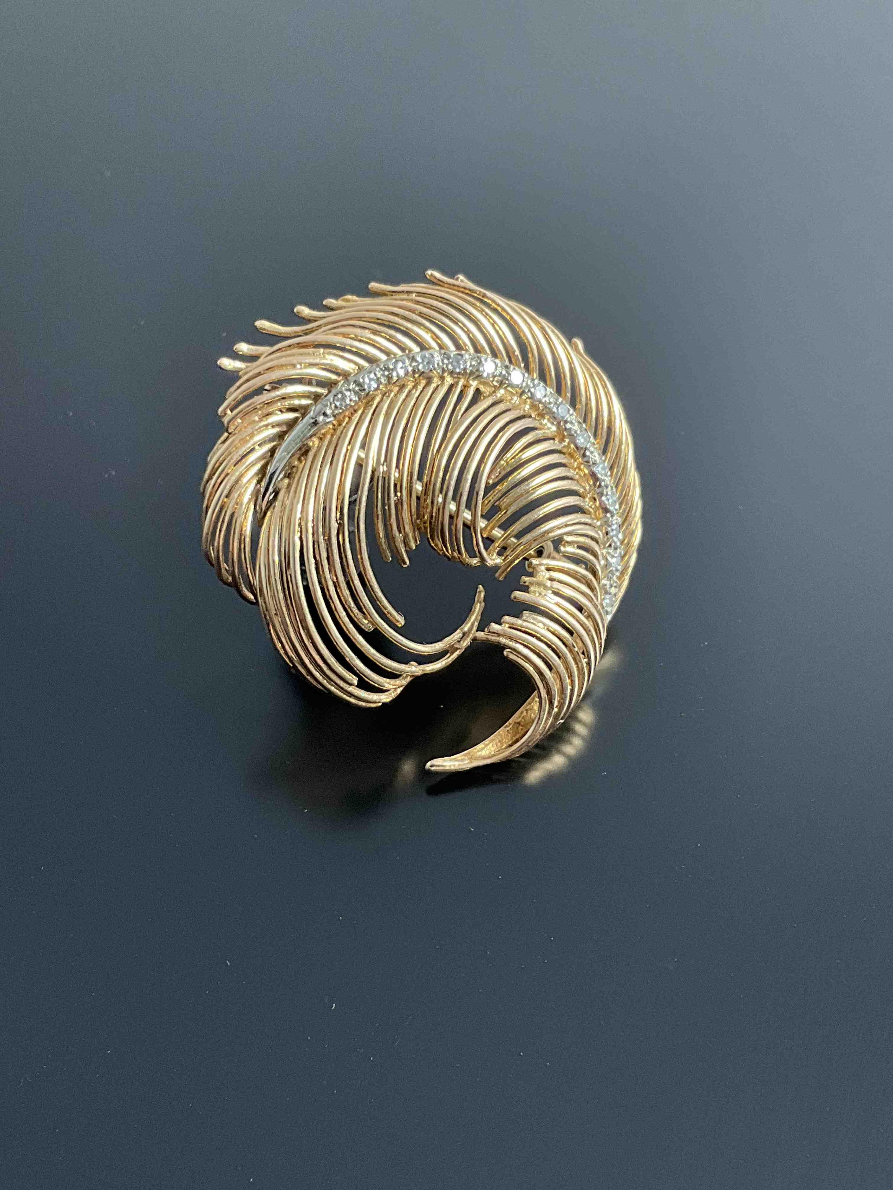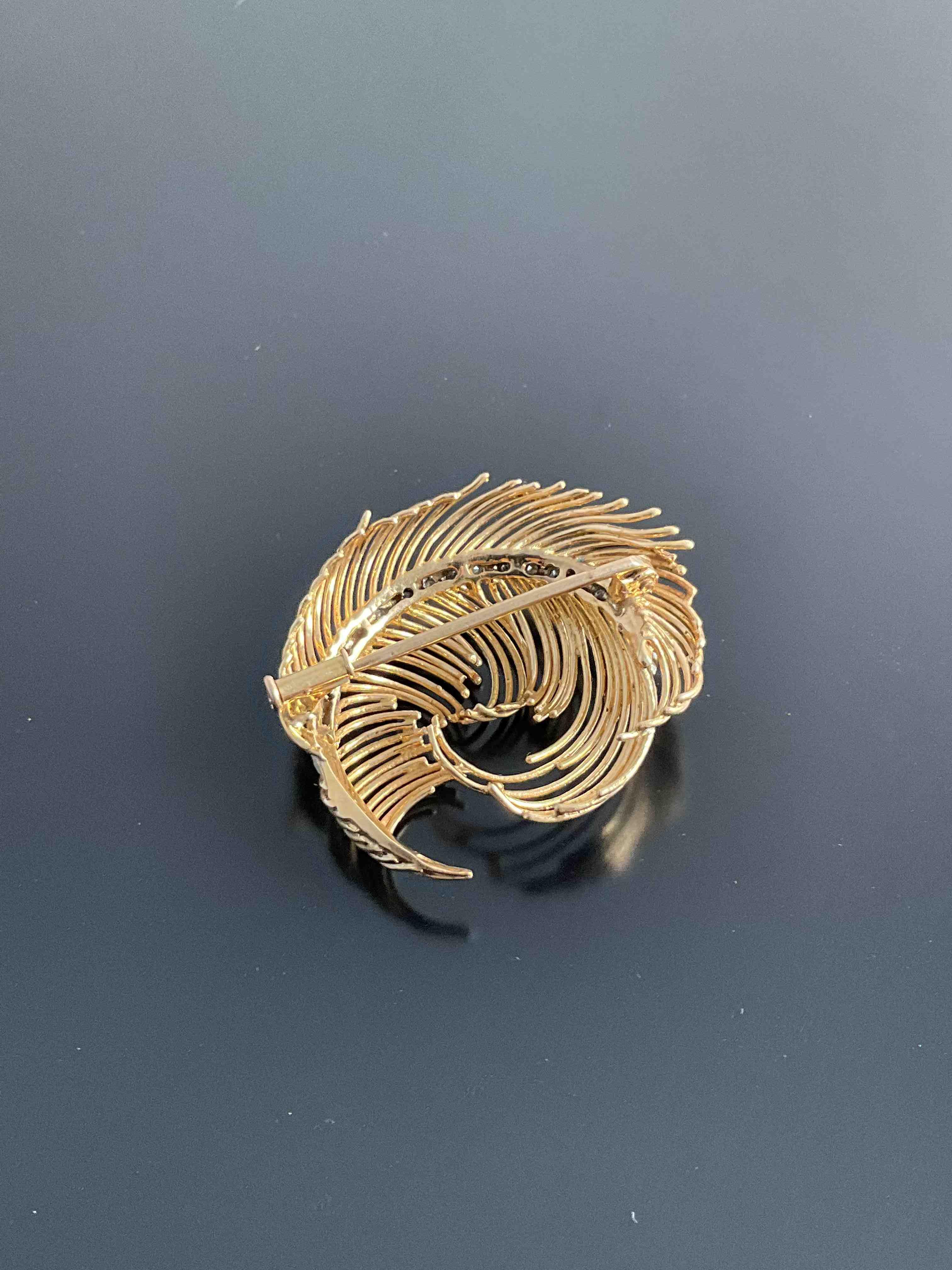 BROCHE plume en or jaune ornée de 15 petits DIAMANTS. Hauteur : 3,6 cm. Poids brut : 9,39 g.