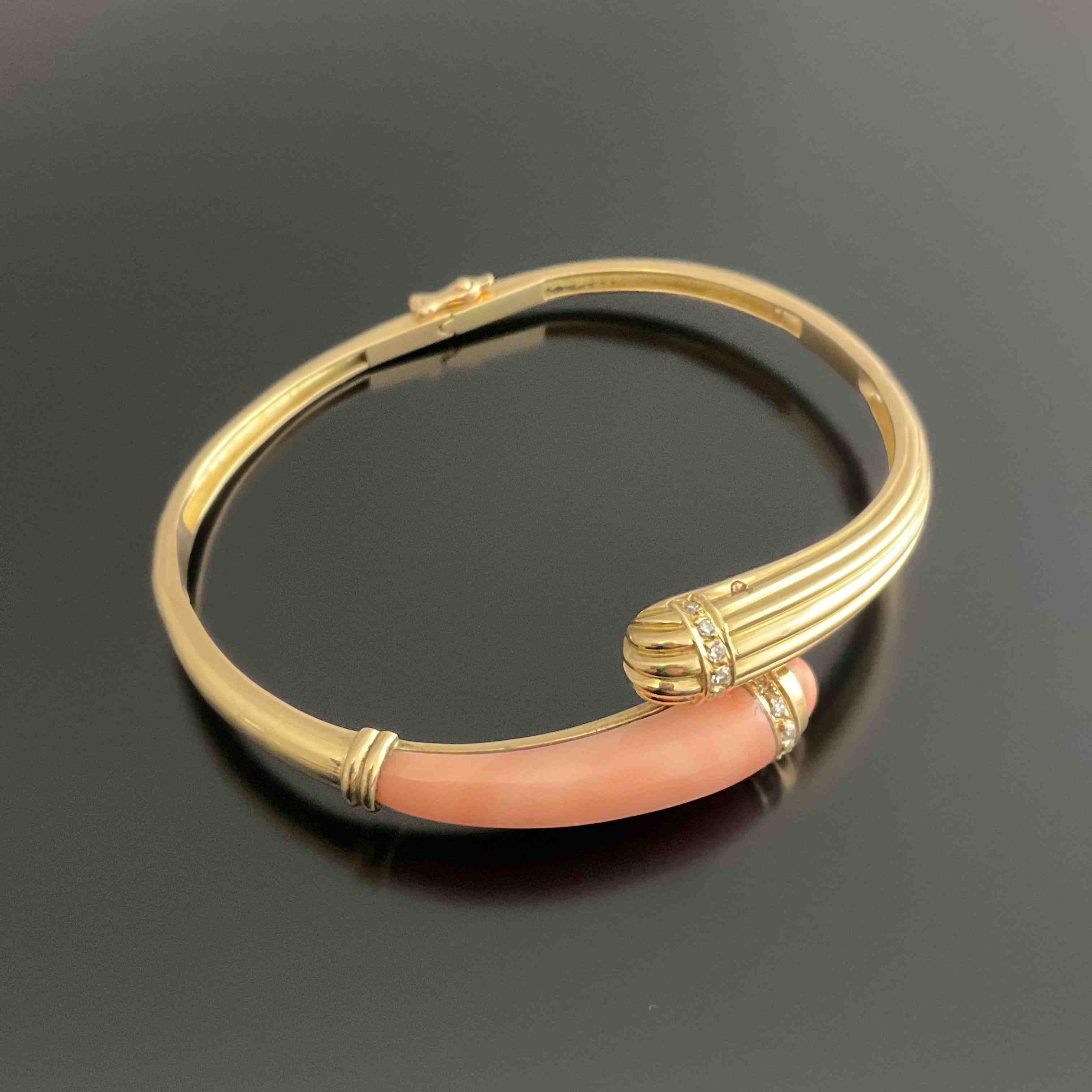 BRACELET jonc ouvrant en or jaune orné de deux éléments accolés bagués de six DIAMANTS : l'un en corail rose, l'autre en or godronné.