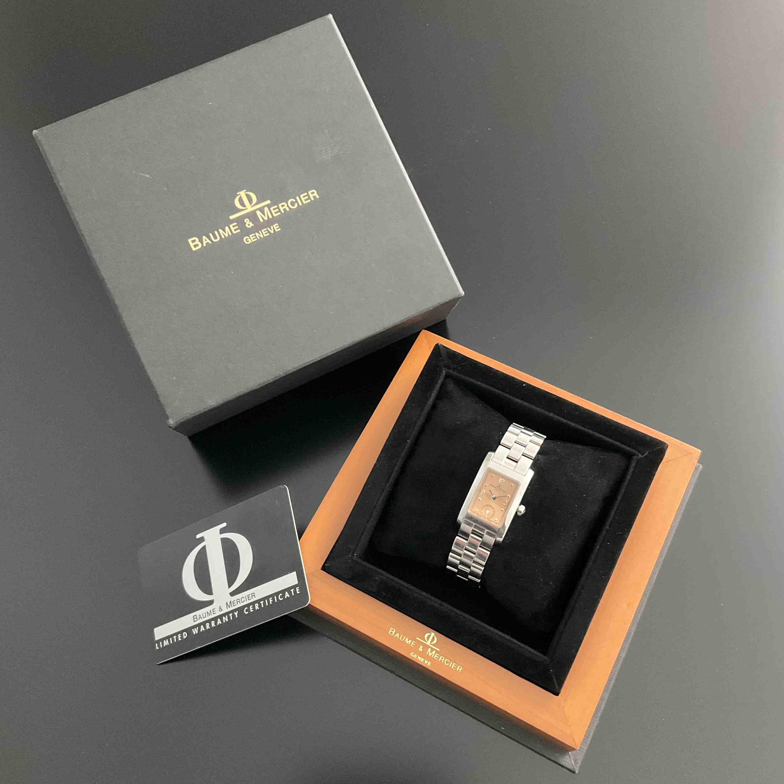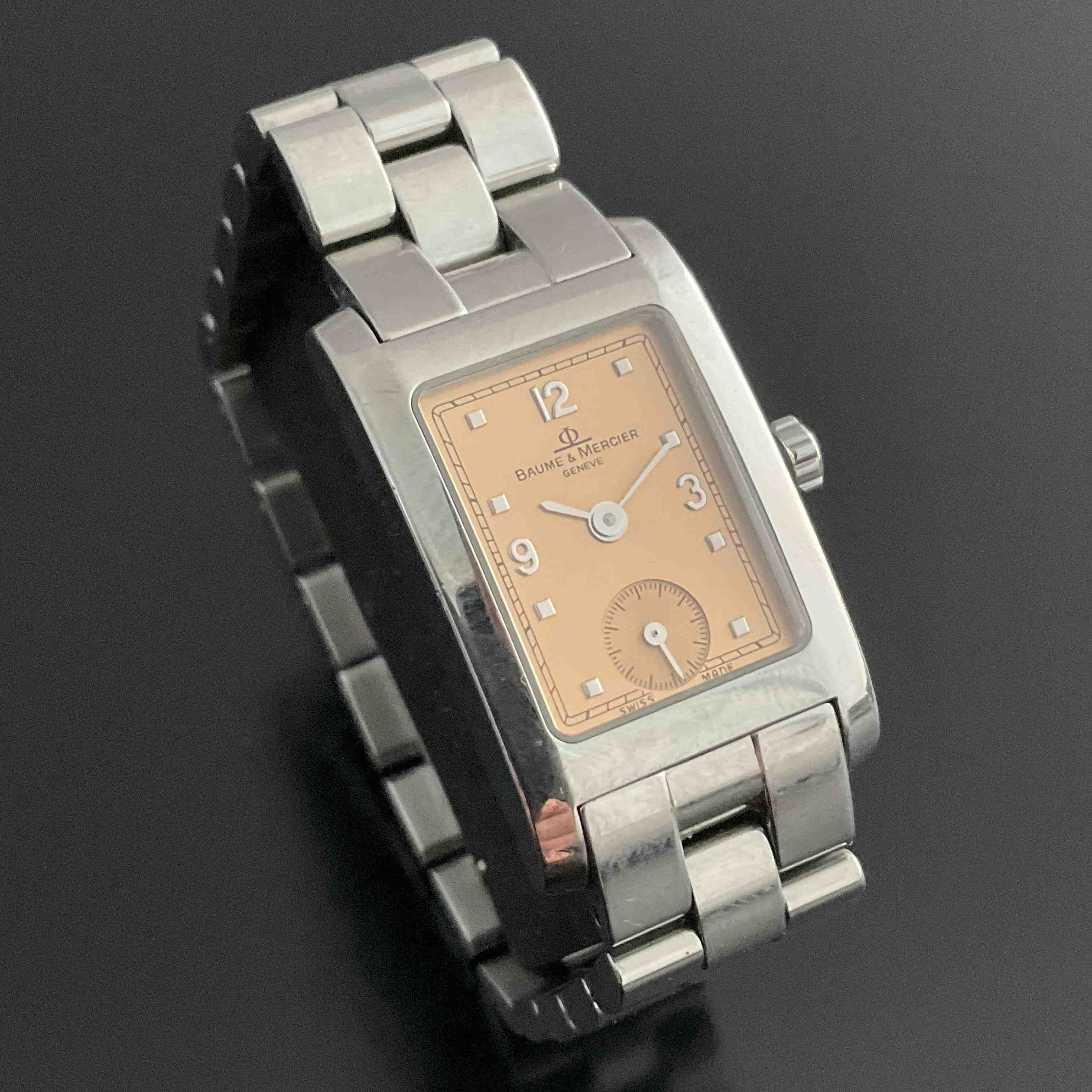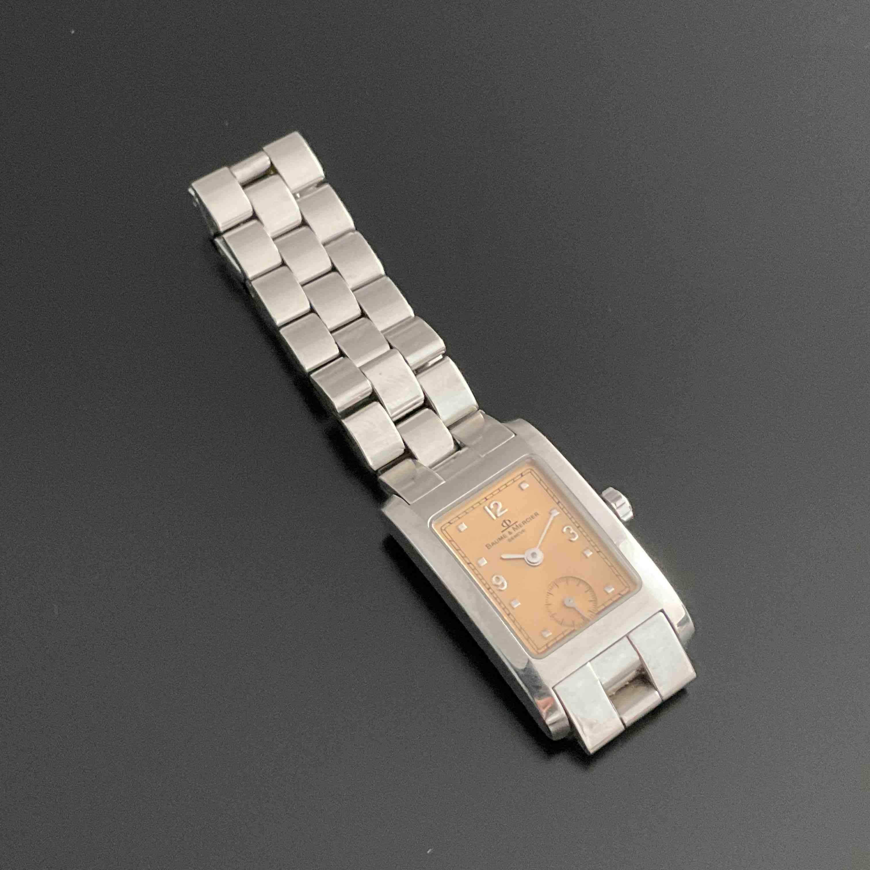 BAUME & MERCIER. MONTRE-BRACELET de dame, modèle "Hampton" en acier. Cadran double à fond rosé rayonnant. Aiguilles glaive. Mouvement à quartz. Numérotée 2845892. Bracelet articulé à boucle déployante en acier de la maison. Dans son écrin.