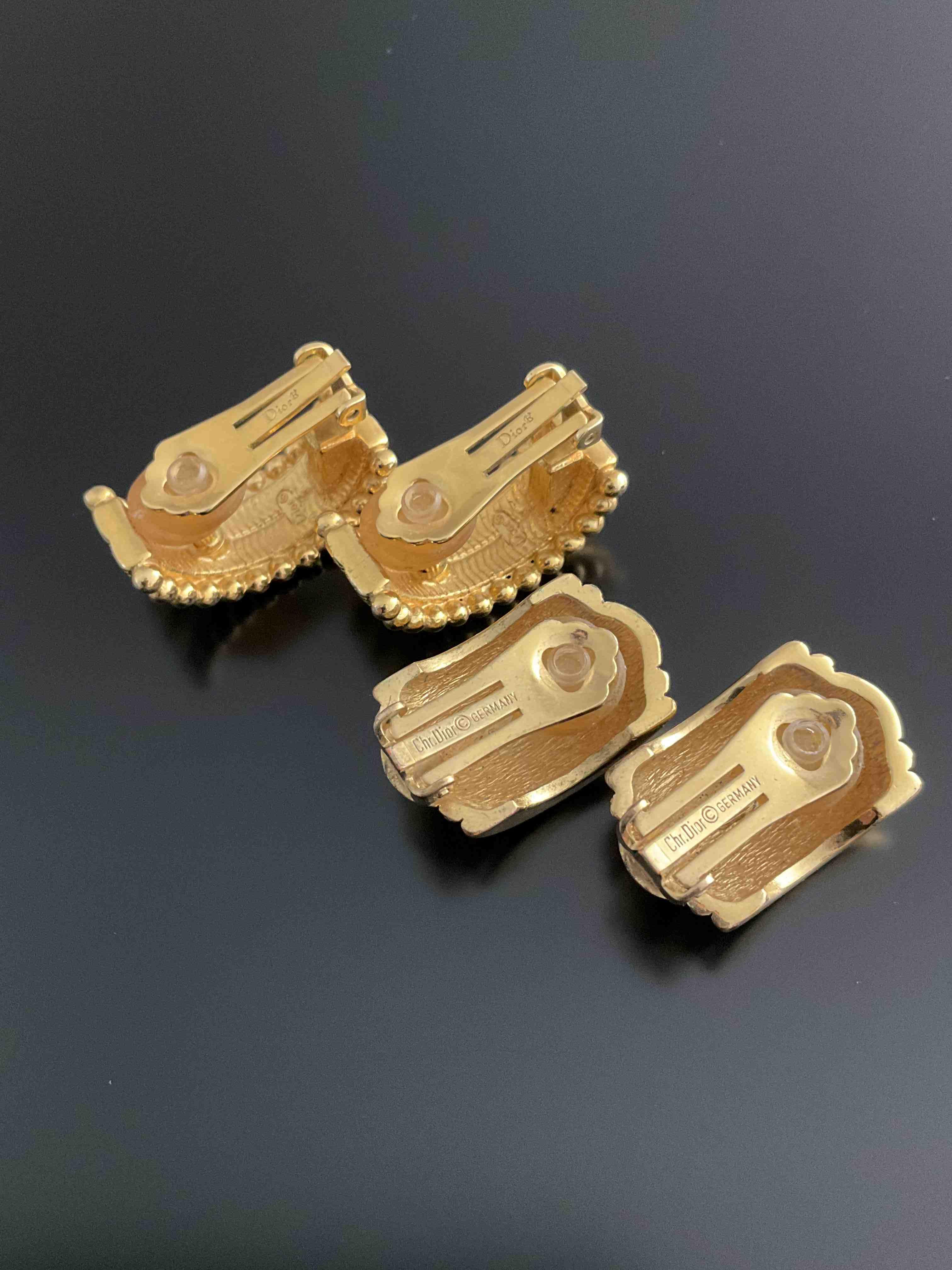 DIOR. DEUX PAIRES DE CLIPS D'OREILLES en métal doré. L'un à décor de rangs de perles et ondes, l'autre de câbles.
