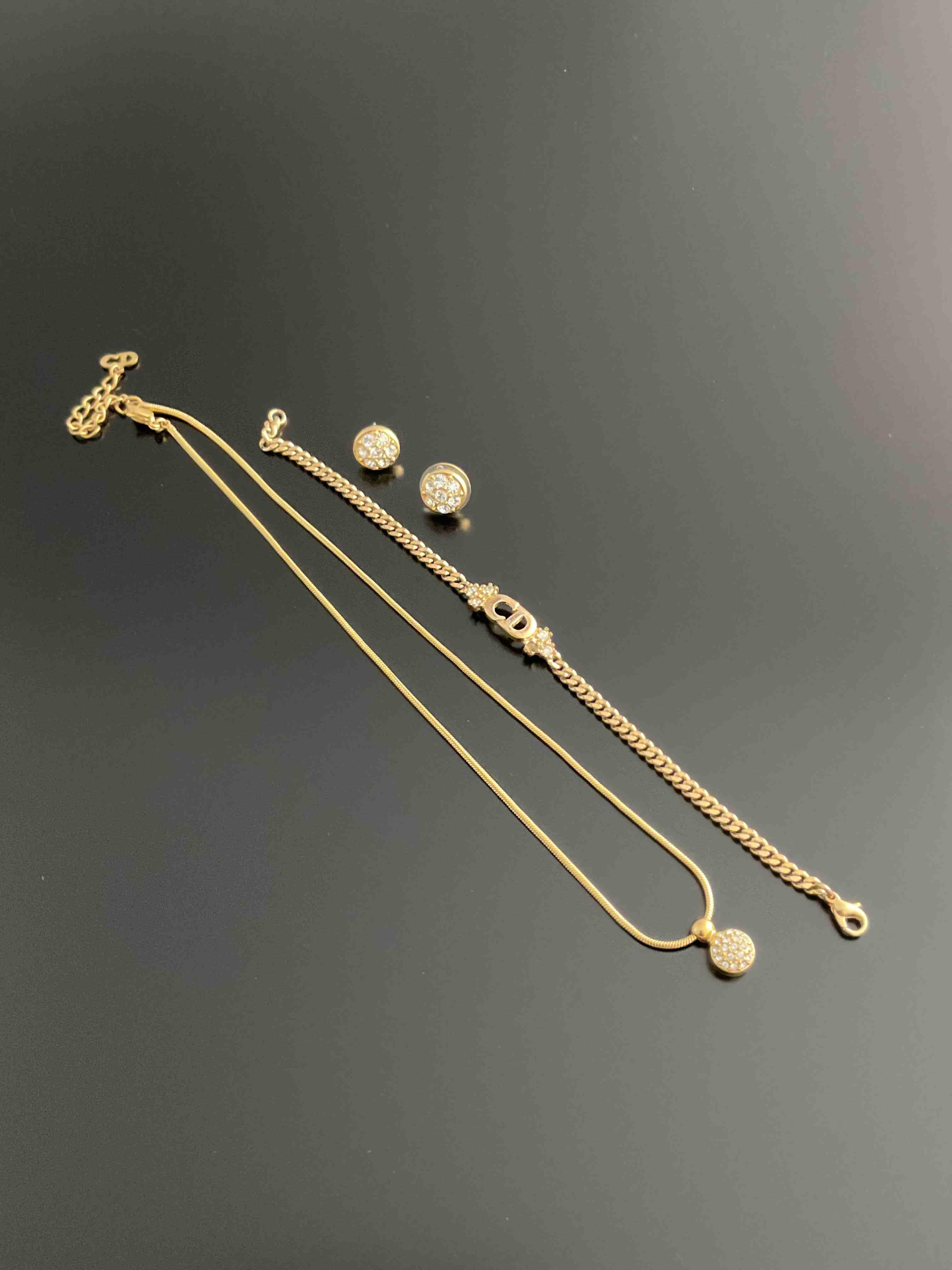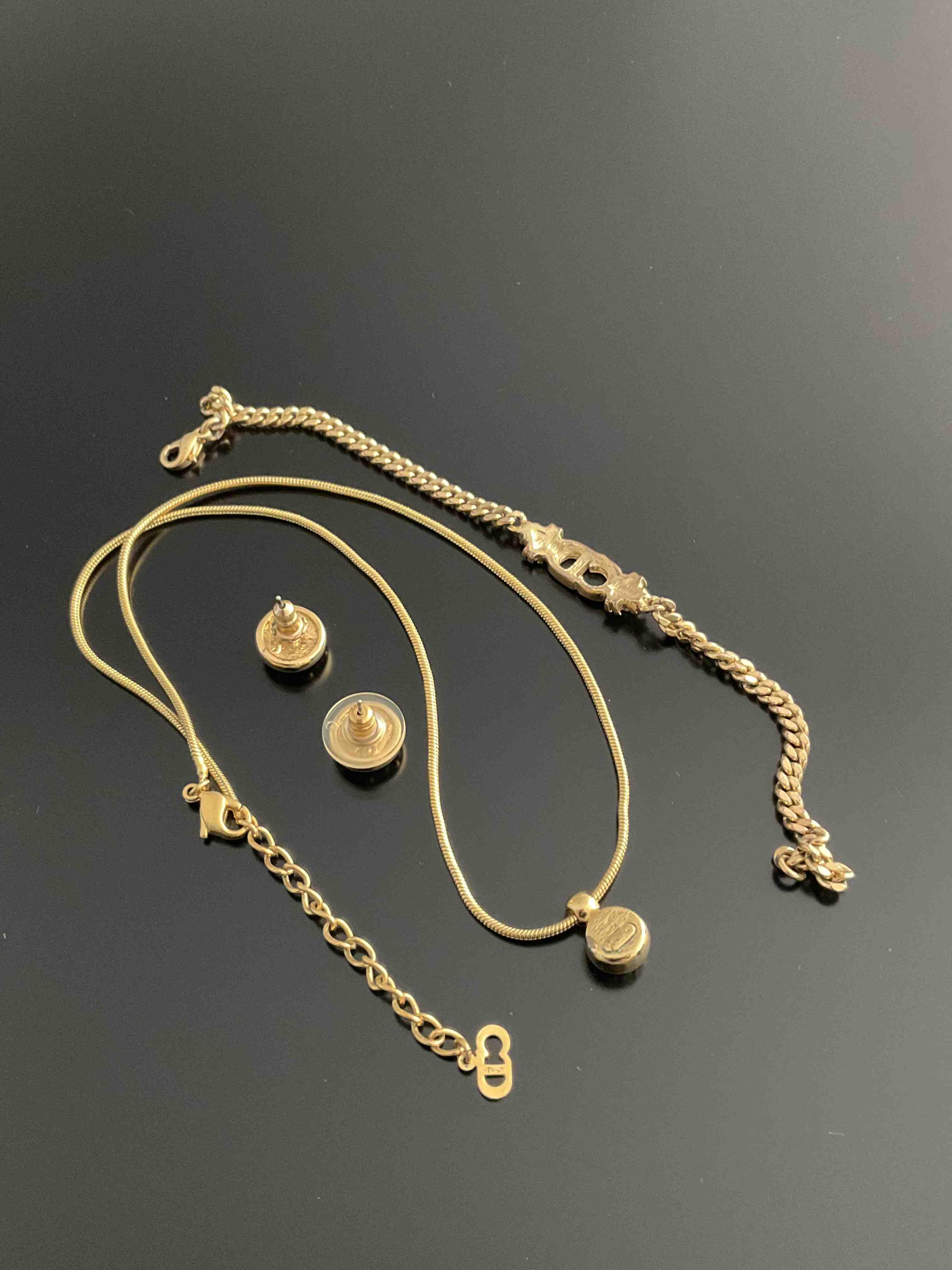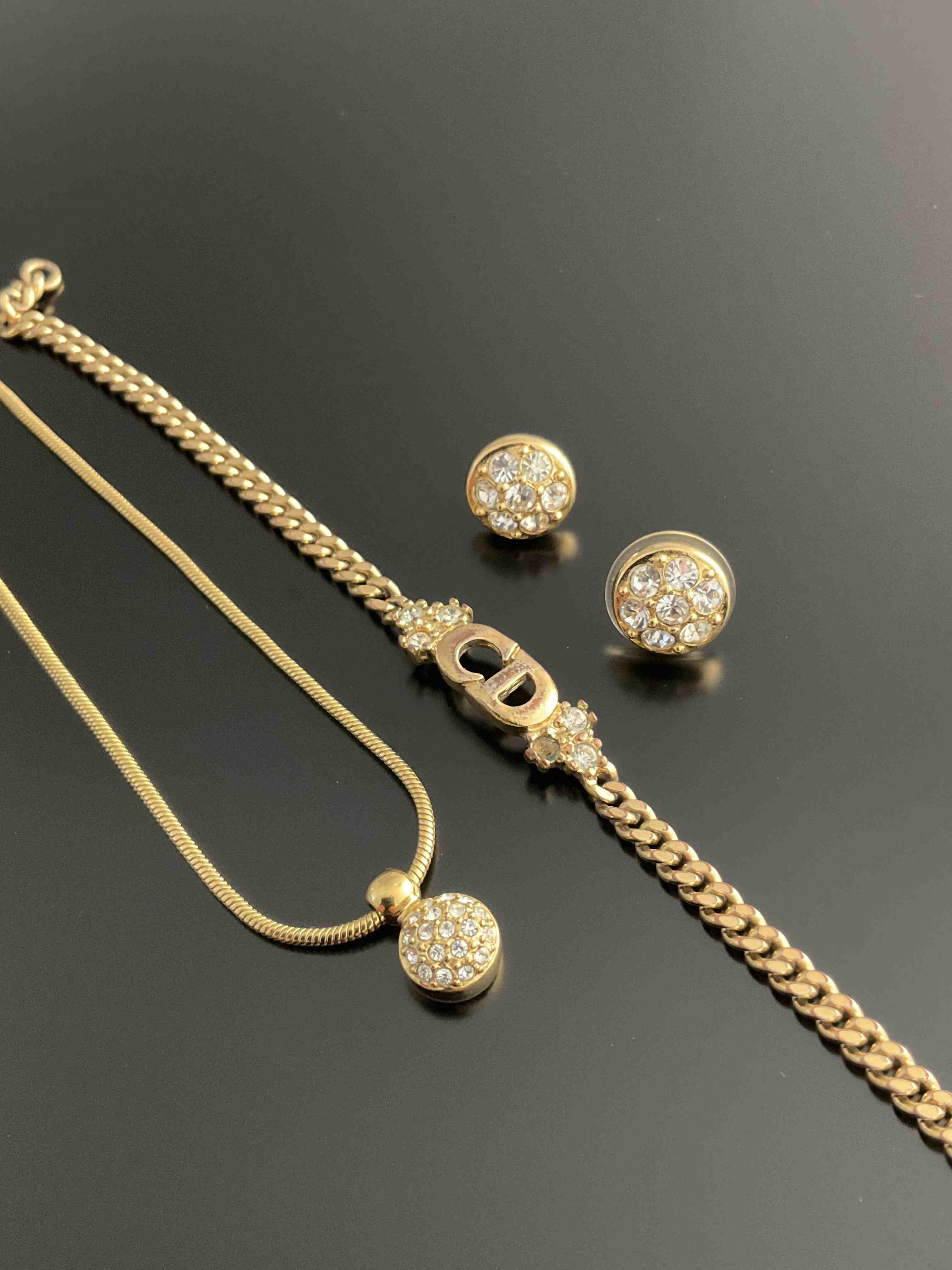 DIOR. PARURE en métal doré et imitations de diamants composée d'un COLLIER maille serpent retenant un pendentif hémisphérique et d'une PAIRE de CLOUS D'OREILLES au même motif.