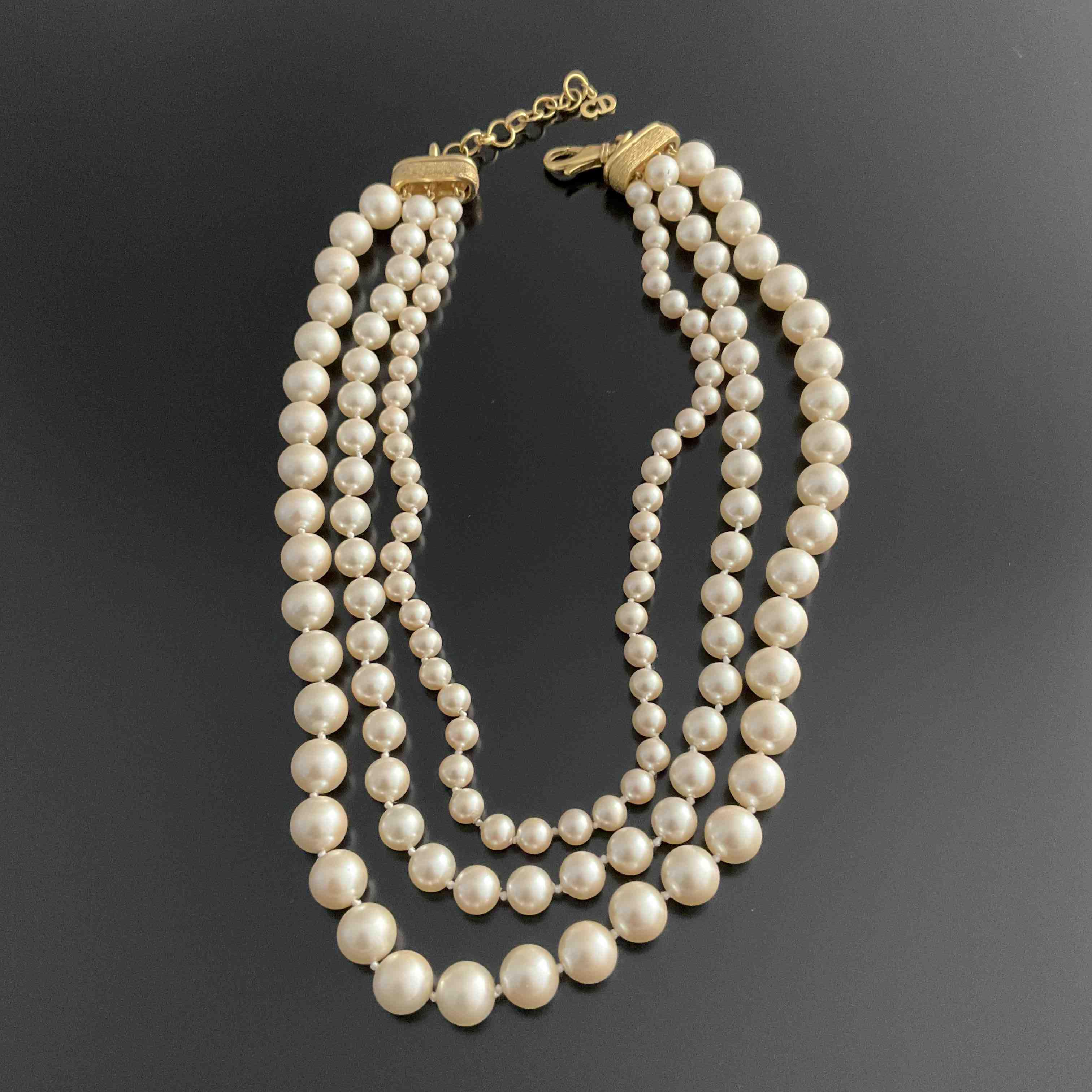 DIOR. COLLIER TROIX RANGS choker de PERLES blanches (de Majorque ?) de trois diamètres différents. Monture et fermoir en métal doré.